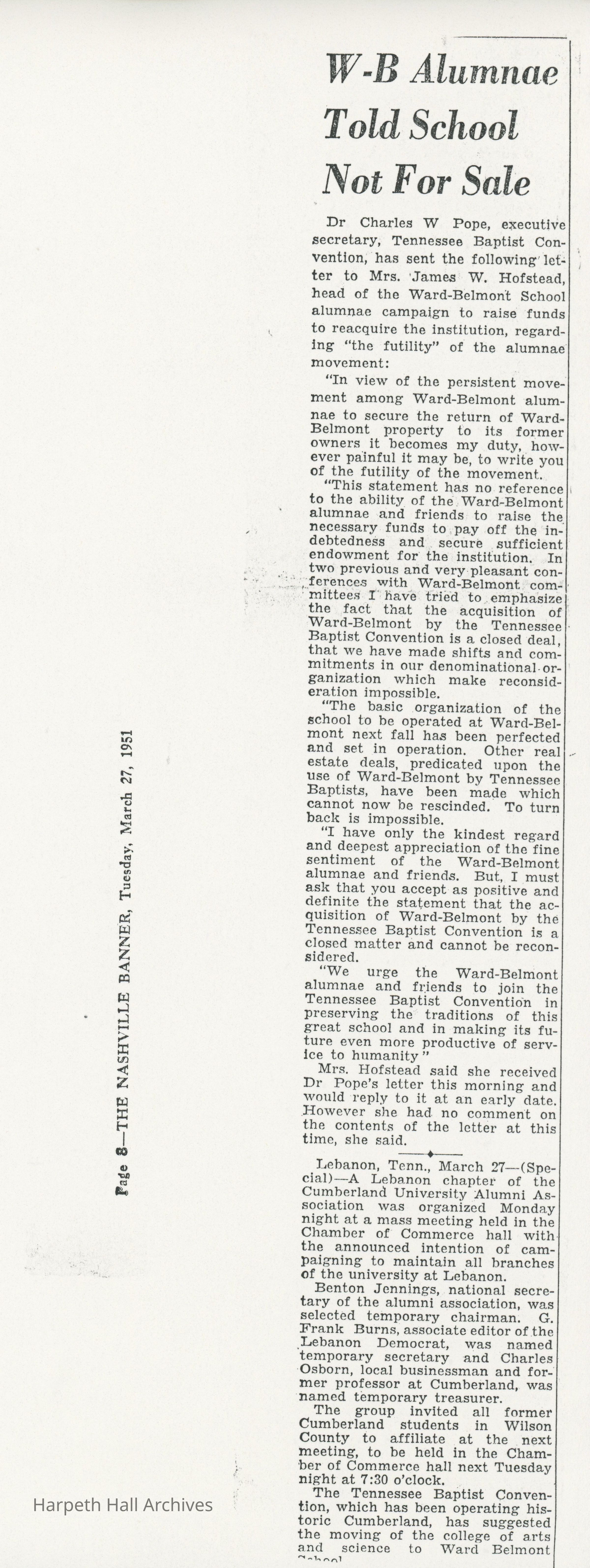 "W-B Alumnae Told School Not For Sale." The article publishes a letter that TBC Exec Dr. Pope sent to Mrs. Hofstead, the head Ward-Belmont's Alumnae Fund campaign. Alumnae were hoping to raise enough money to purchase the school back from the TBC, but Dr. Pope notes that the Baptists' purchase is a closed one, and that their plans of reestablishing Ward-Belmont as a Baptist school have already been set in motion.Collection