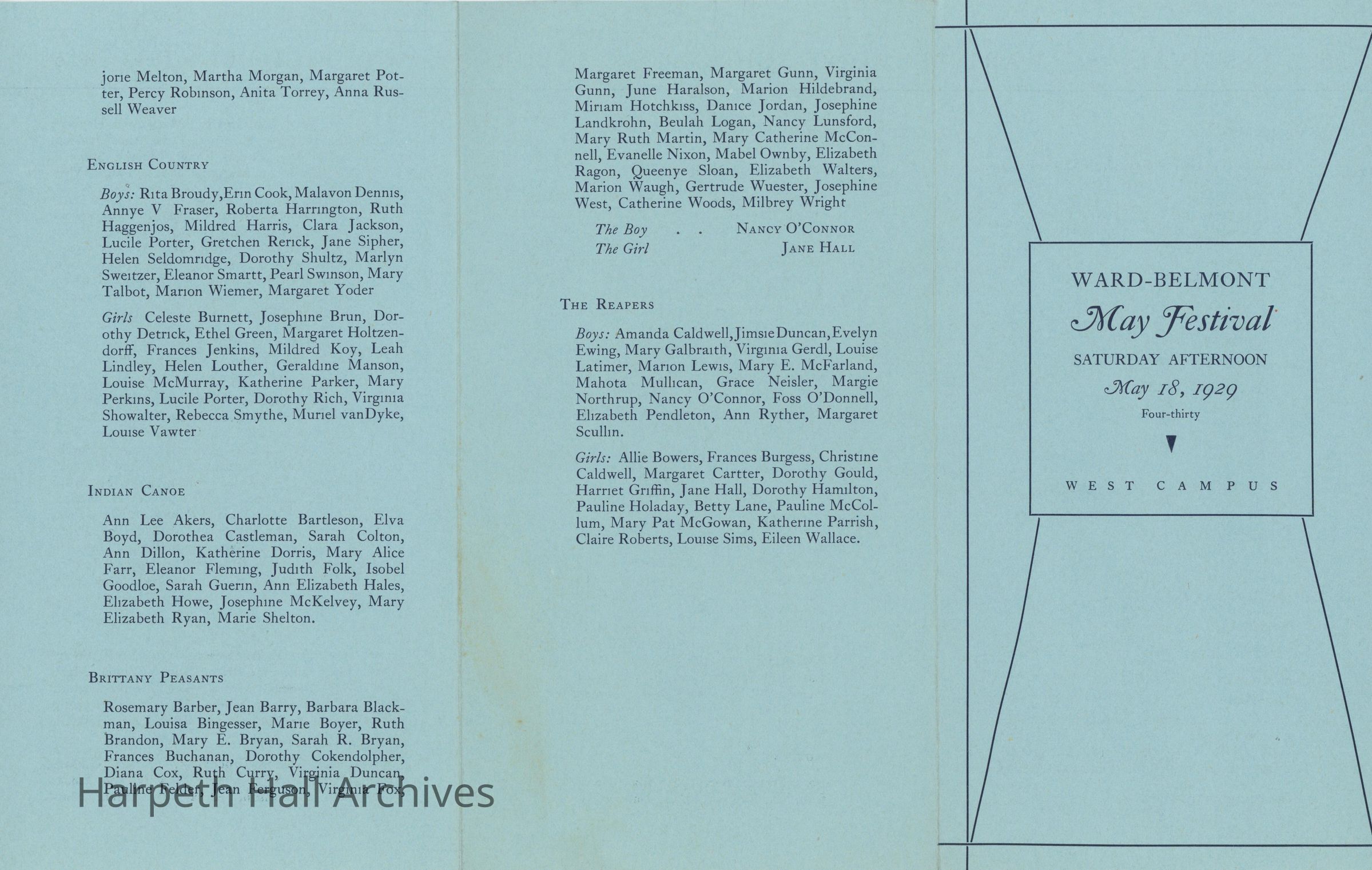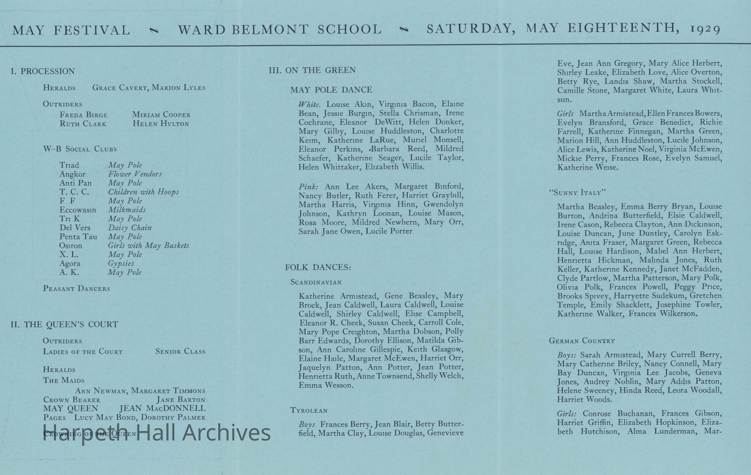 A program for the 1929 Ward-Belmont May Festival. Held on the West Campus on Saturday, May 18, 1929, at 4:30 P.M. The program consisted of three parts: a procession, the presentation of the May Queen and her court, and the May Pole Dance and folk dances on the green. The 1929 May Queen was Jean MacDonnell.Context