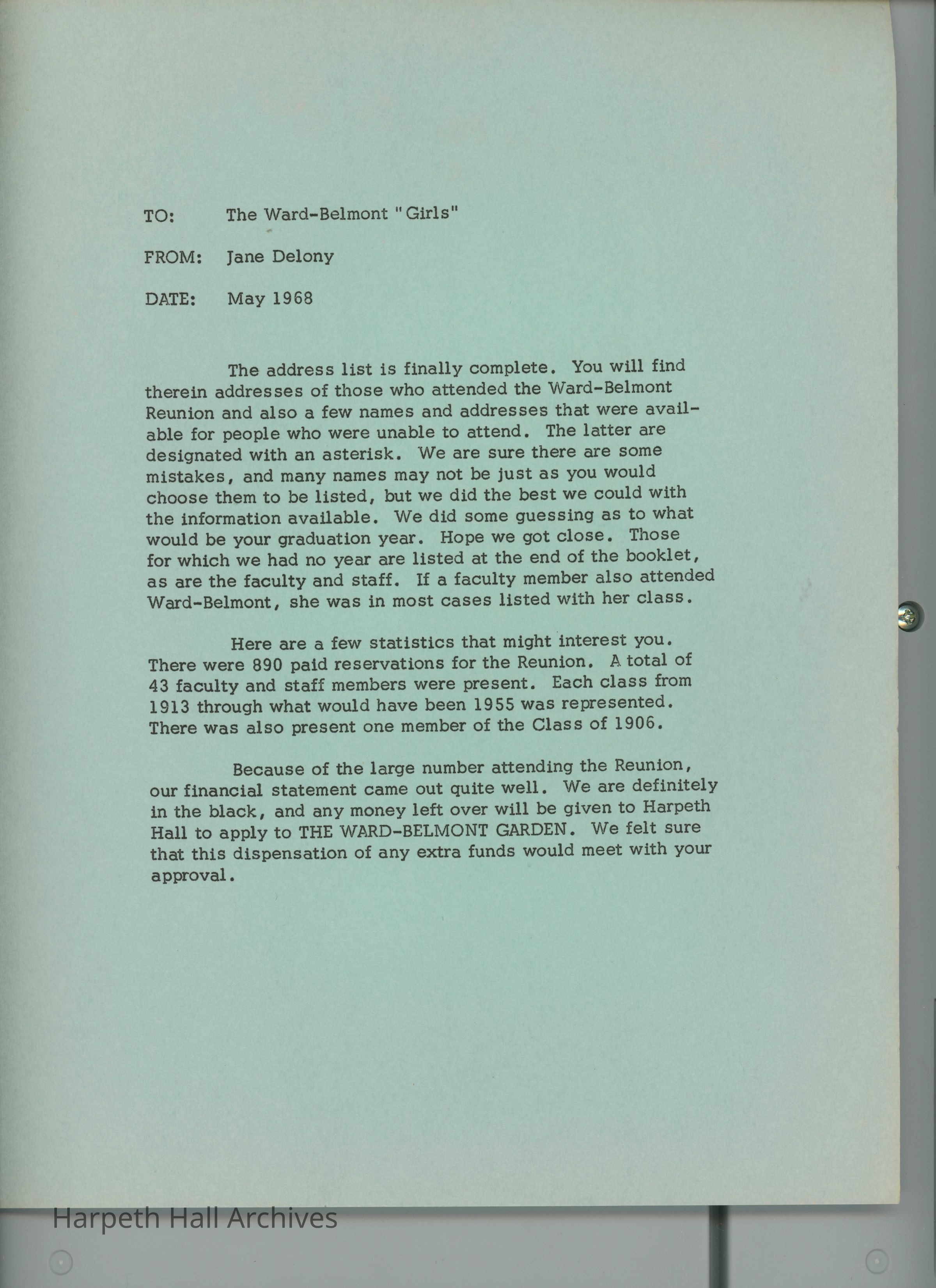 Letter from Jane Delony to Ward-Belmont Reunion Attendees