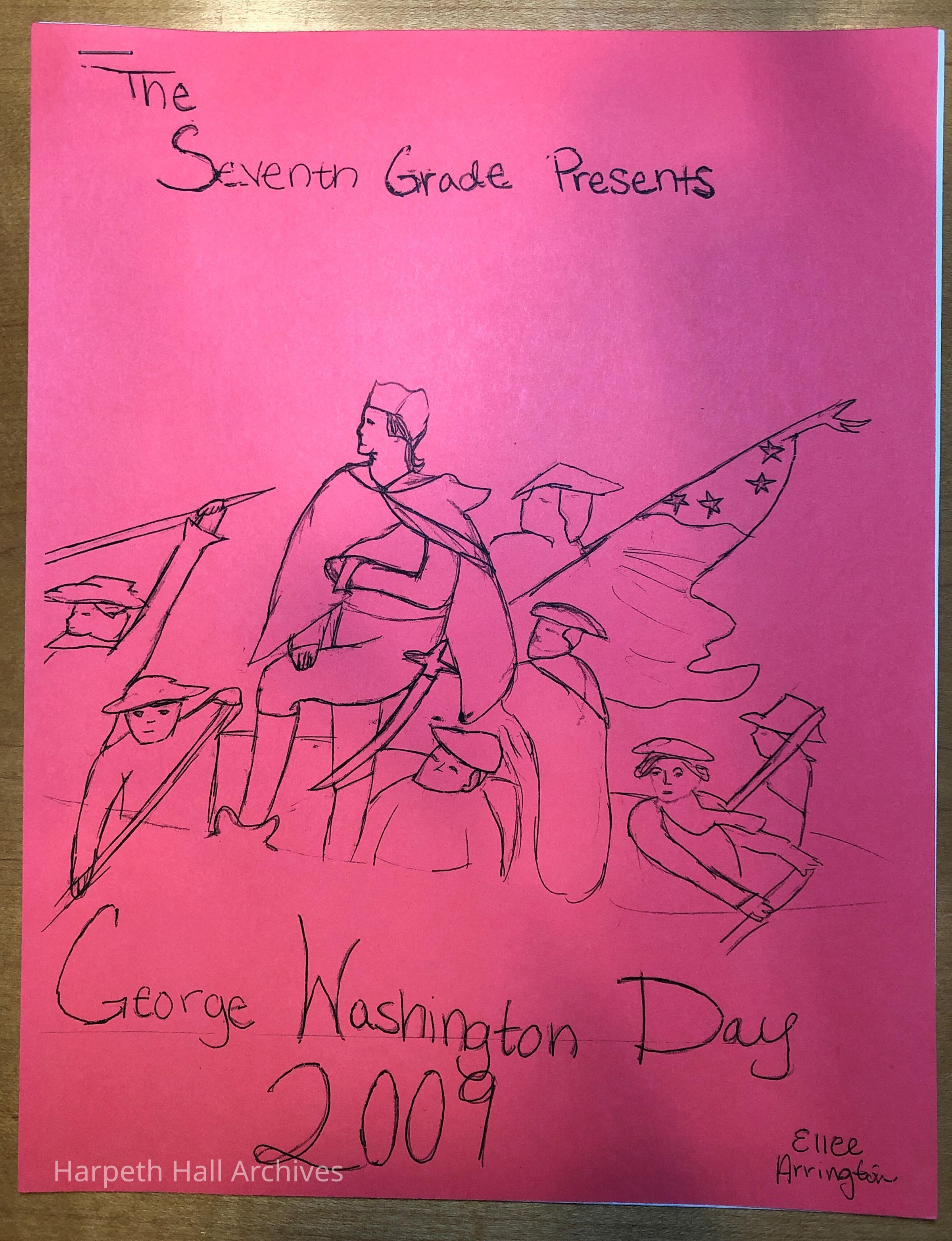 The 2009 program for the George Washington Day Celebration put on by the class of 2014 when they were in the seventh grade. The celebration was dedicated to Molly Rumsey. George Washington was played by eighth grader Sarah Hill (2013) and Martha Washington was played by eighth grader Margaret "Maggie" Rutherford Riser (2013). Front cover design by Elizabeth "Ellee" Arrington.Context