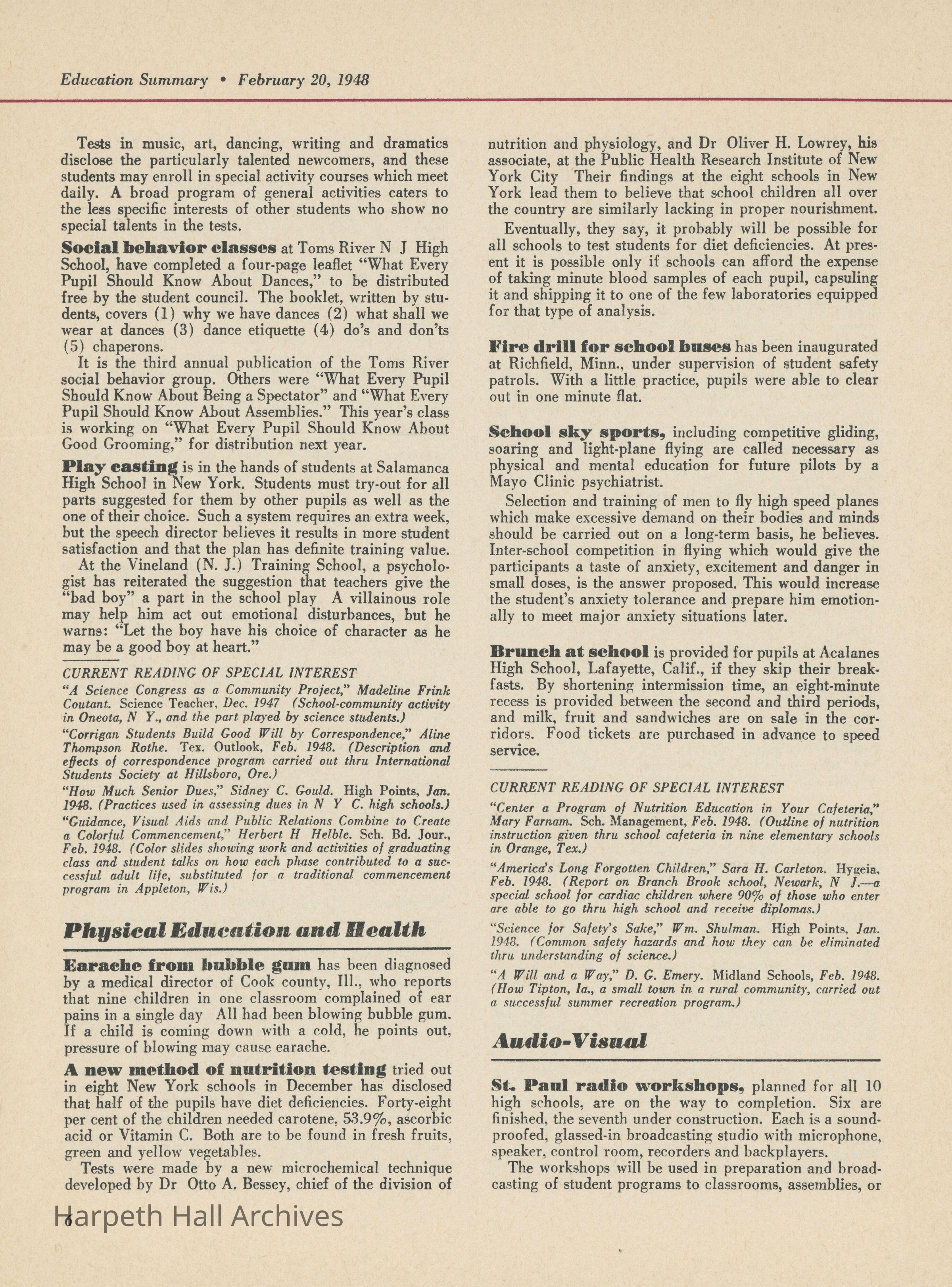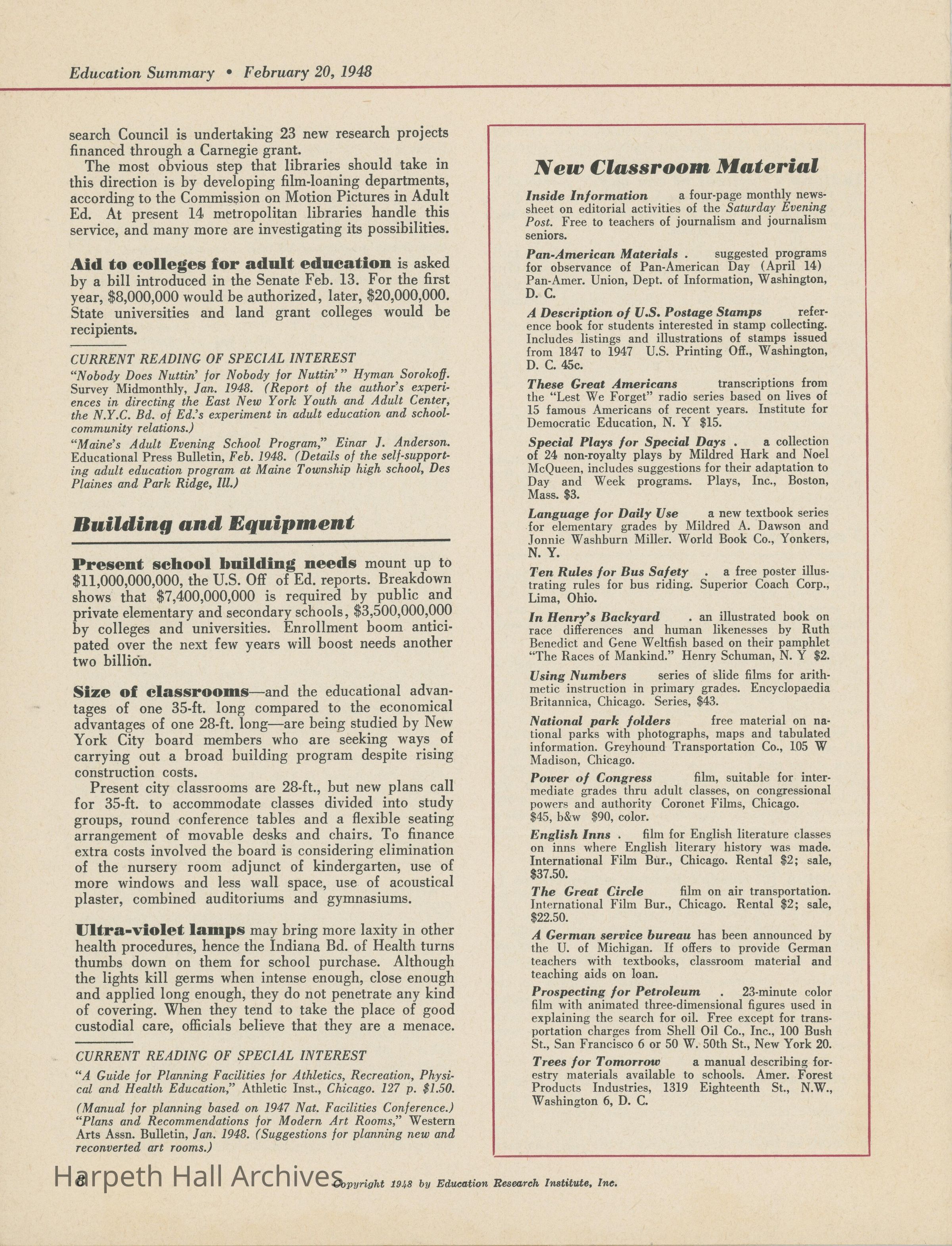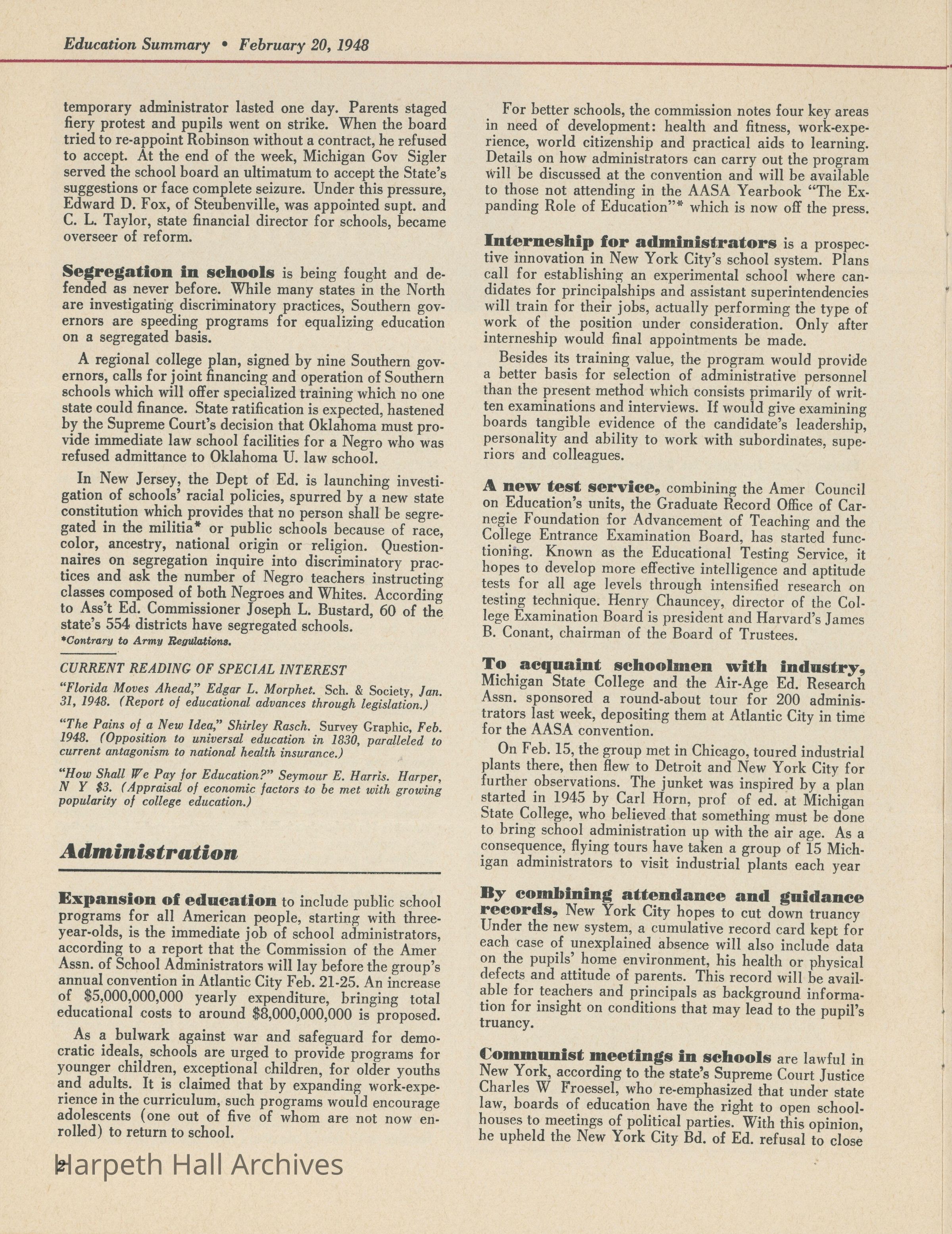 A semi-monthly report on new developments, trends, ideas, and research in education. The Education summary is dated February 20th, 1948.Collection
