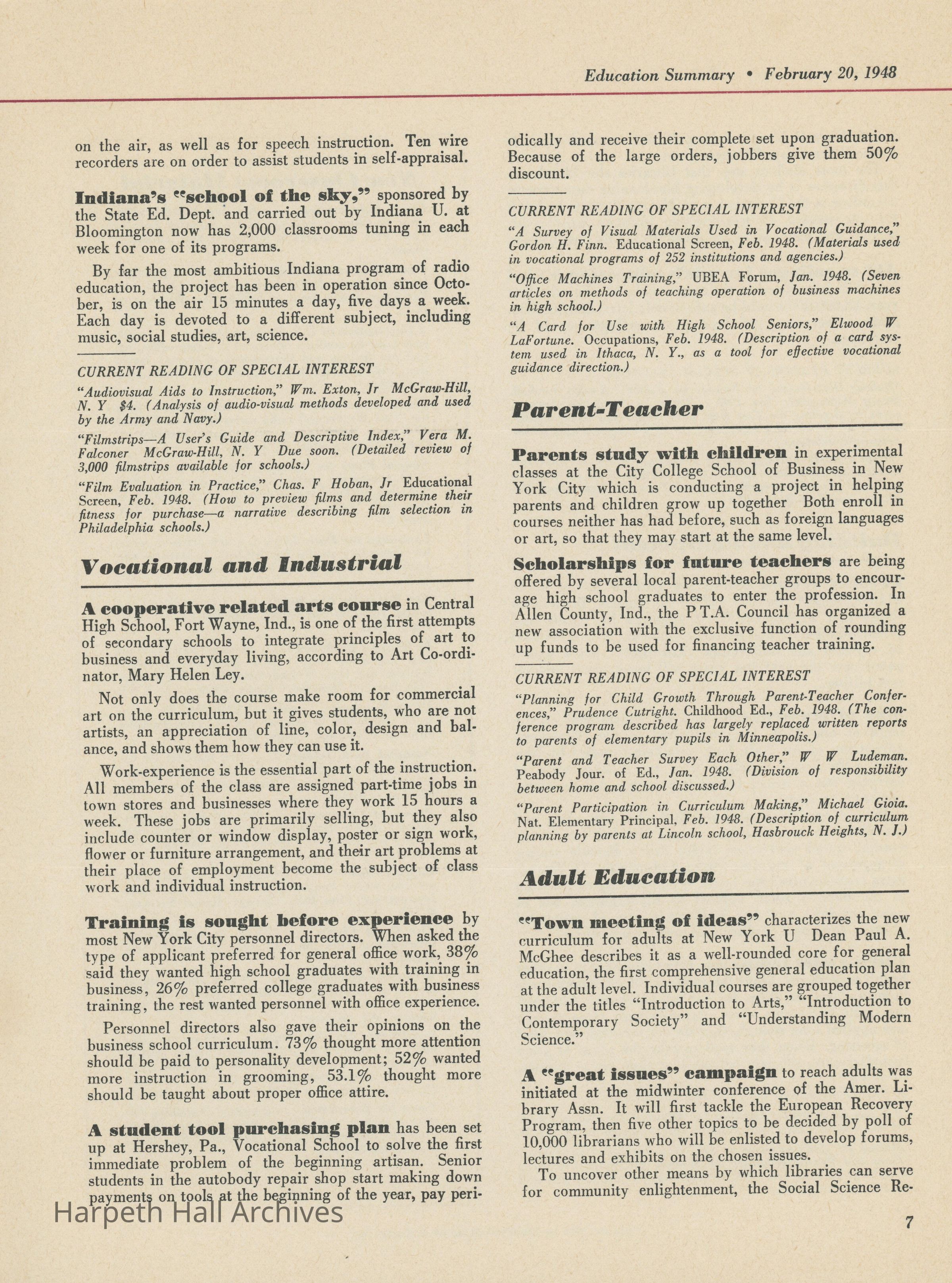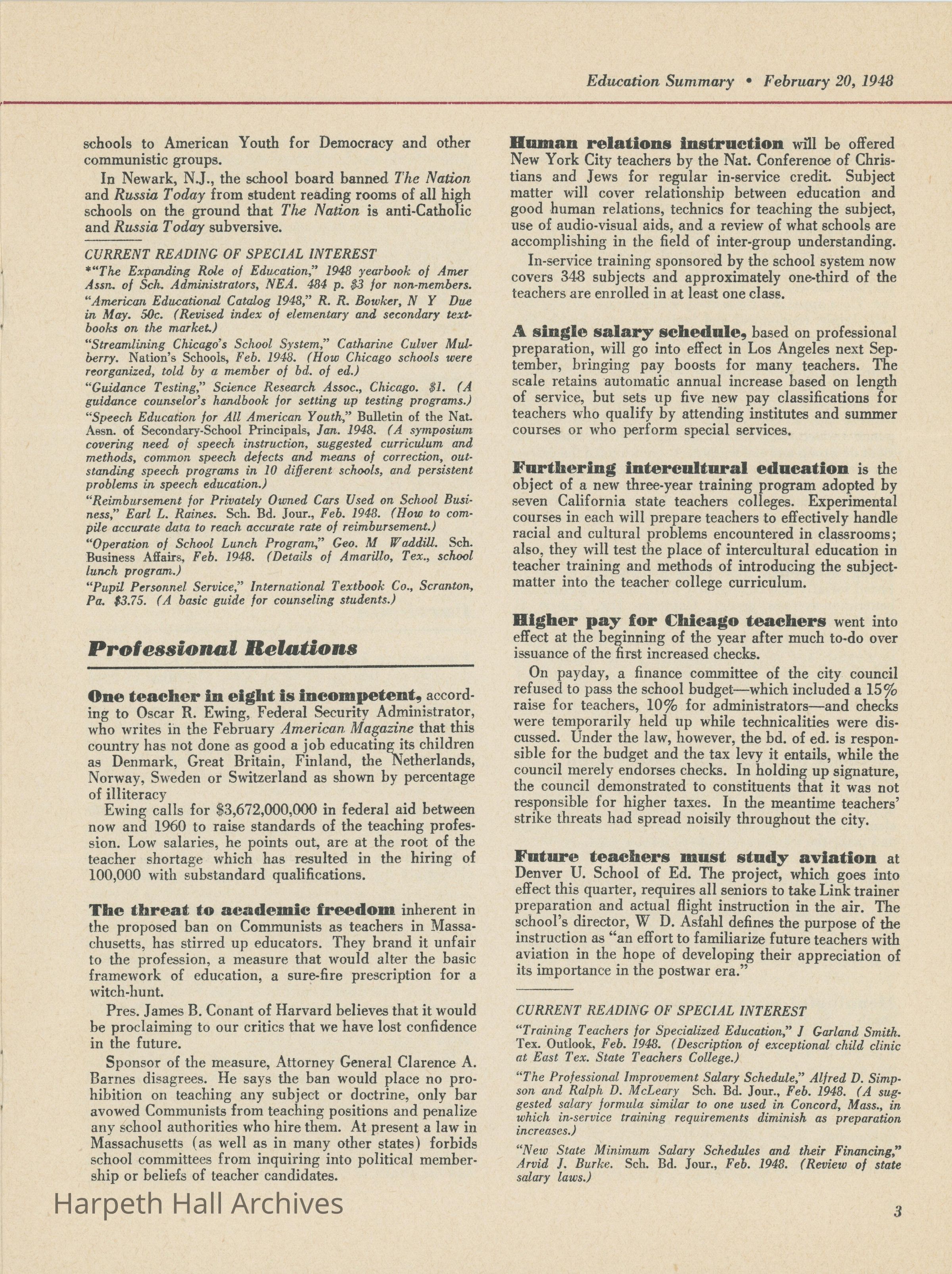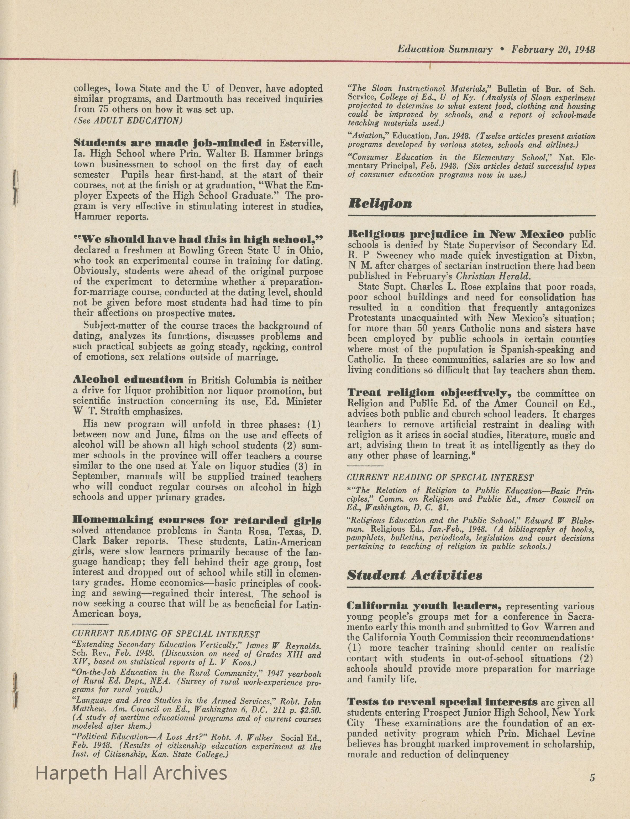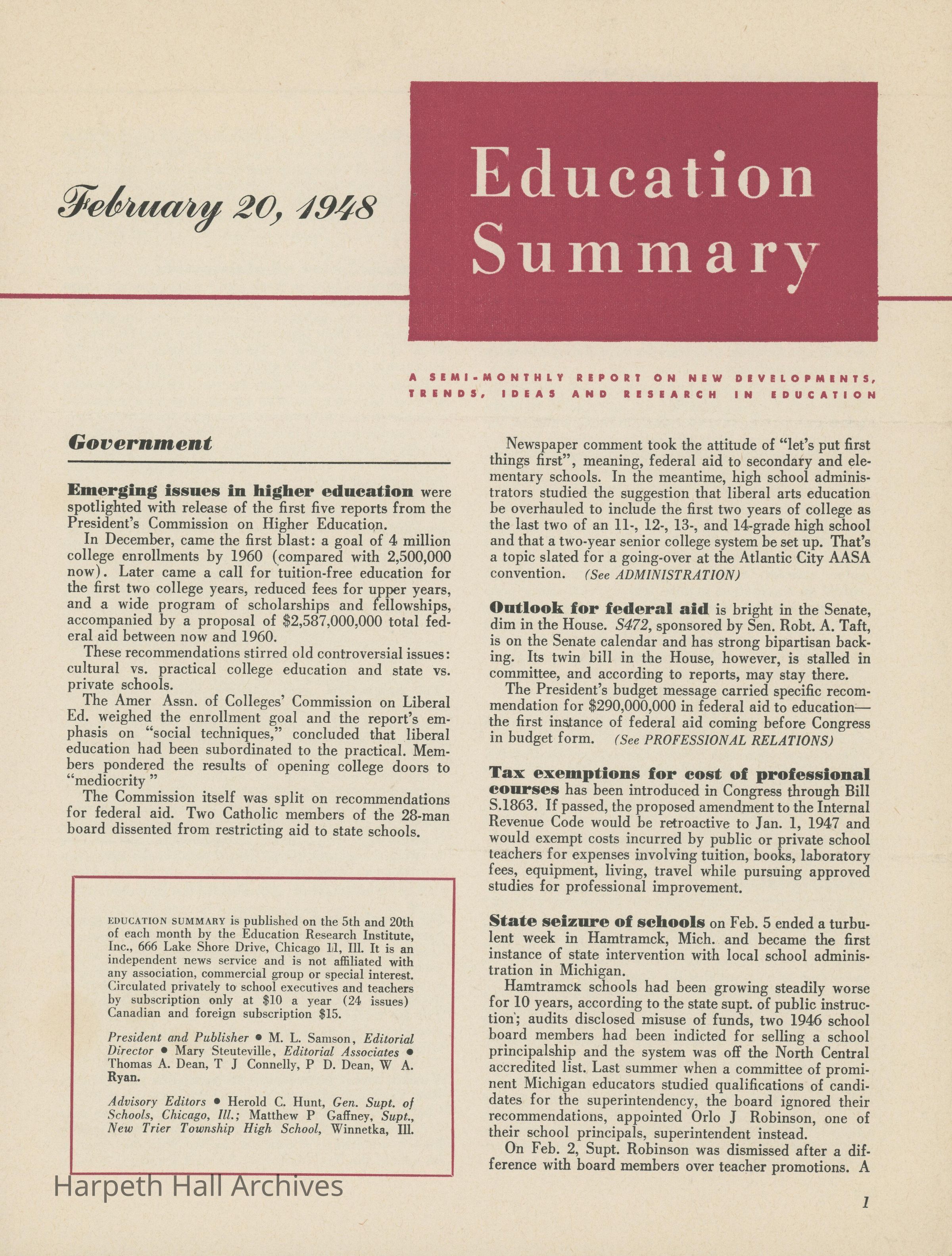A semi-monthly report on new developments, trends, ideas, and research in education. The Education summary is dated February 20th, 1948.Collection