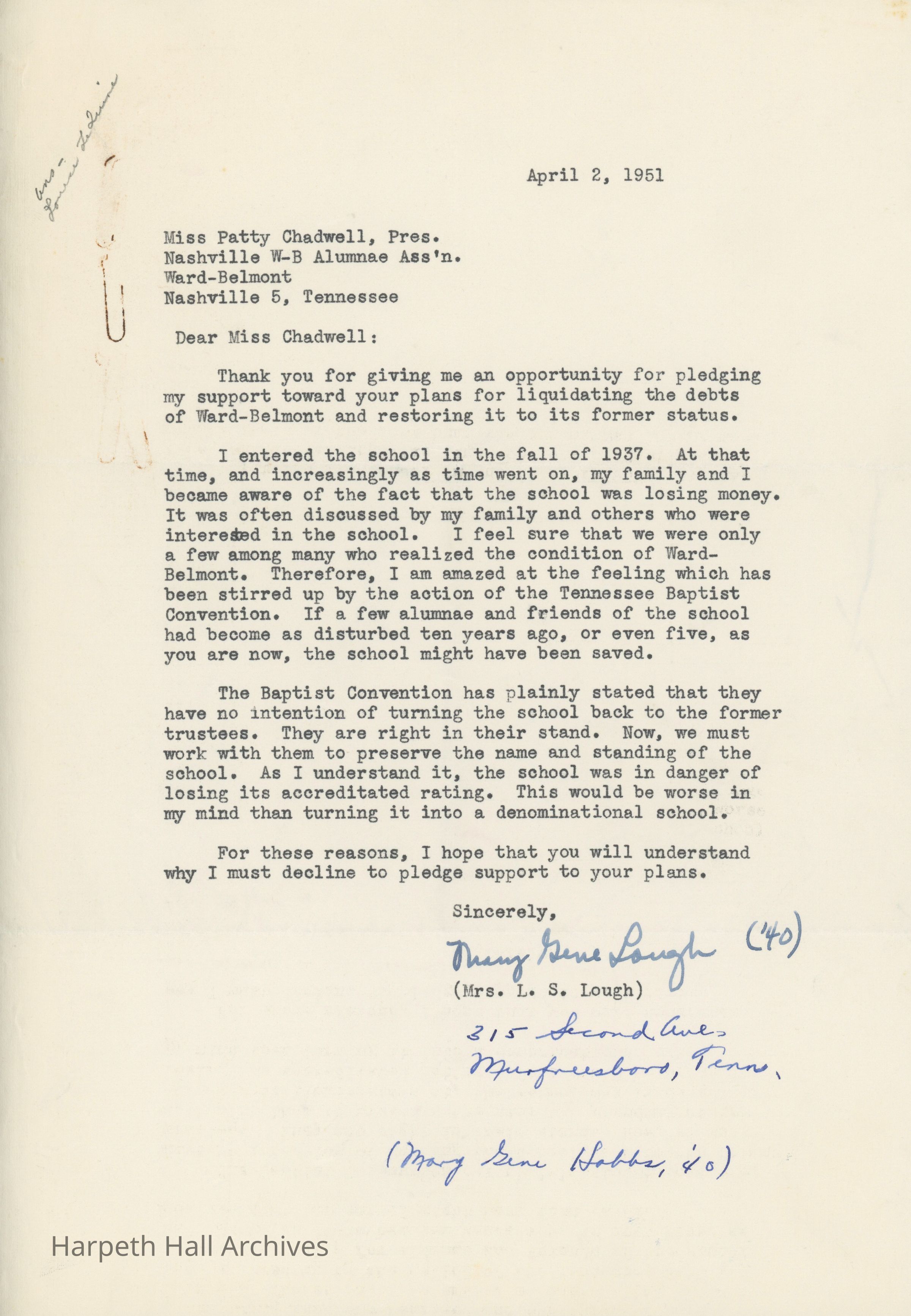 A letter from alumna Nancy Lough '40 who declines to contribute to the Alumnae Fund that Patty Chadwell is leading. Nancy notes that she and her family were well award of Ward-Belmont's financial status for years, and that the change in ownership might not be a bad thing if it means Ward-Belmont is able to stay operational as an accredited school.Collection