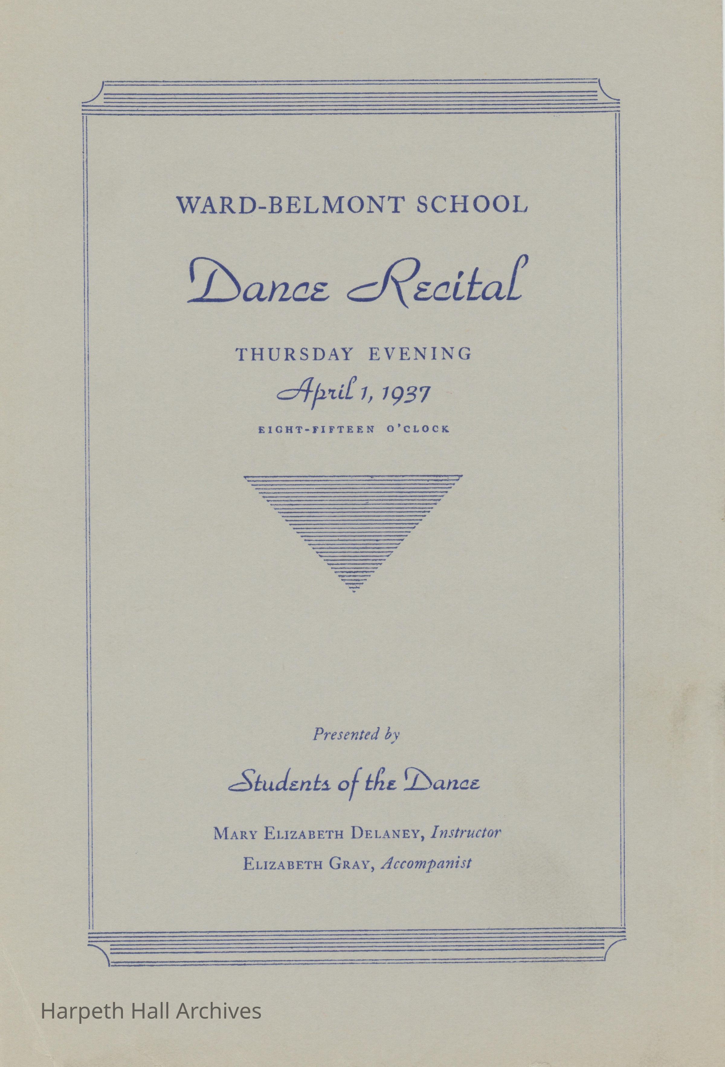 A program for a Ward-Belmont school dance recital held on Thursday evening, April 1, 1937, at 8:15. Presented by Students of the Dance with Mary Elizabeth Delaney as instructor and Elizabeth Gray as accompanist. The recital consisted of 15 dances. The names of performers are listed in the program alongside their respective dance numbers.Context