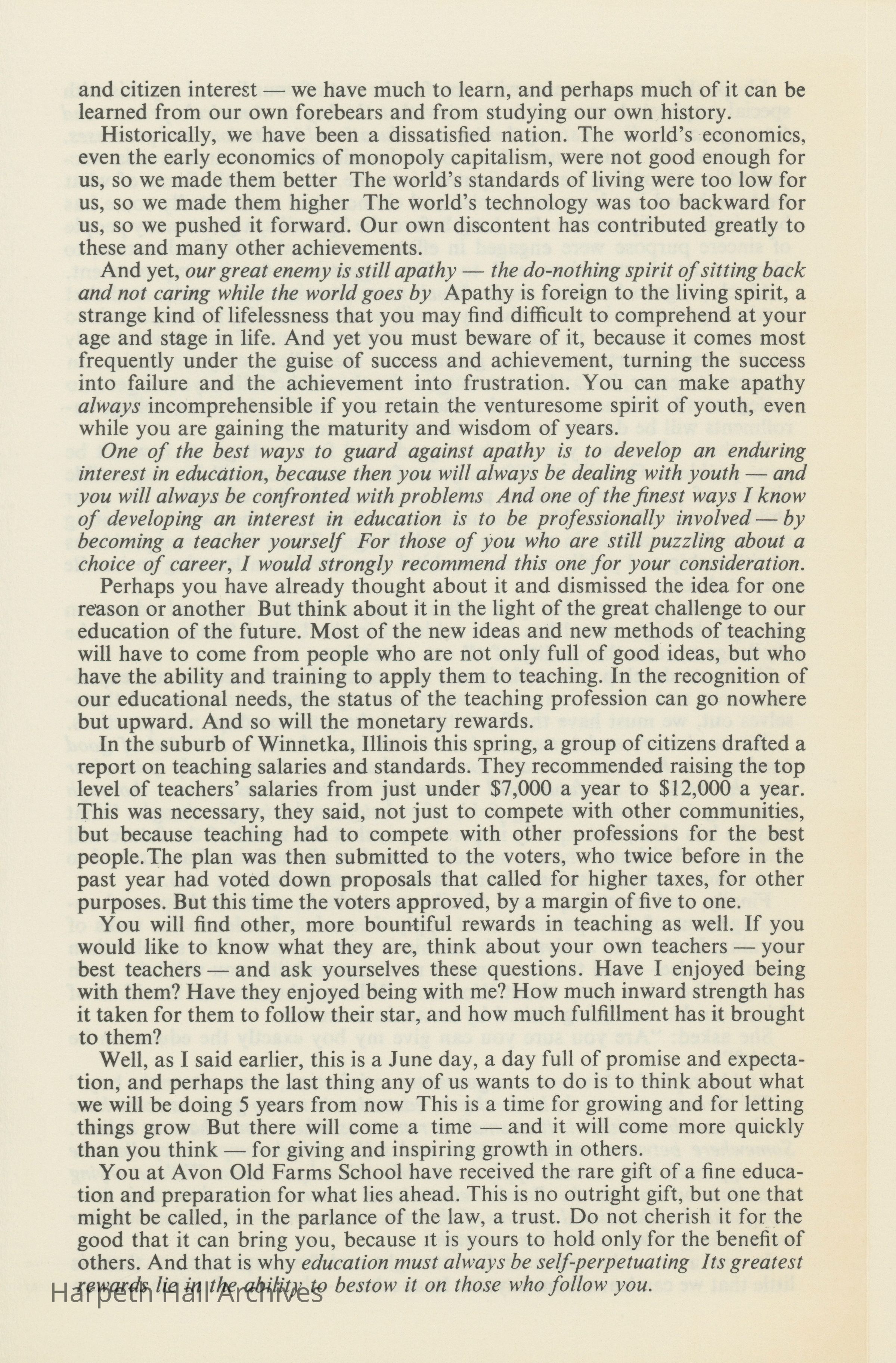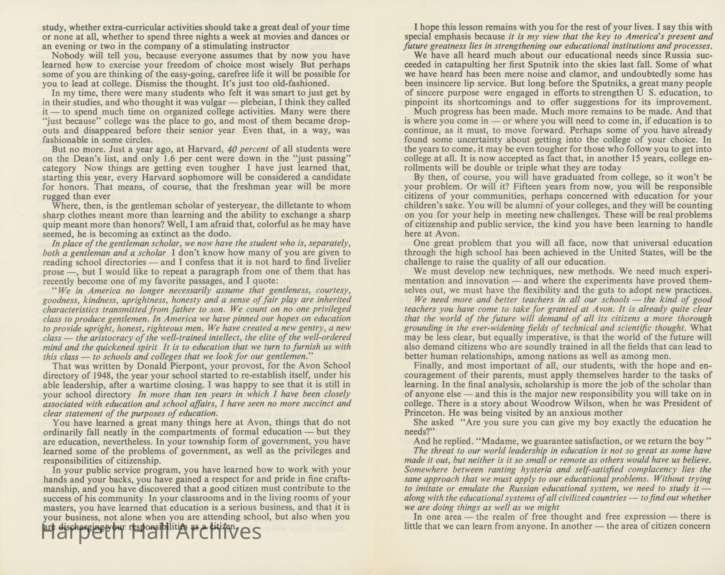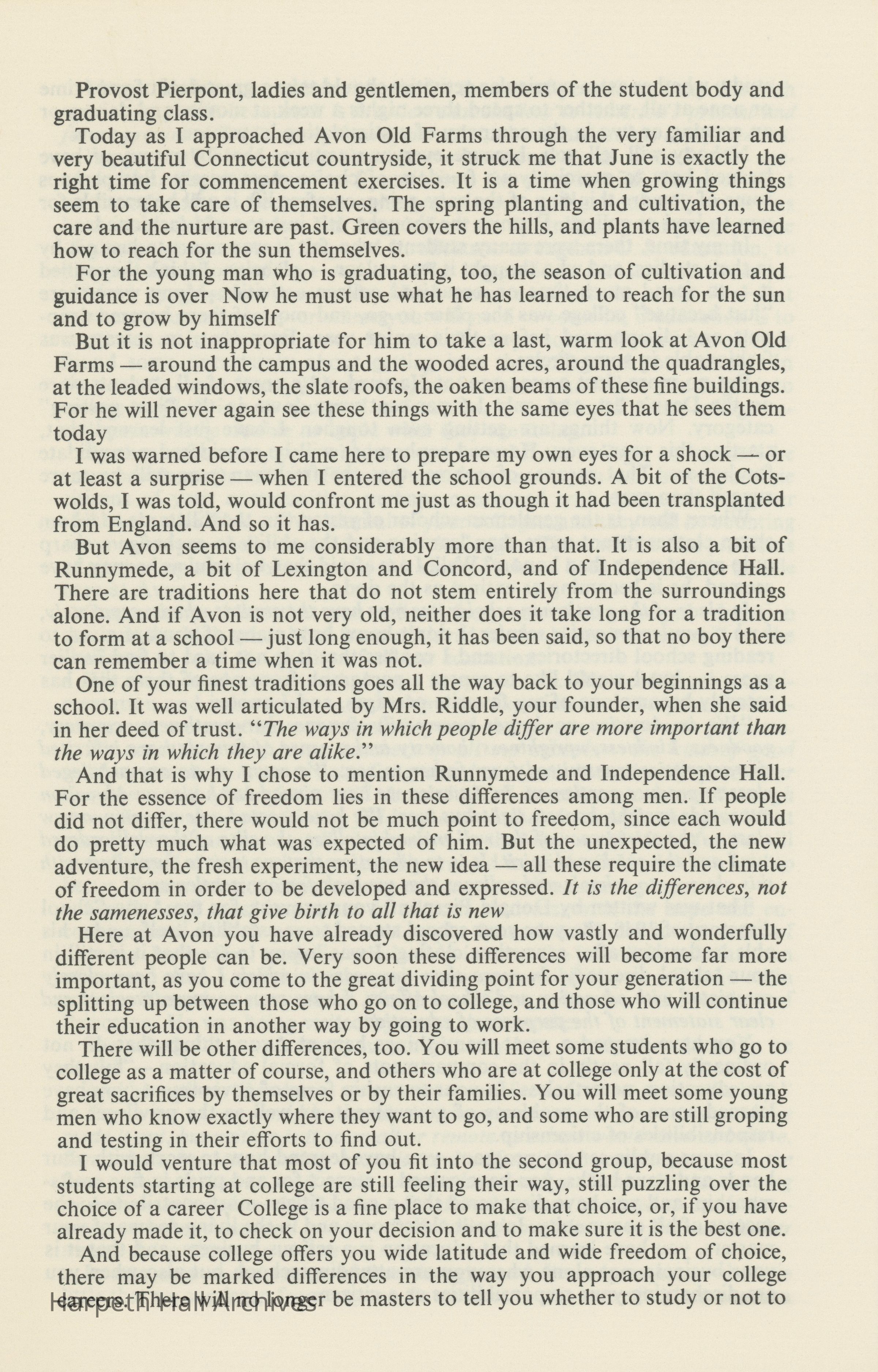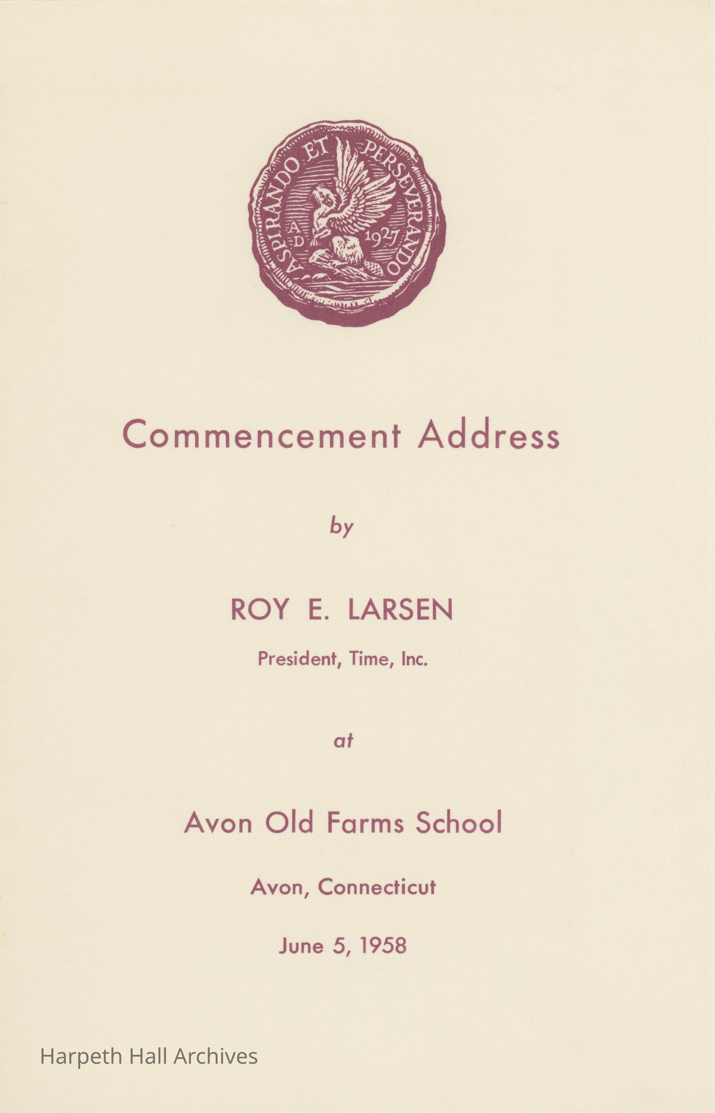 Printout of the commencement speech made by Roy E. Larsen, president of Time, Inc., at Avon Old Farms School in Avon, Connecticut.Collection