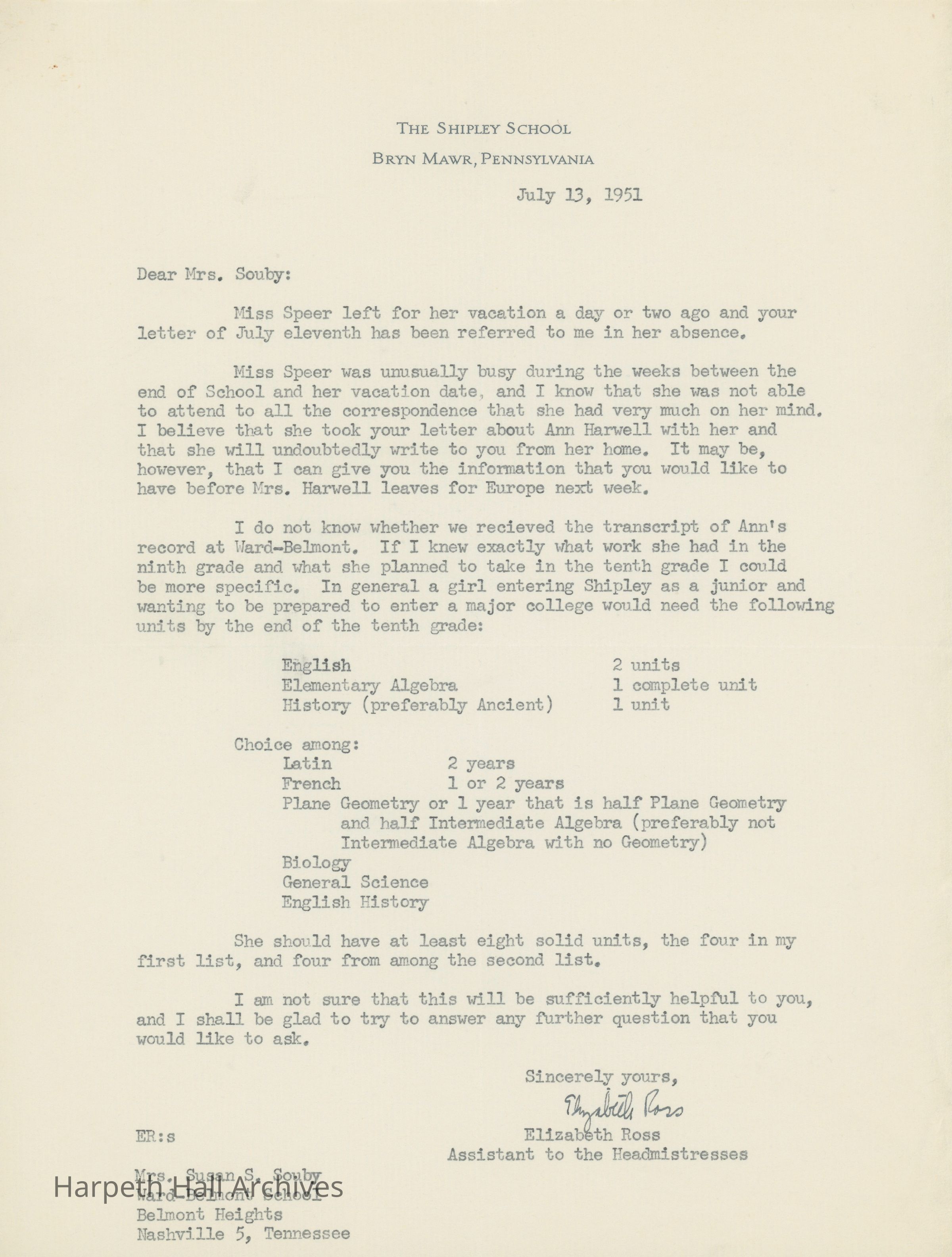 A letter to Susan Souby from the Headmistress Office of the Shipley School in Bryn Mawr, Pennsylvania. The letter outlines recommended courses for a student Ann Harwell who appears to be transferring or looking to transfer to the Shipley School for her junior year. Elizabeth Ross, the letter's writer, lists several classes Ann should take during her tenth grade year at Ward-Belmont to be successful at the Shipley School and to prepare for college.Collection