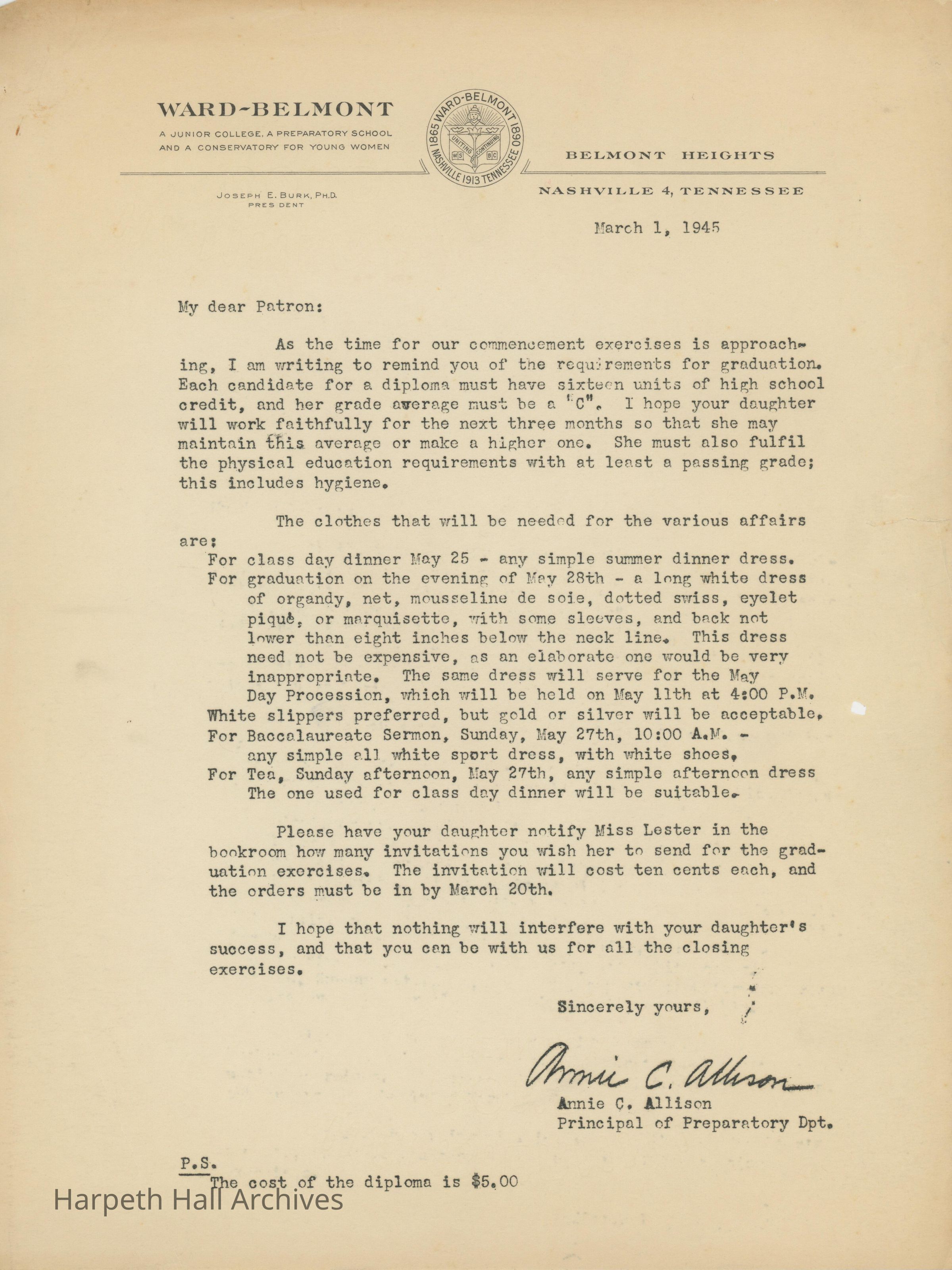 A letter from Annie C. Allison, Ward-Belmont High School Principal, to all prospective graduates regarding graduation requirements. The letter is dated March 1st, 1945.Collection