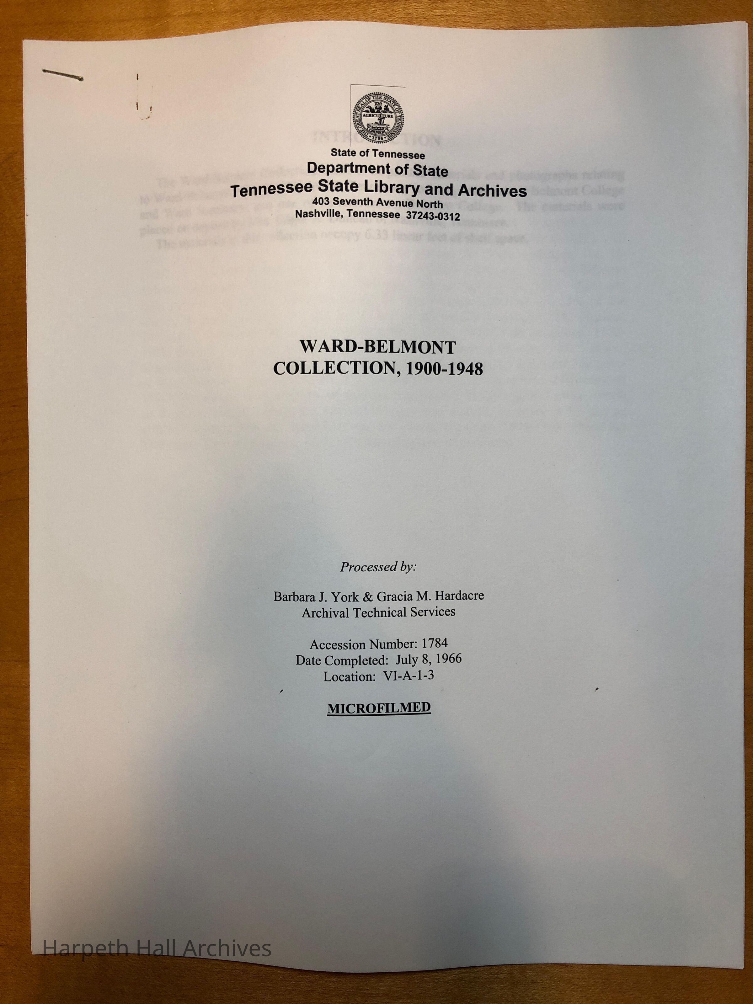 A detailed list of the Ward-Belmont Collection by the Tennessee State Library and Archives on July 8th, 1966.Collection