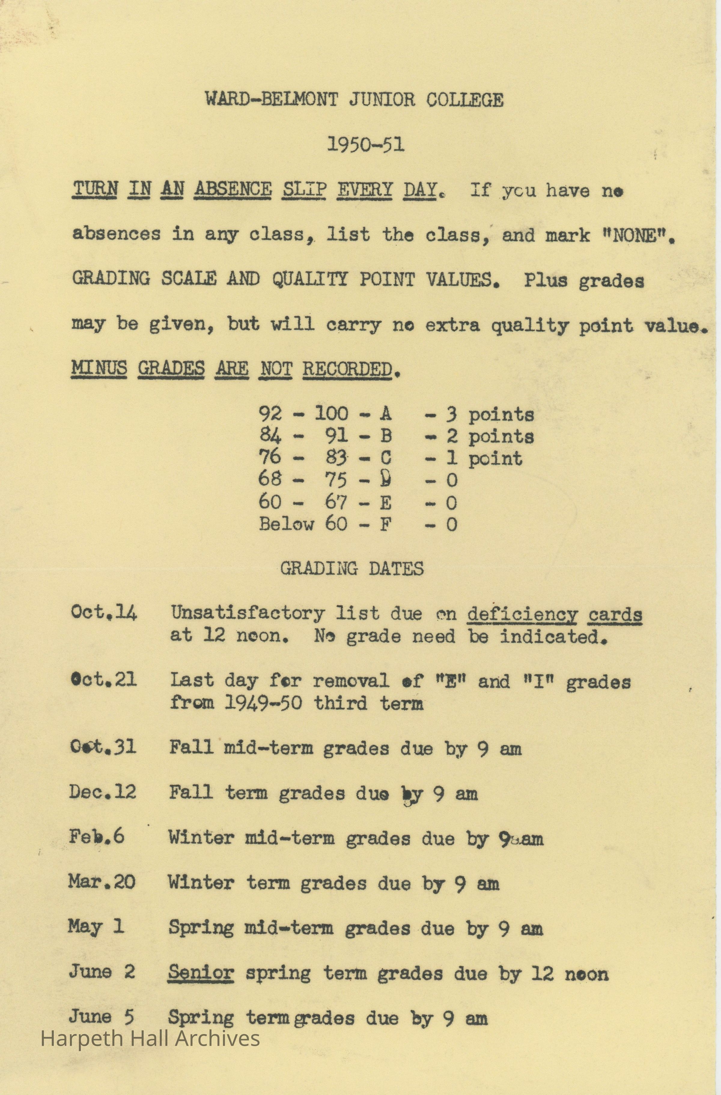 Ward-Belmont Junior College's grading scale and important dates for grading.