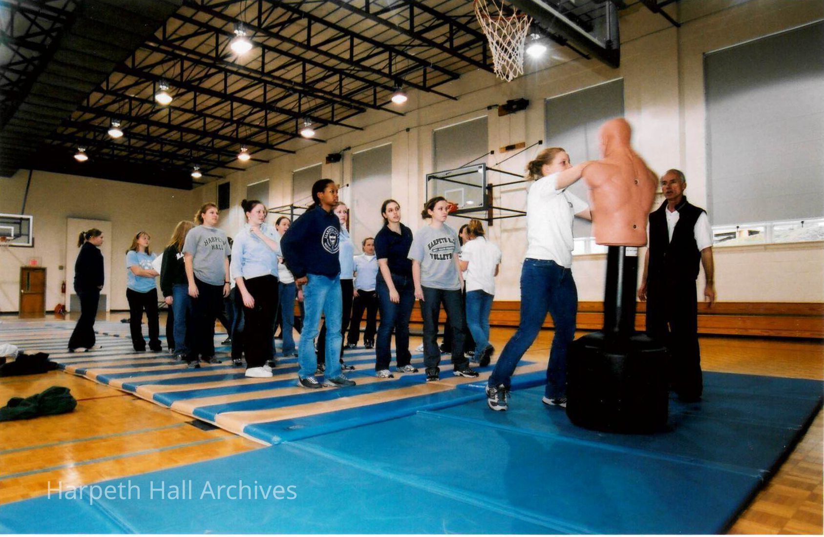 Students line up to demonstrate a skill in self-defense class, Winterim 2001.