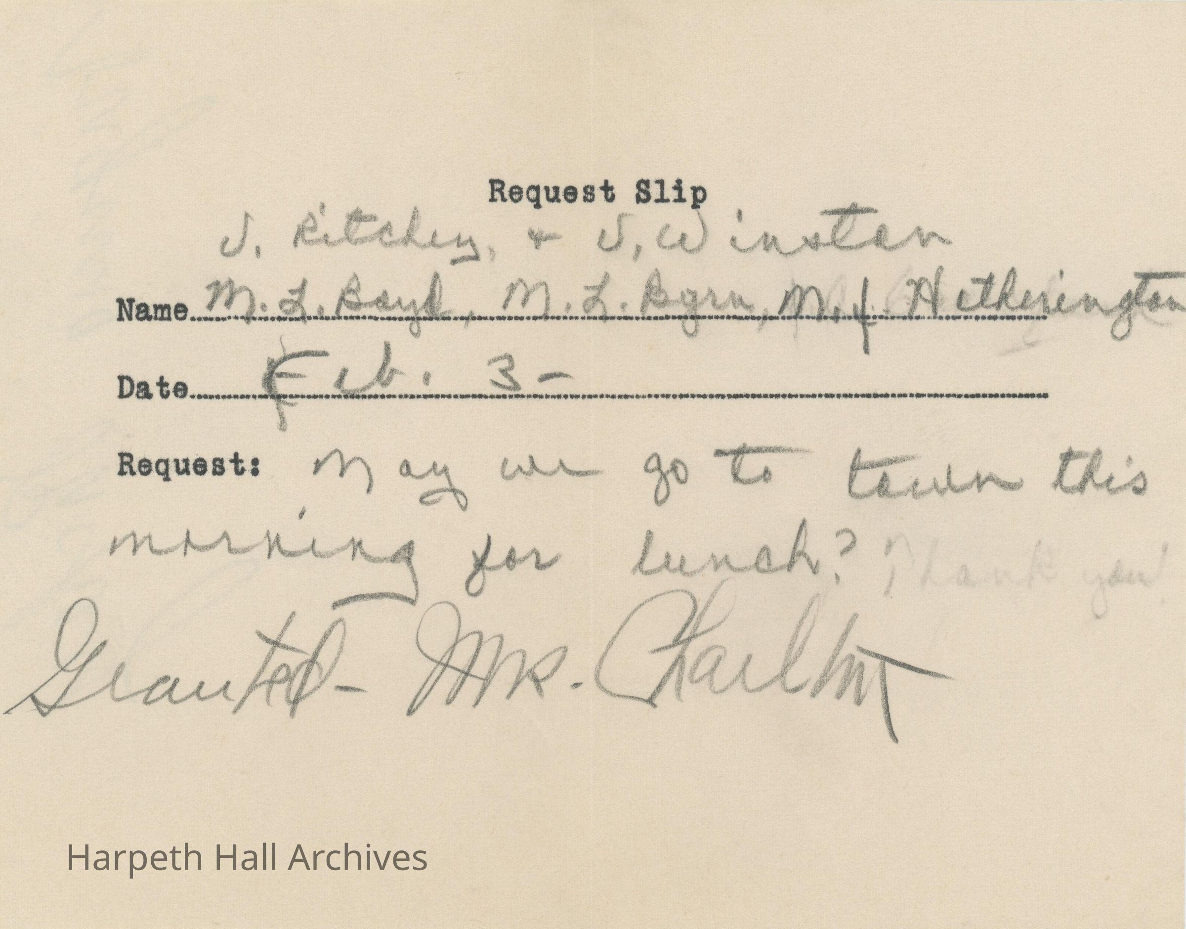 A request slip for 5 Ward-Belmont students to go to town for lunch on February 3rd. The request was granted. The name "Virginia Richey" is written on the back.Collection
