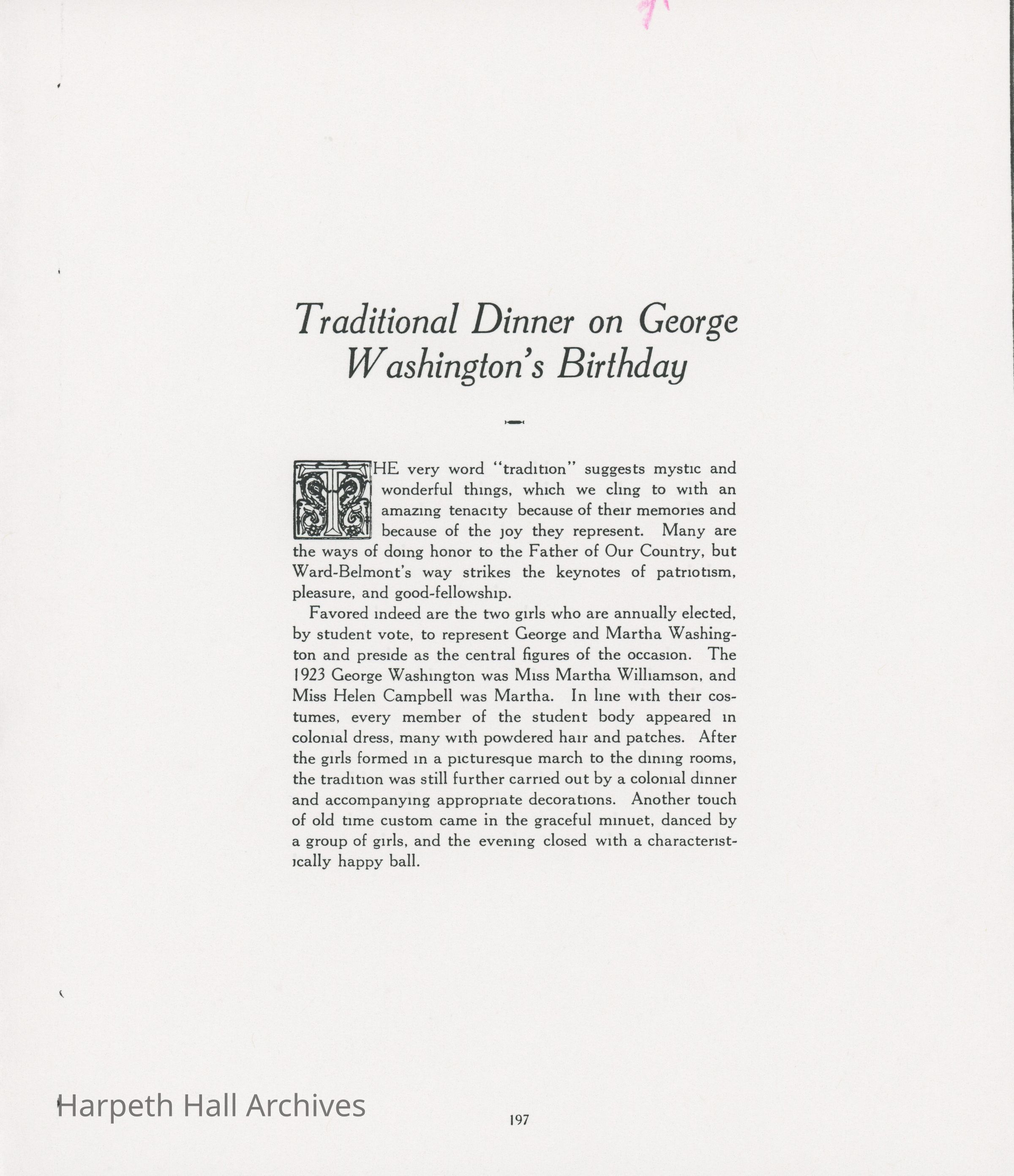 Pictures and writings about Ward-Belmont's 1923 George Washington Celebration which was a dinner at the time.