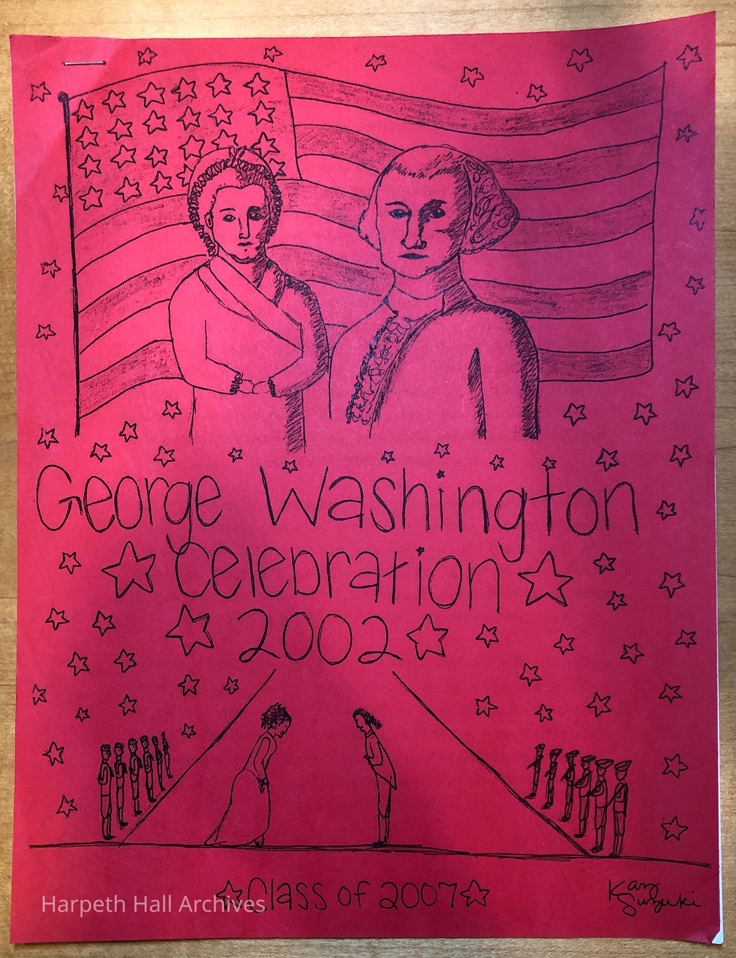 The 2002 program for the George Washington Day Celebration put on by the class of 2007 when they were in the seventh grade. The celebration was dedicated to the men and women serving in the US Armed forces and the heroes of 9/11, the firefighters, EMTs, police, volunteers and victims who sacrificed themselves for freedom. George Washington was played by eighth grader Grace Herbert (2006) and Martha Washington was played by eighth grader Mary Katherine Bartholomew Geismar (2006). Front cover design by Keiza "Kaz" Suzuki (2007).Context