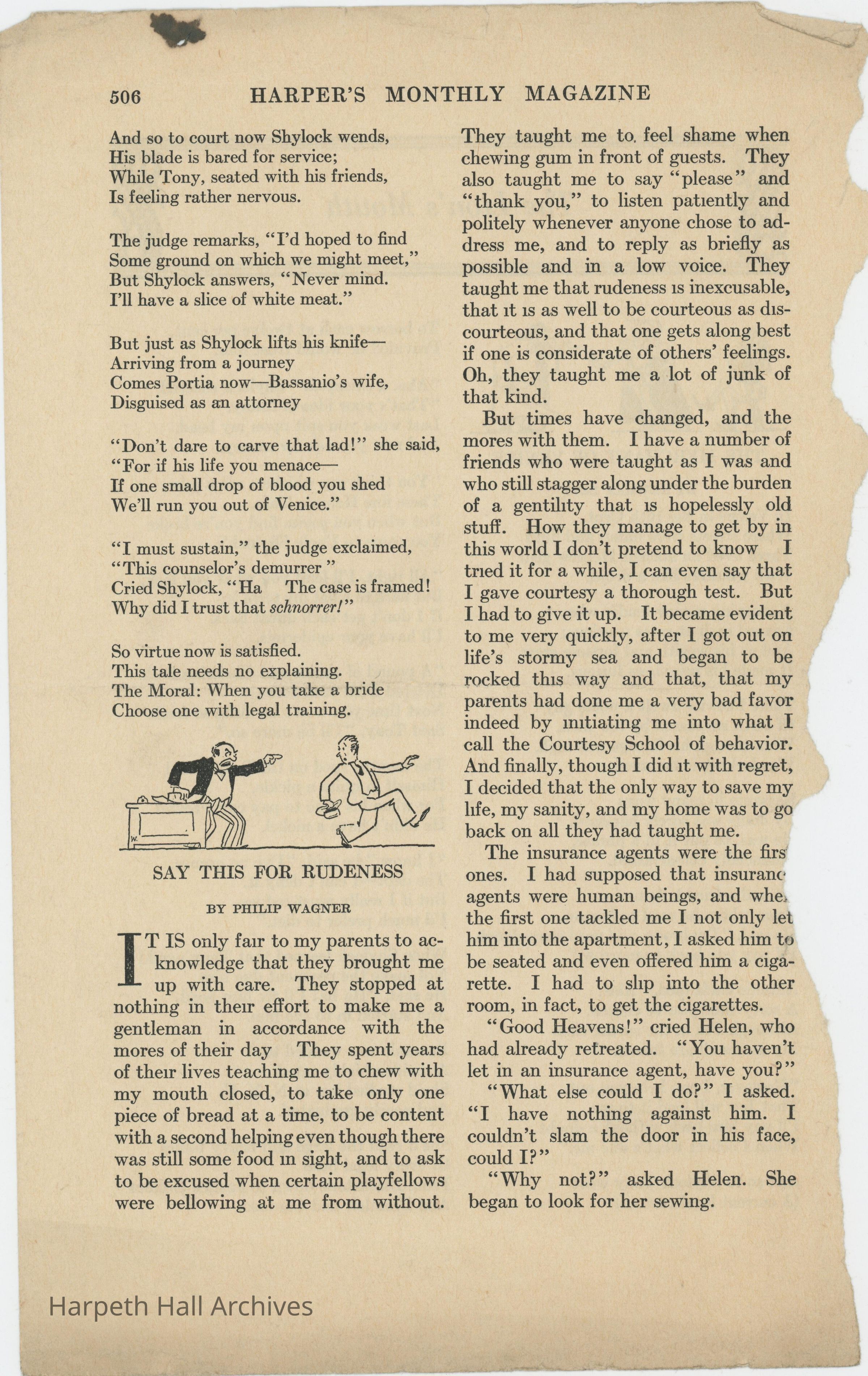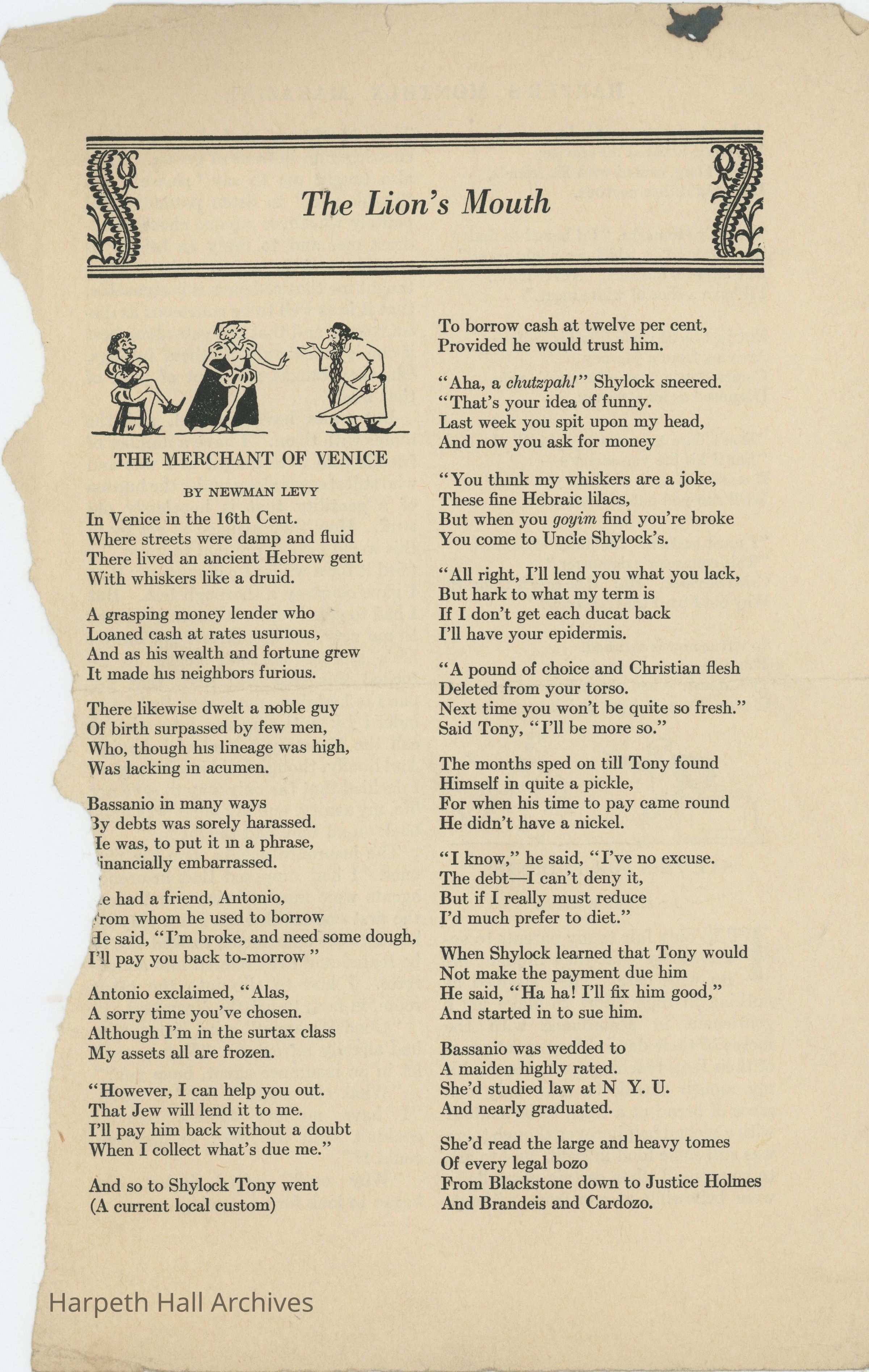 An essay titled, "The Merchant of Venice" written by Ward-Belmont student Newman Levy. The essay was published in Harper's Monthly Magazine.Collection