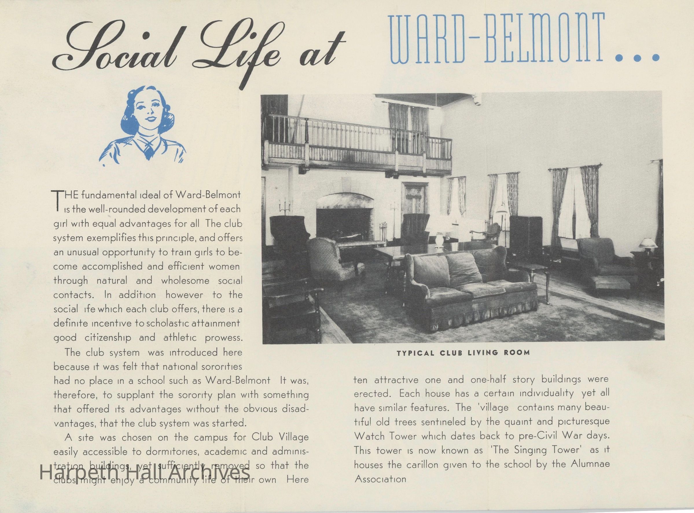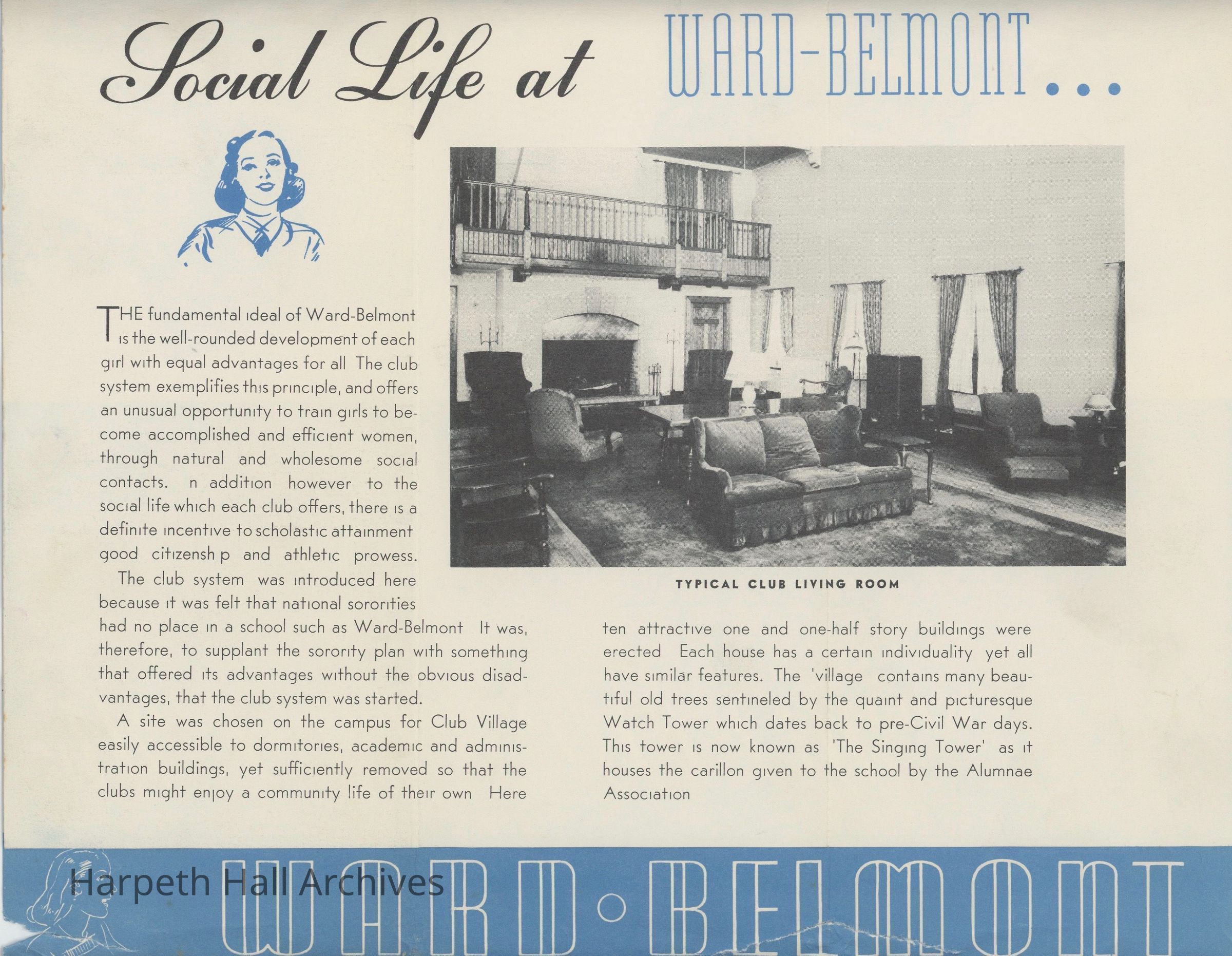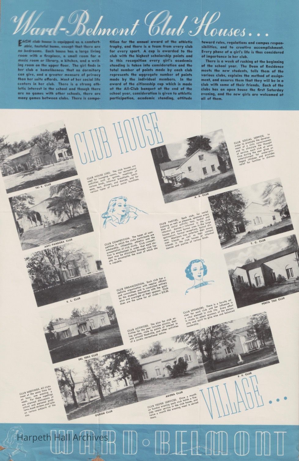 Ward-Belmont offered ten student social clubs, similar to sororities: the Twentieth Century Club (T.C.C.), X.L., A.K. (All 'Round), Osiron, Agora, Anti-Pandora, F.F., Penta Tau, Del Vers, and Tri K. Per this pamphlet, "the club system was introduced here because it was felt that national sororities had no place in a school such as Ward-Belmont. It was, therefore, to supplant the sorority plan with something that offered its advantages without the obvious disadvantages, that the club system was started." Like sororities, there was a week of rushing at the beginning of the school year, and new club members participated in an initiation.