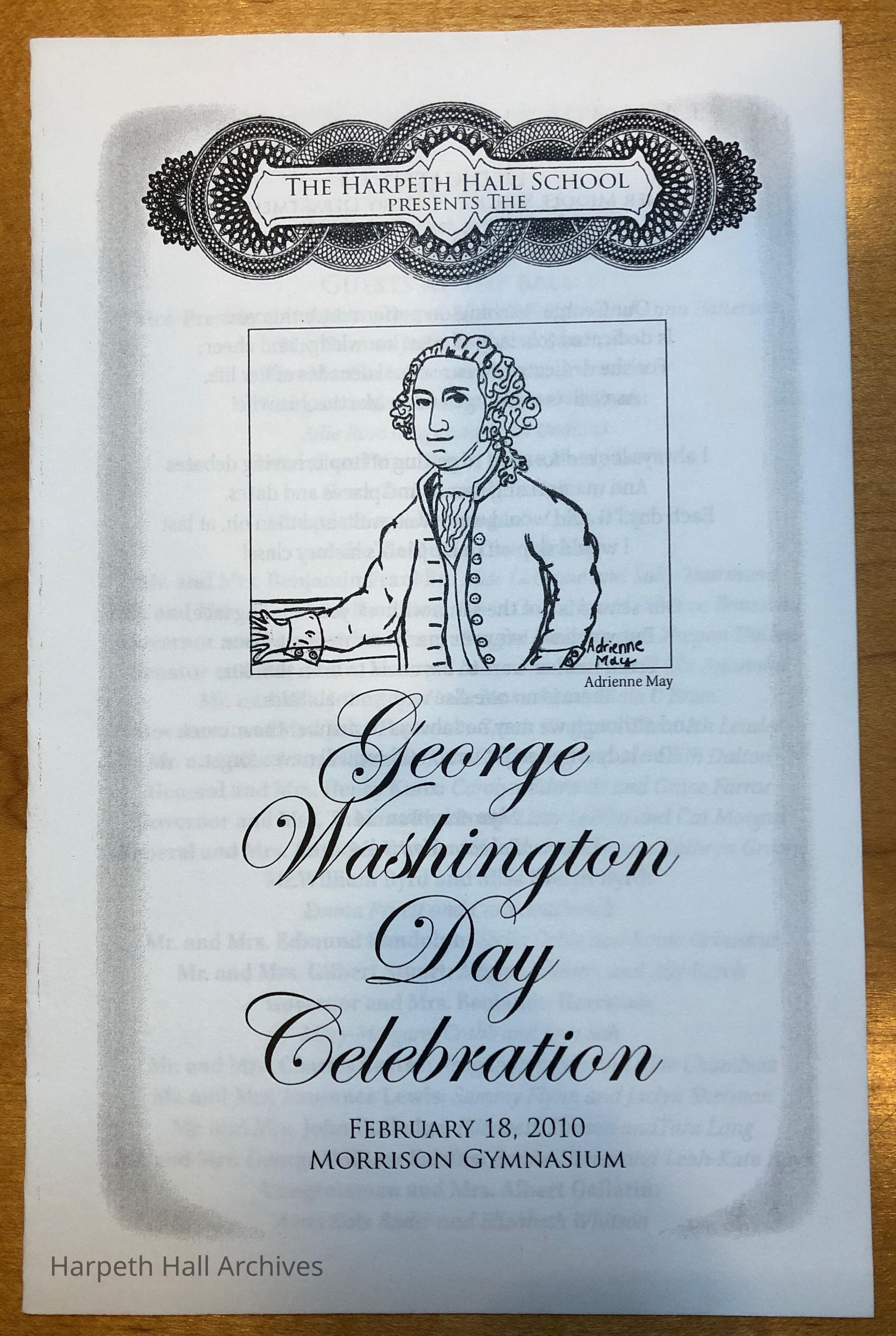 The 2010 program for the George Washington Day Celebration put on by the class of 2015 when they were in the seventh grade. The celebration was dedicated to Merrie Morrisey Clark (1969). George Washington was played by eighth grader Sarah Gresham Barr (2014) and Martha Washington was played by eighth grader CiCi Rutherford Young (2014). Front cover design by Adrienne May (2015).Context