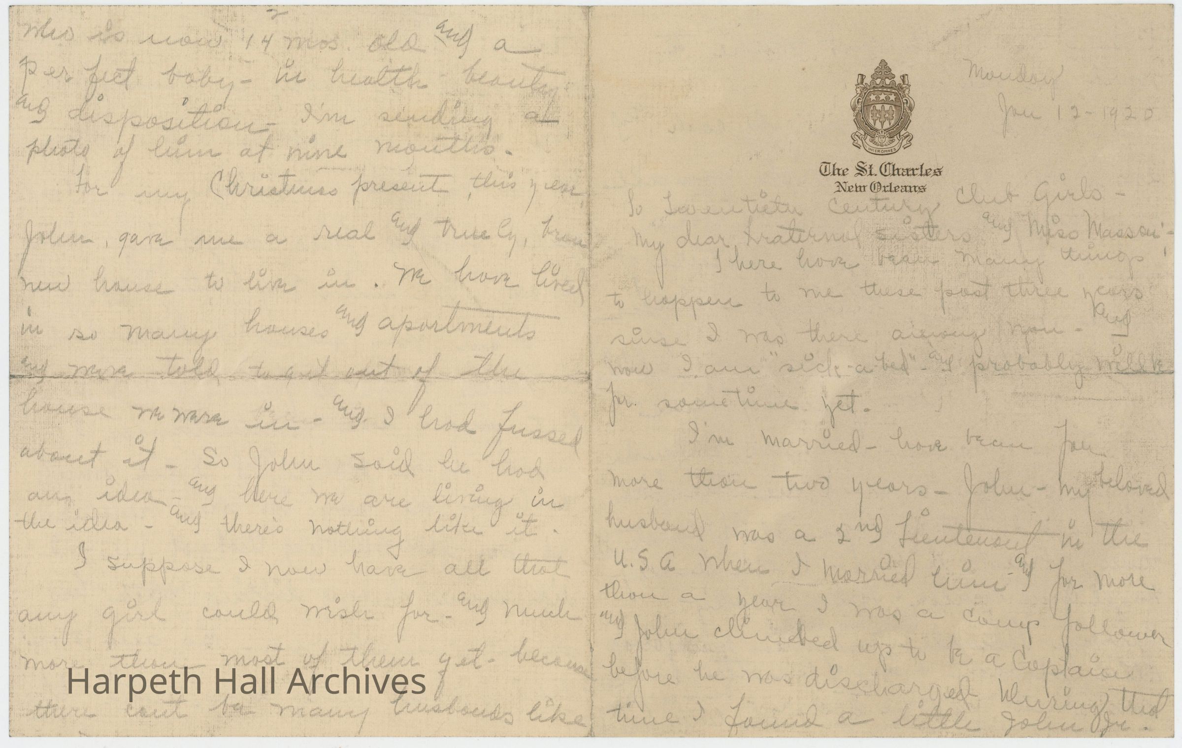 A letter from former Ward-Belmont student Sue Moore Fullilove, dated Monday, January 12, 1920 and addressed "to Twentieth Century Club girls - my dear fraternity sisters and Miss Masson." The stationary used shows a letterhead from The St. Charles in New Orleans - possibly the St. Charles Hotel, which closed and was demolished in 1974.