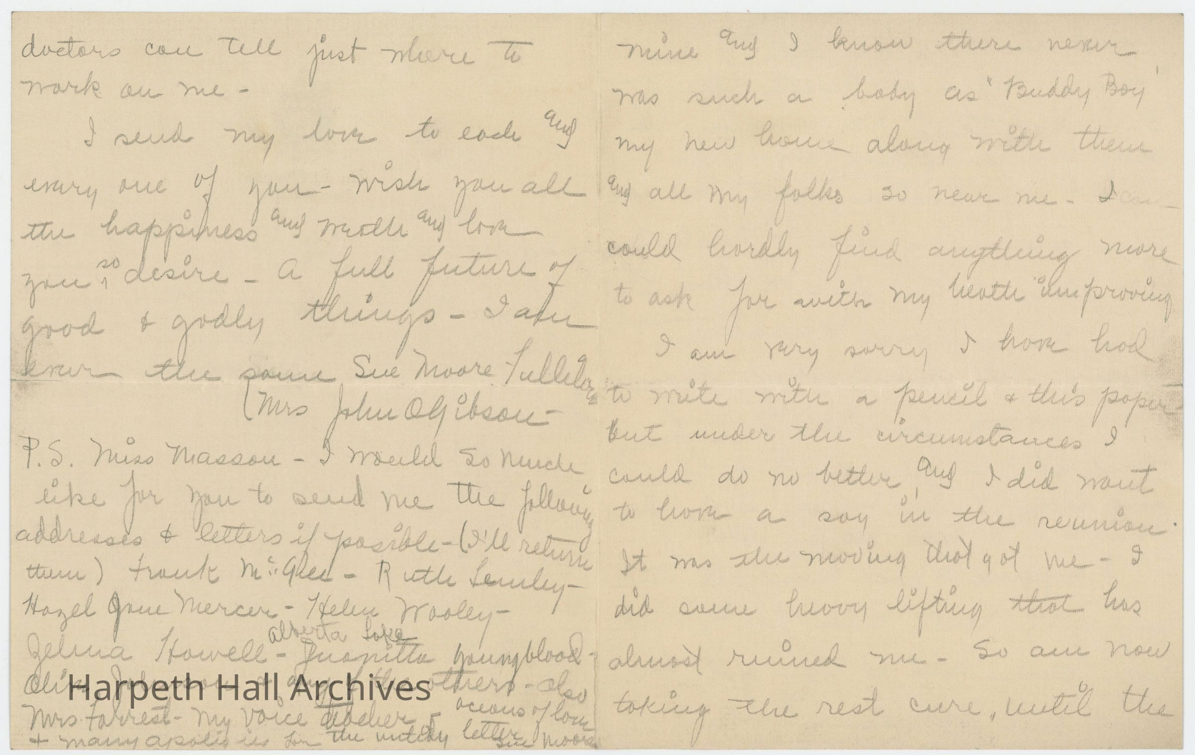 In this letter, Fullilove writes of her life since her graduation from Ward-Belmont, three years ago at the time. She is fighting illness (but notes her health is improving), and has married John O. Gibson, who was a second lieutenant in the U.S. Army and worked his way up to the rank of captain before being discharged. She sends her "love to each and every one of you - wish you all the happiness [and] love you so desire - a full future of good & godly things." She asks Miss Masson (Jennie Taylor Masson, longtime faculty sponsor of the Twentieth Century Club and the school Registrar) to send her the addresses of several former Ward-Belmont students and T.C.C. members - Frank McGee, Ruth Lemley, Hazel Mercer, Helen Wooley, Alberta Lake, Juanita Youngblood, Zelma Howell, and one other (Olive, Oliva, or Olivia Johnson or Johnston), as well as that of Mrs. Forrest (Marguerite Palmiter Forrest), her voice teacher in 1917.
