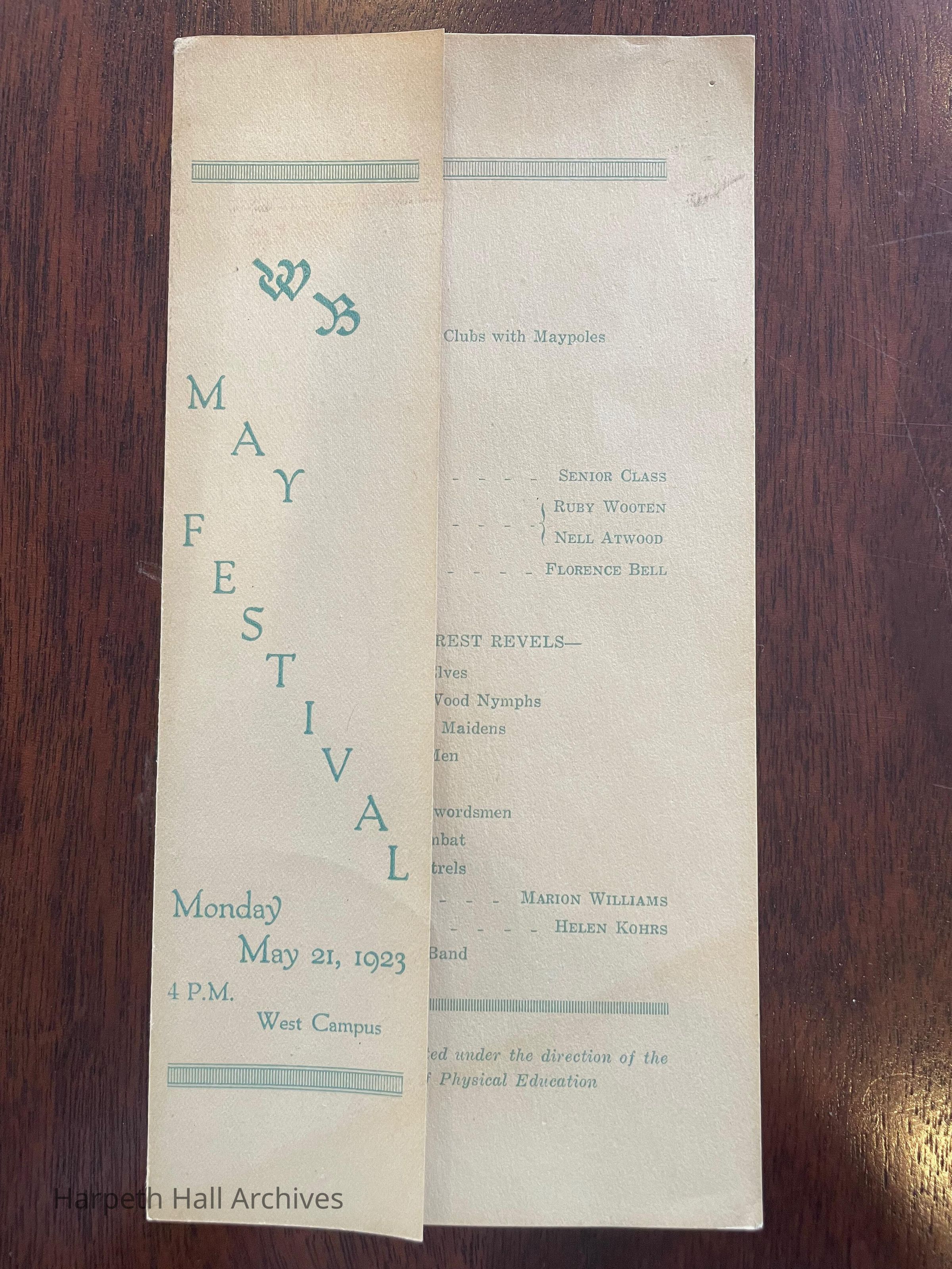 A bulletin for the Ward-Belmont May Festival held on May 21st, 1923. Details the schedule of the event.