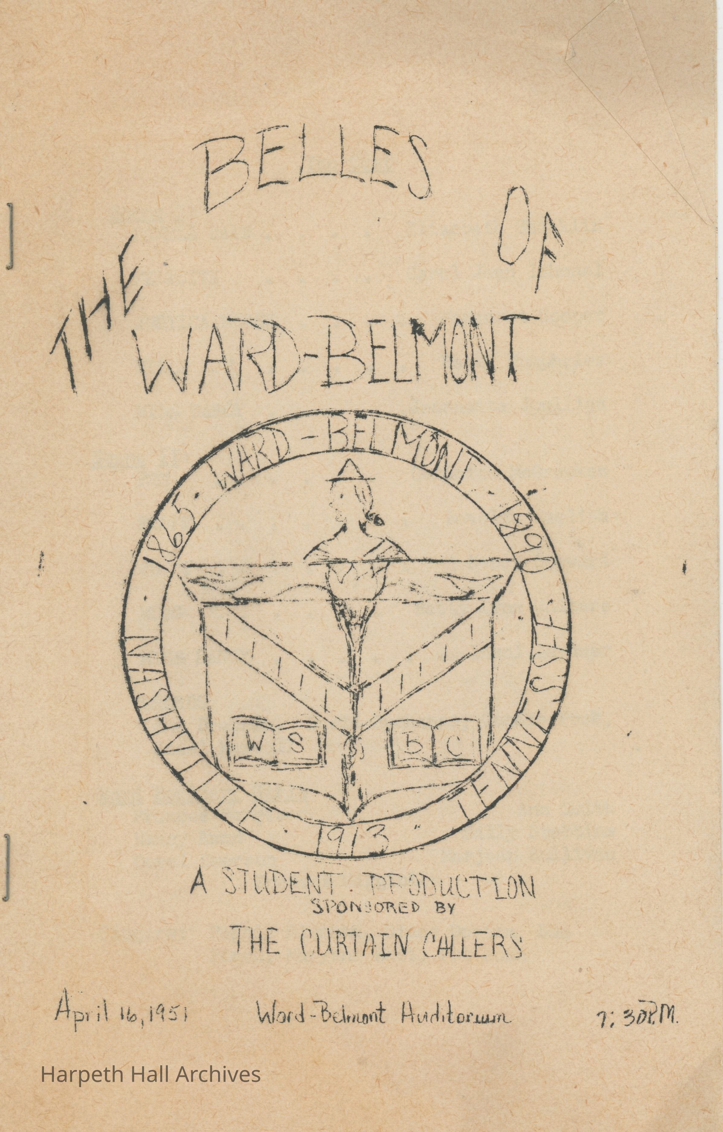A program for "The Belles of Ward-Belmont," a student production sponsored by the Curtain Callers (within the Department of Expression) that took place on April 16, 1951 at 7:30 PM in the Ward-Belmont auditorium. The program includes a cast list, scenes list, names of production staff, and a list of officers and members of the Curtain Callers club. Credit for the costumes and provider of lawn furniture for the play are handwritten on the last page of the program.Context