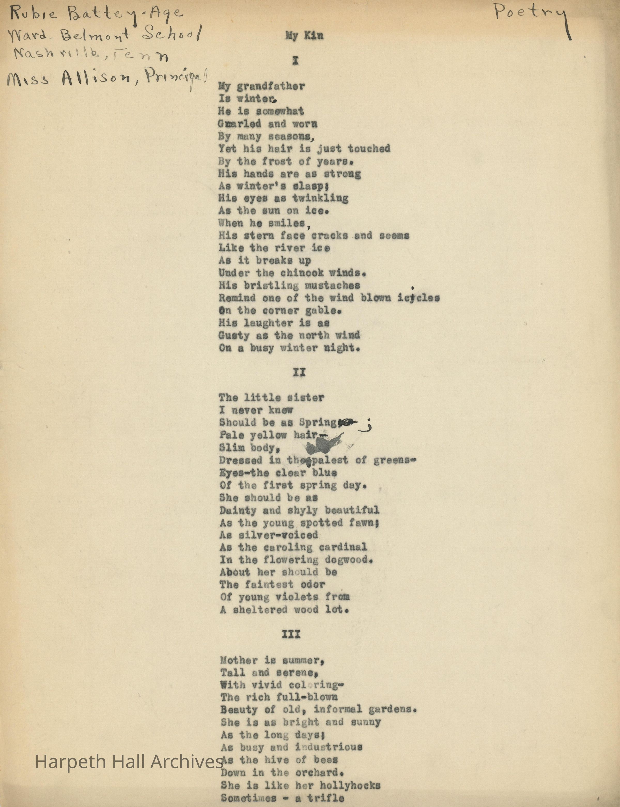 A series of poems entitled, "My Kin" written by Ward-Belmont student Rubie Battey (1933).