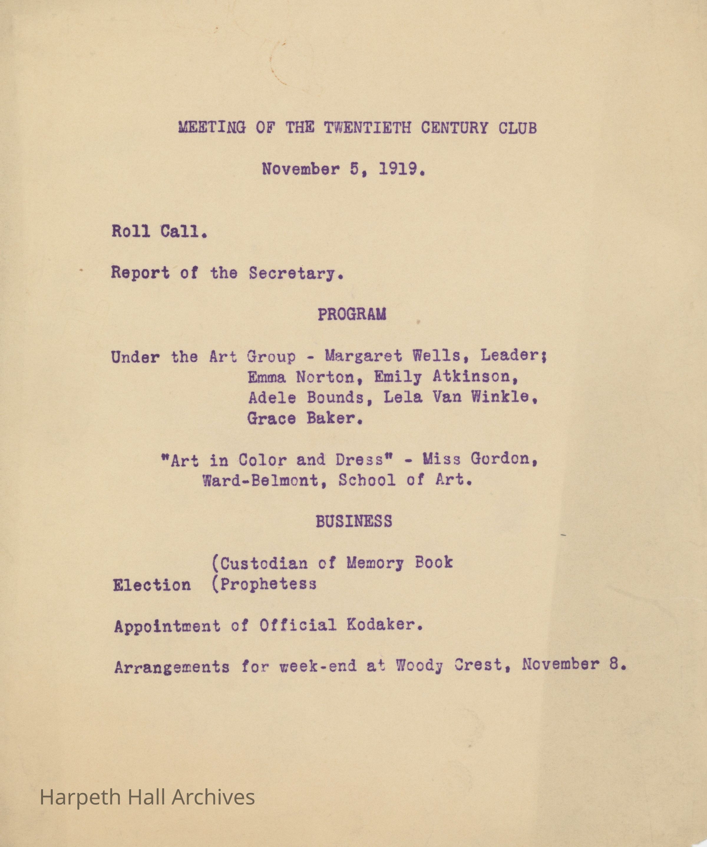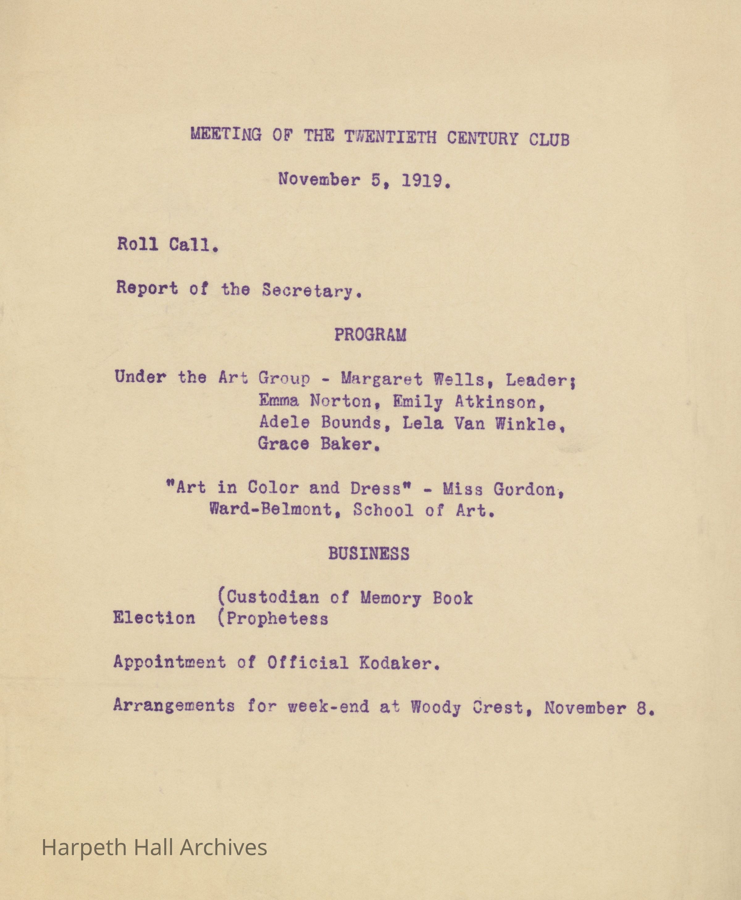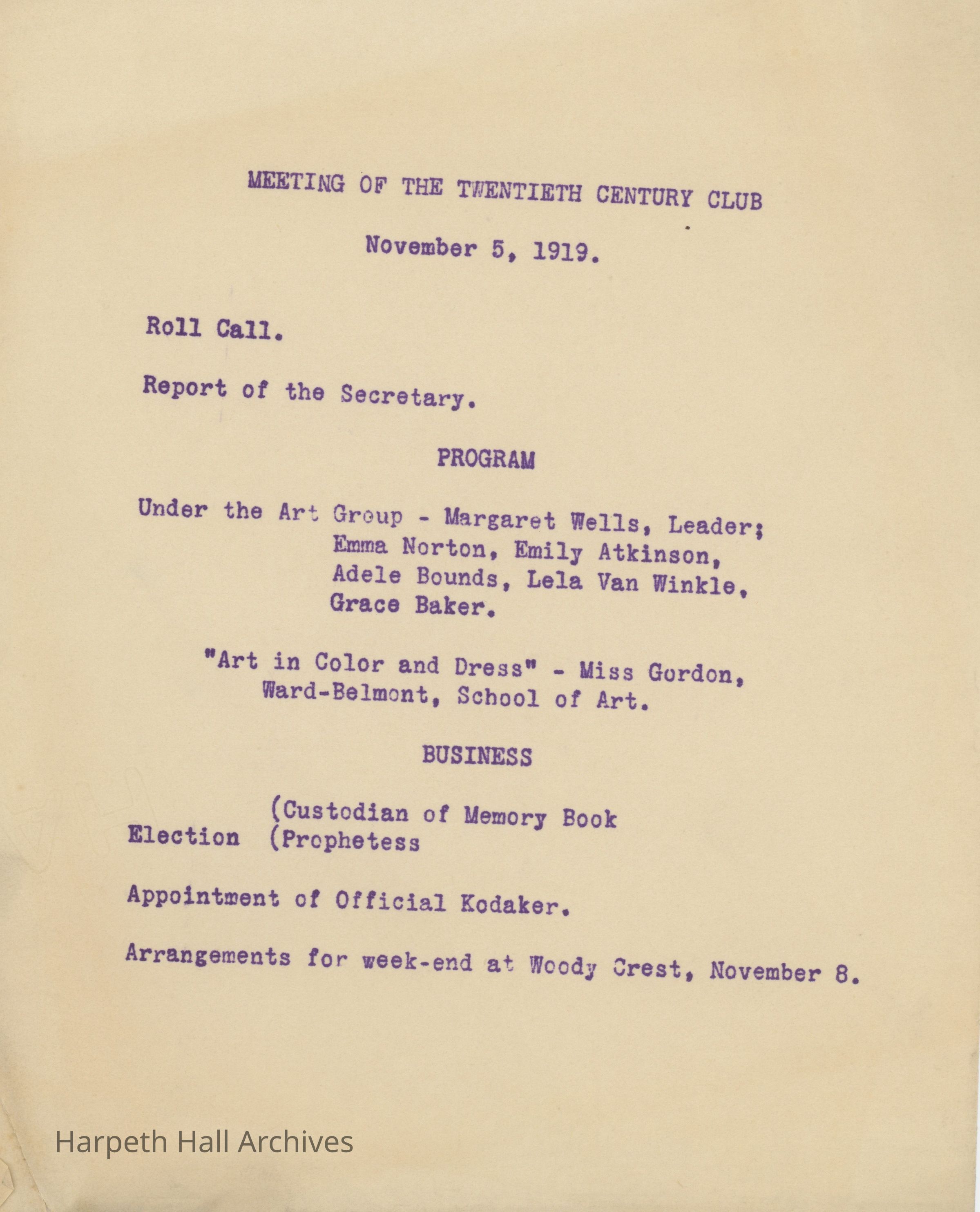 A program for a meeting of the Twentieth Century Club, held on November 5, 1919. The meeting included roll call, a report of the club secretary, the program (a presentation by the art club group and Miss Gordon, a faculty member in the Ward-Belmont School of Art), and club business (election of two officers (the Custodian of the Memory Book and the Prophetess), appointment of an Official Kodaker (photographer) for the club, and arrangements for a weekend trip to Woody Crest scheduled for November 8th).Context