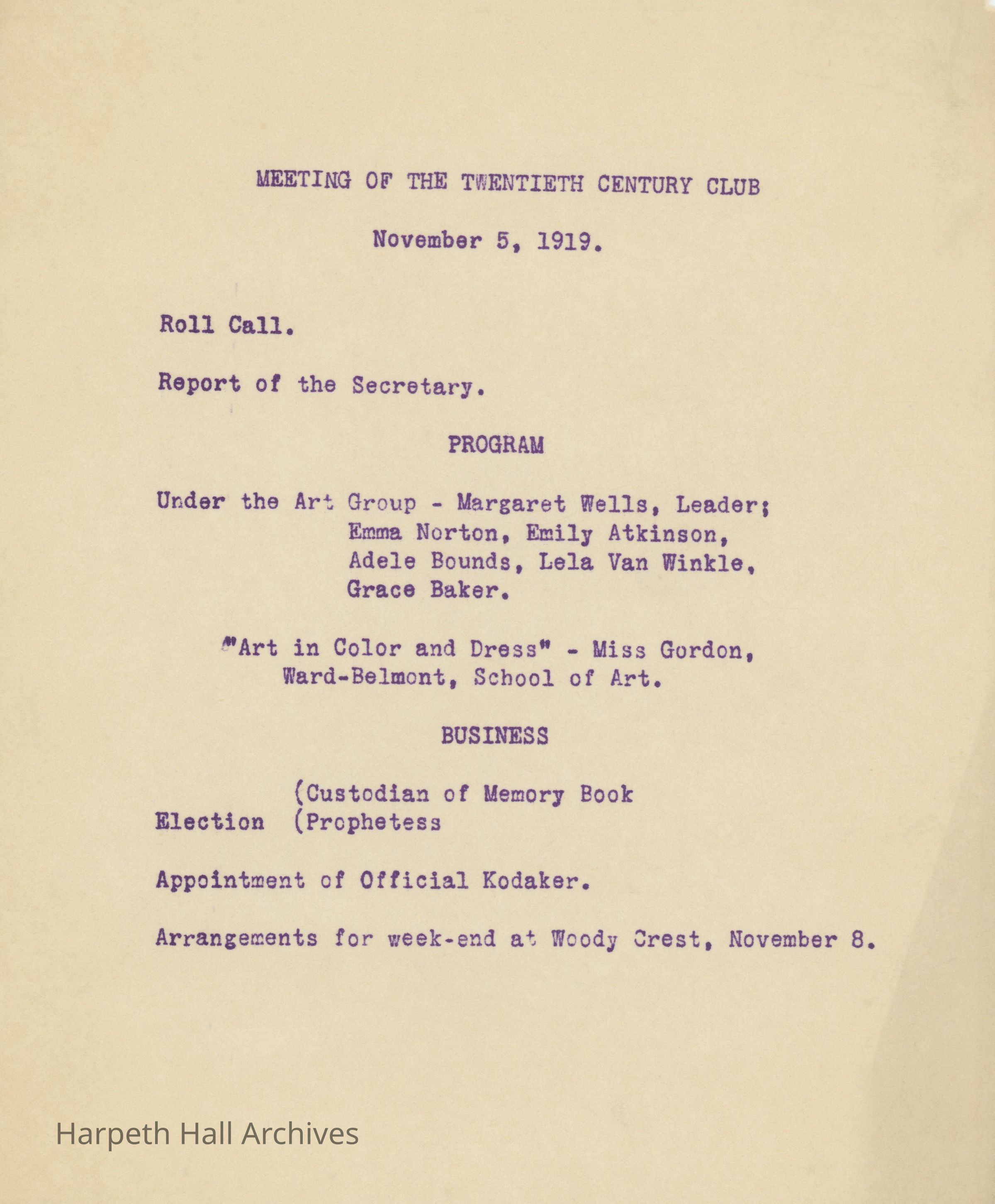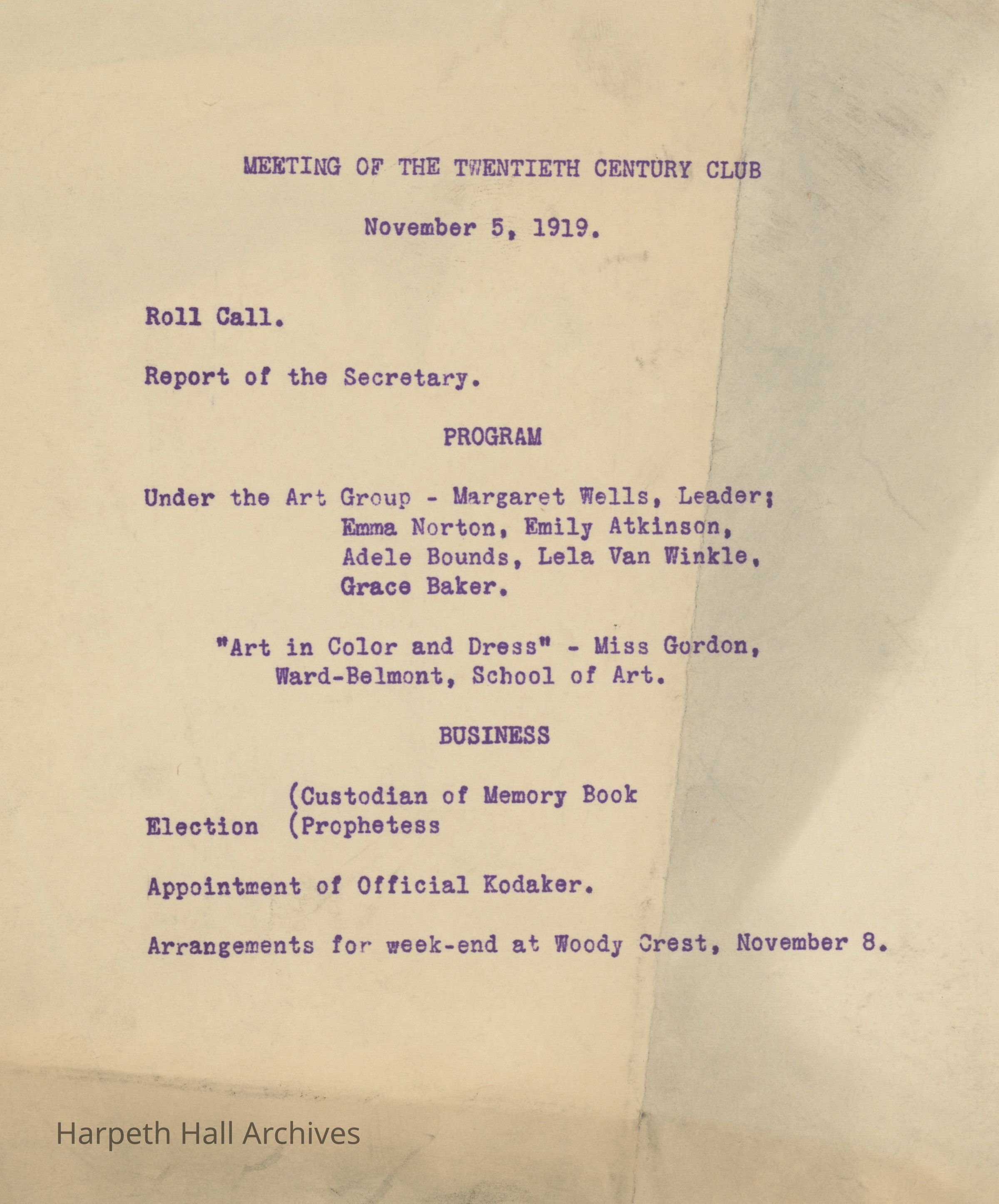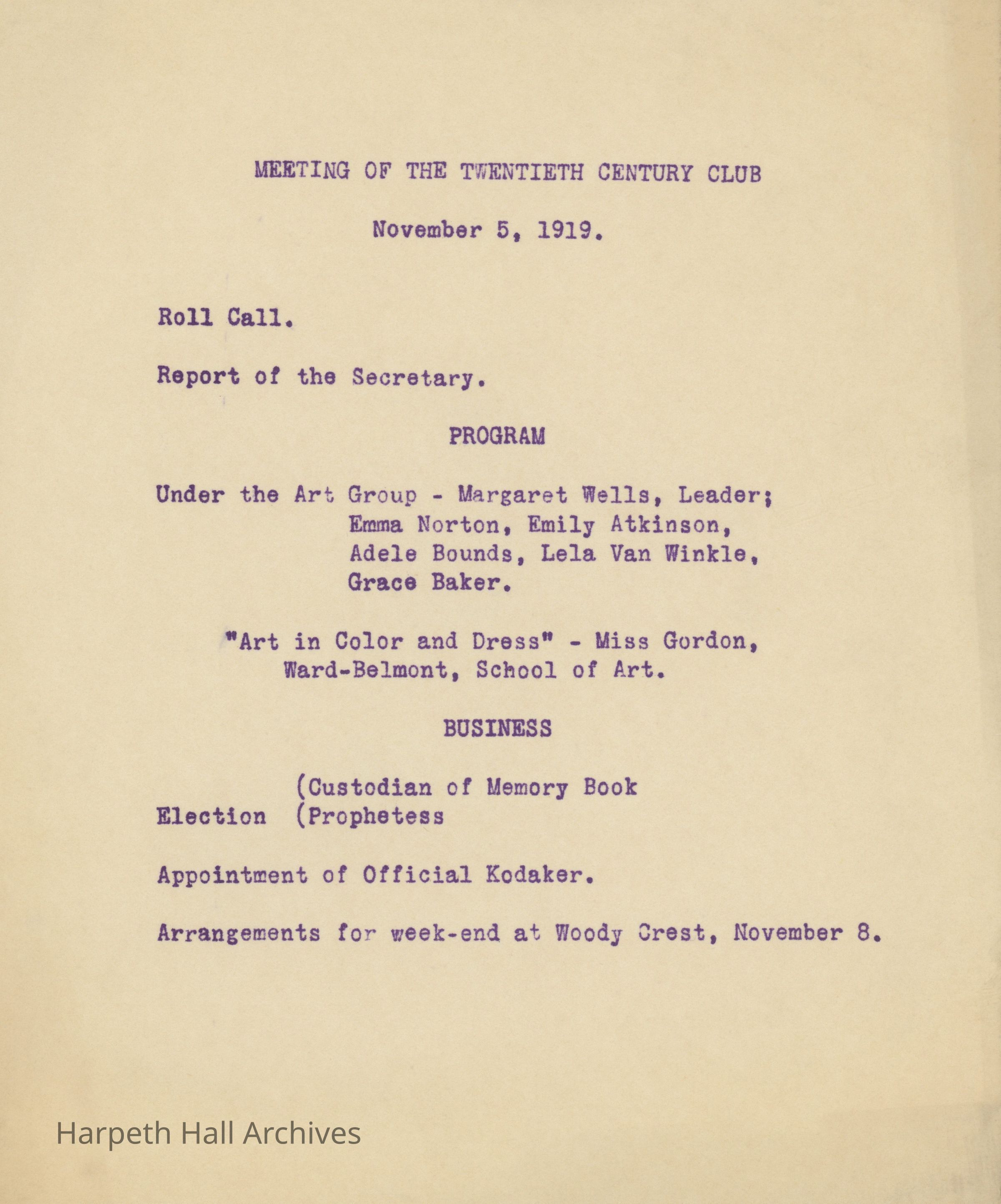 A program for a meeting of the Twentieth Century Club, held on November 5, 1919. The meeting included roll call, a report of the club secretary, the program (a presentation by the art club group and Miss Gordon, a faculty member in the Ward-Belmont School of Art), and club business (election of two officers (the Custodian of the Memory Book and the Prophetess), appointment of an Official Kodaker (photographer) for the club, and arrangements for a weekend trip to Woody Crest scheduled for November 8th).Context