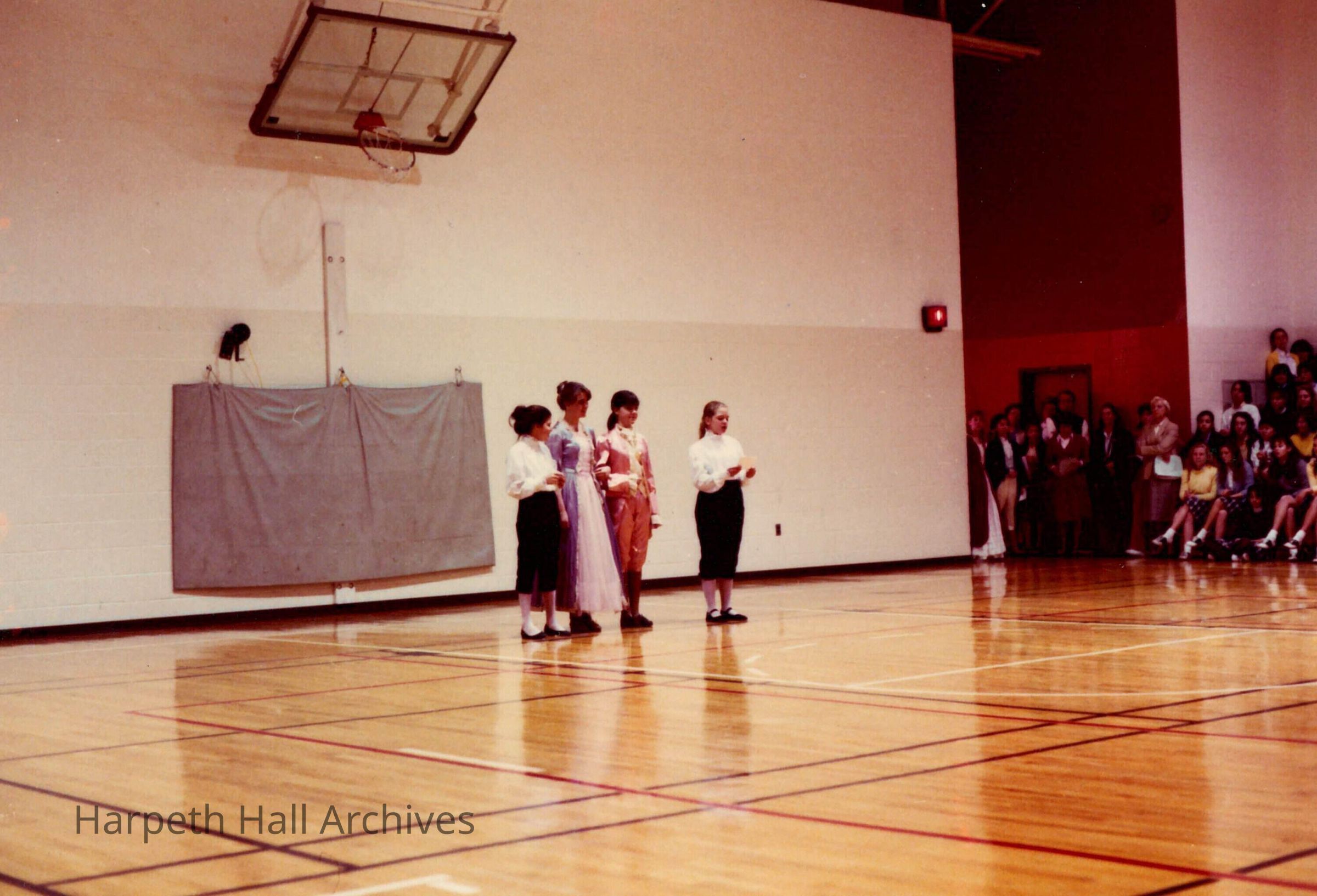 A group of seventh grade students performing in the George Washington Day Celebration. The photo is taken in Morrison Gym in the McMurry Center.Context