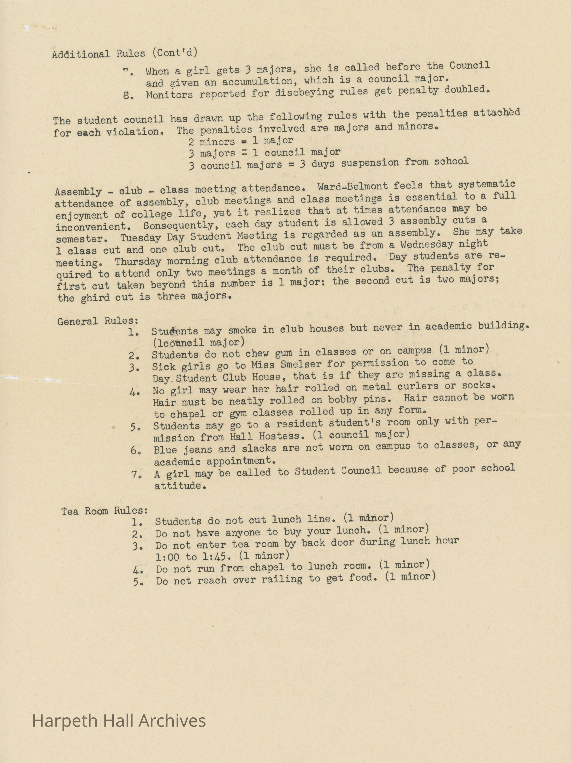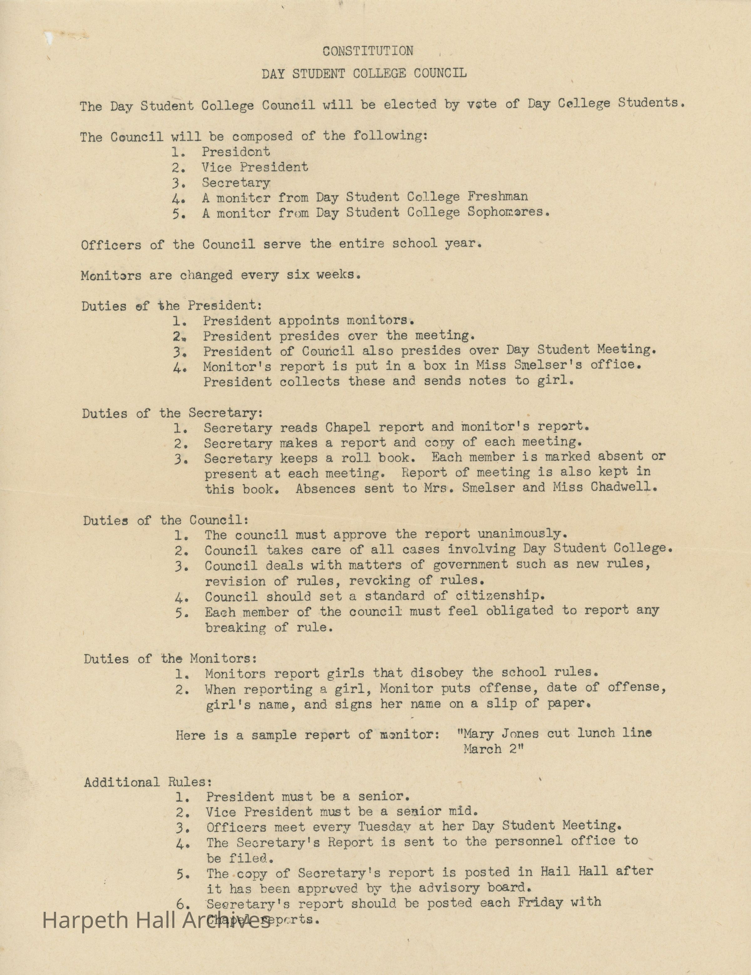 A list of rules that outlines the duties of the officers for Ward-Belmont's day school council.