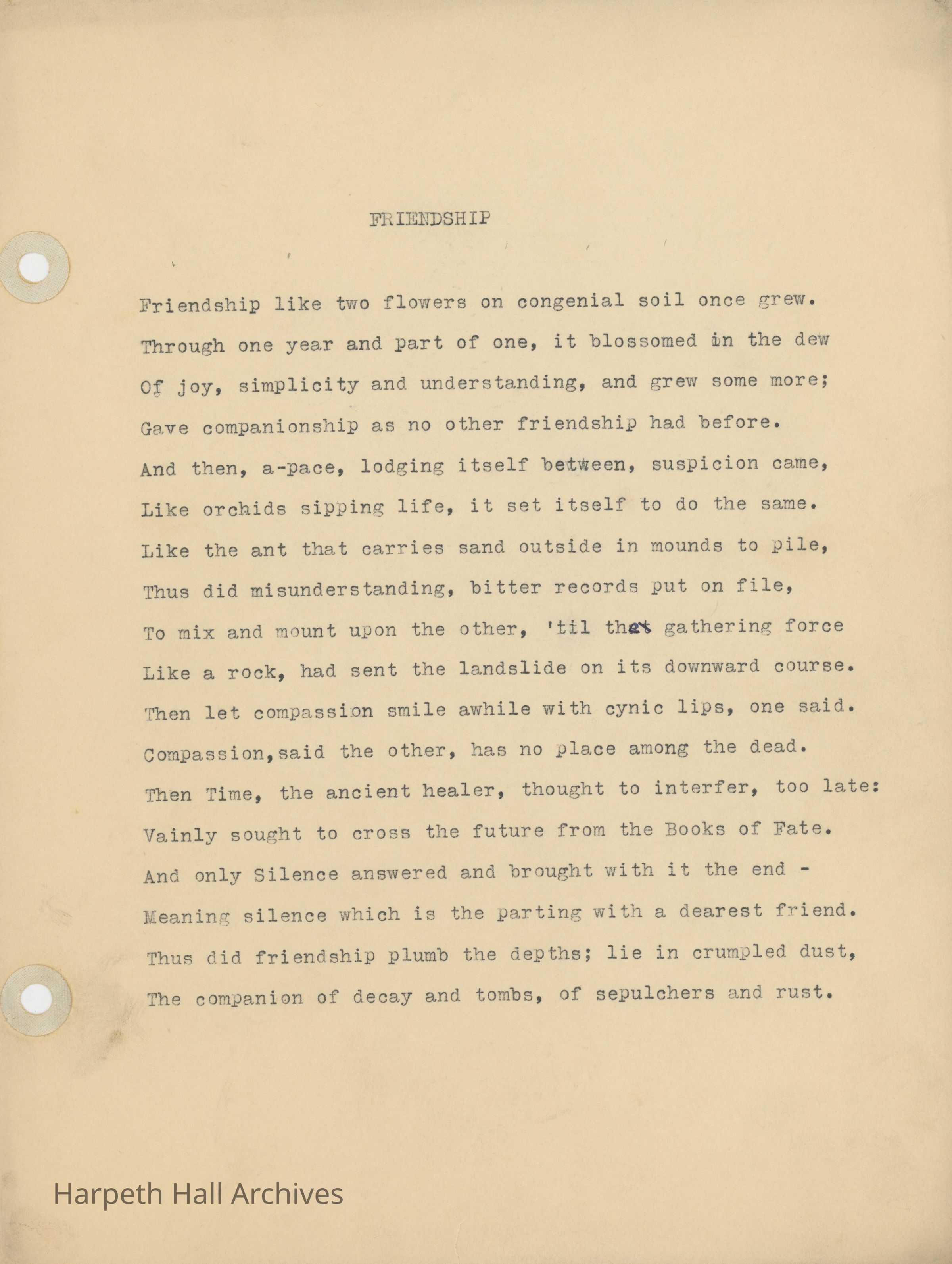 A poem entitled, "Friendship" written by a Ward-Belmont student.