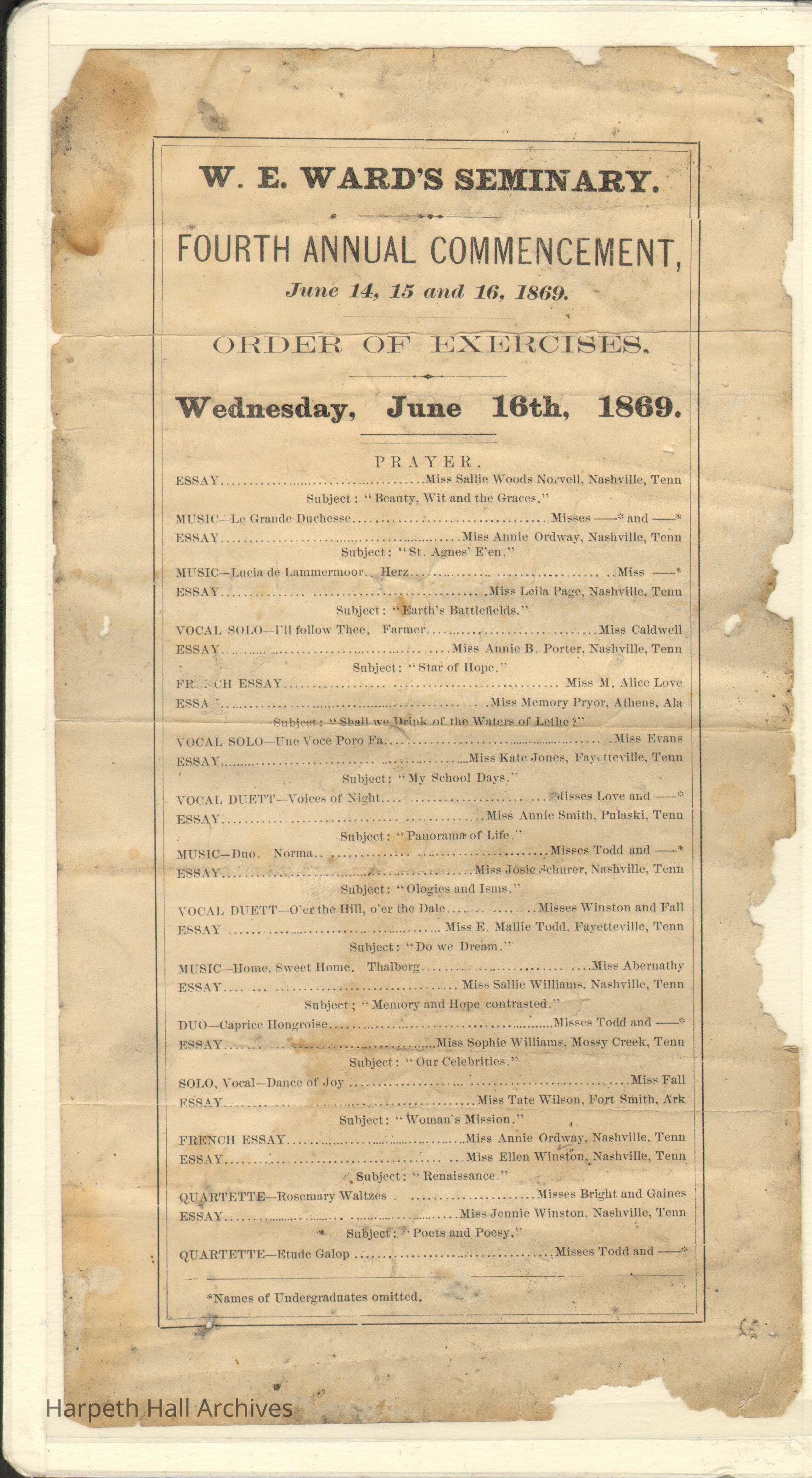 W.E. Ward's Seminary Fourth Annual Commencement, June 14, 15 and 16, 1869 Order of Exercises