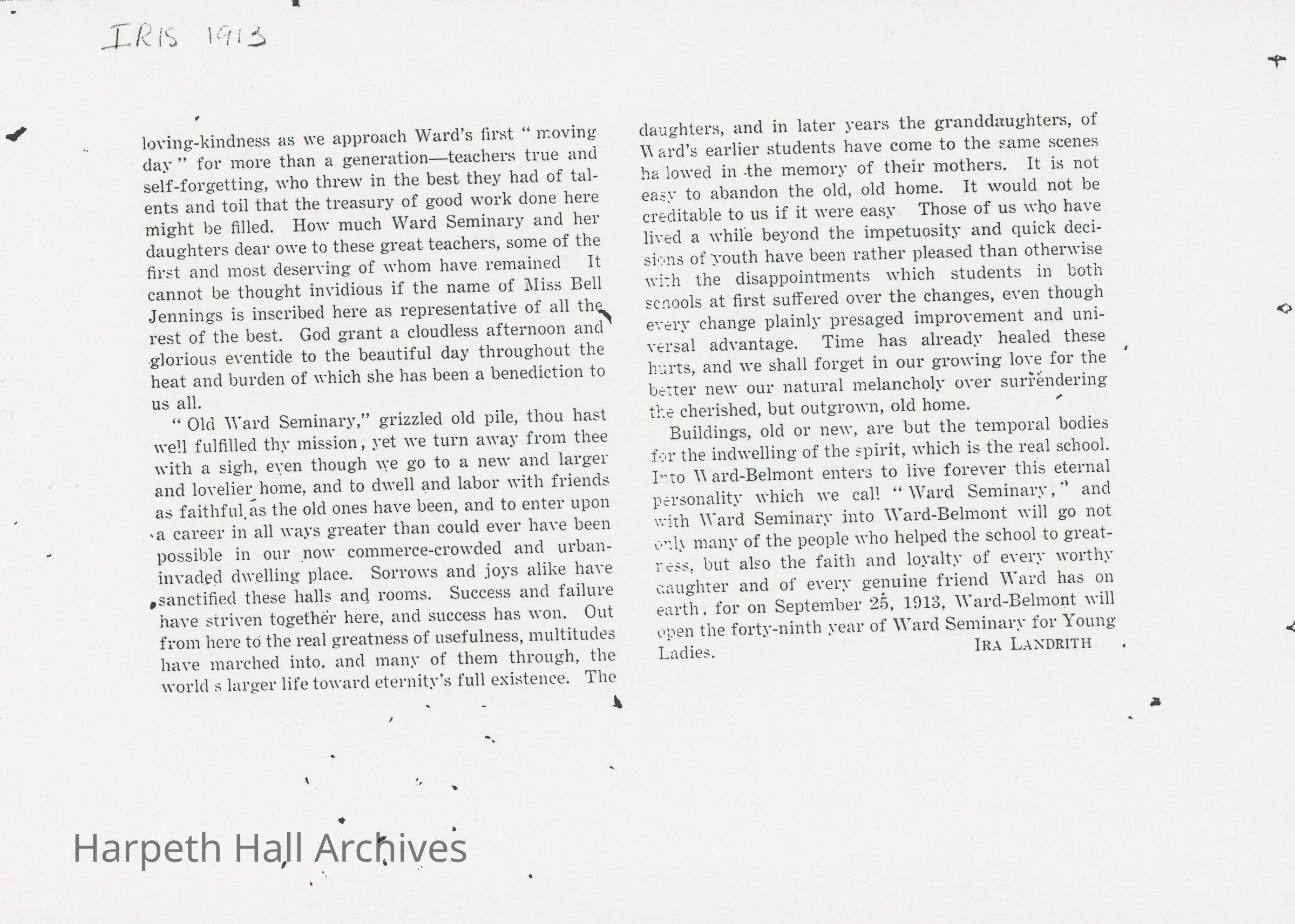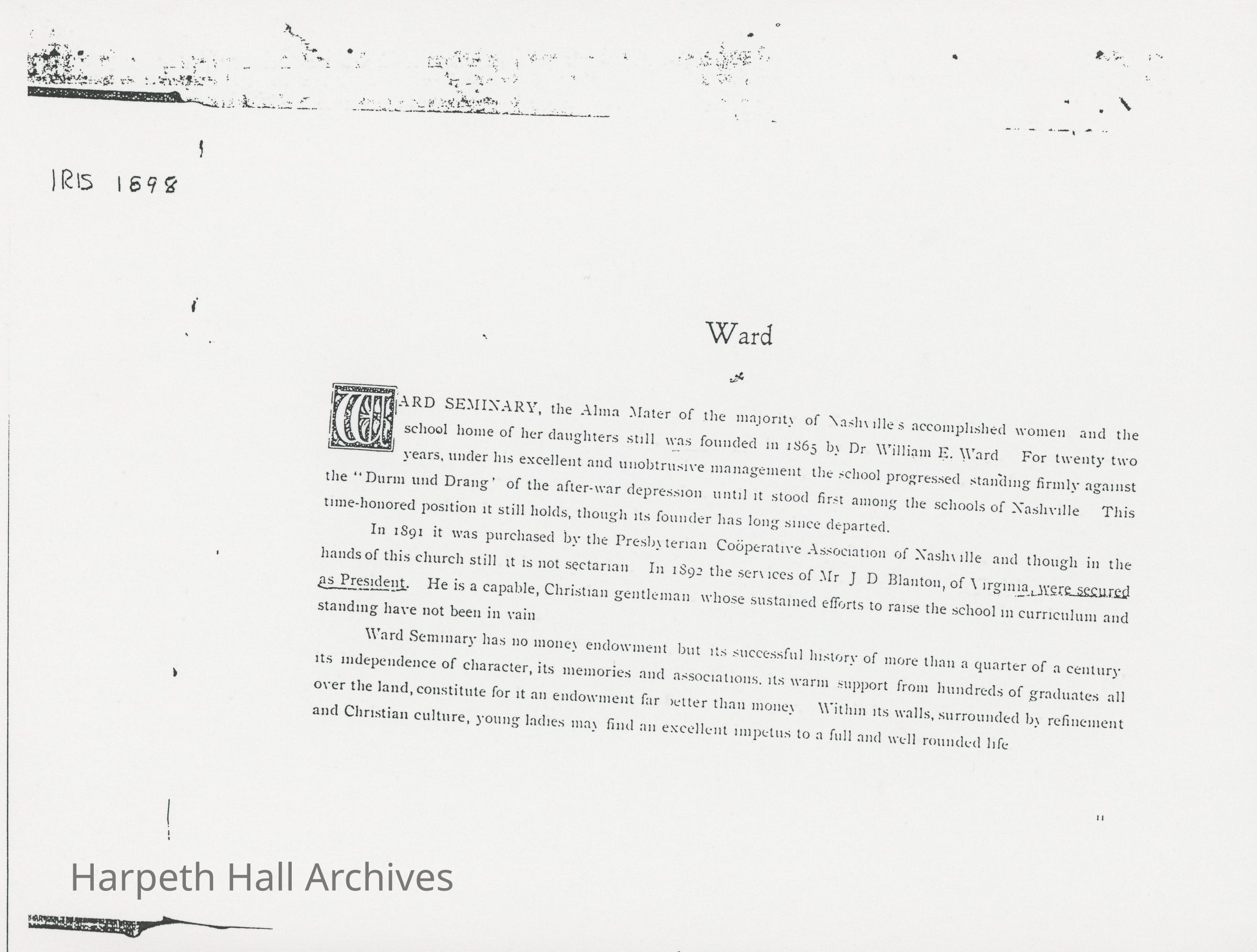 Photocopies of historical accounts of Ward Seminary and Ward-Belmont, taken from the Iris yearbooks of 1898, 1900, and 1913. One account was written by Madge C. Hall, recording secretary of the Ward Seminary Alumnae Association circa 1900, and one by Ira Landrith, the first president of Ward-Belmont upon its inception in 1913.Collection