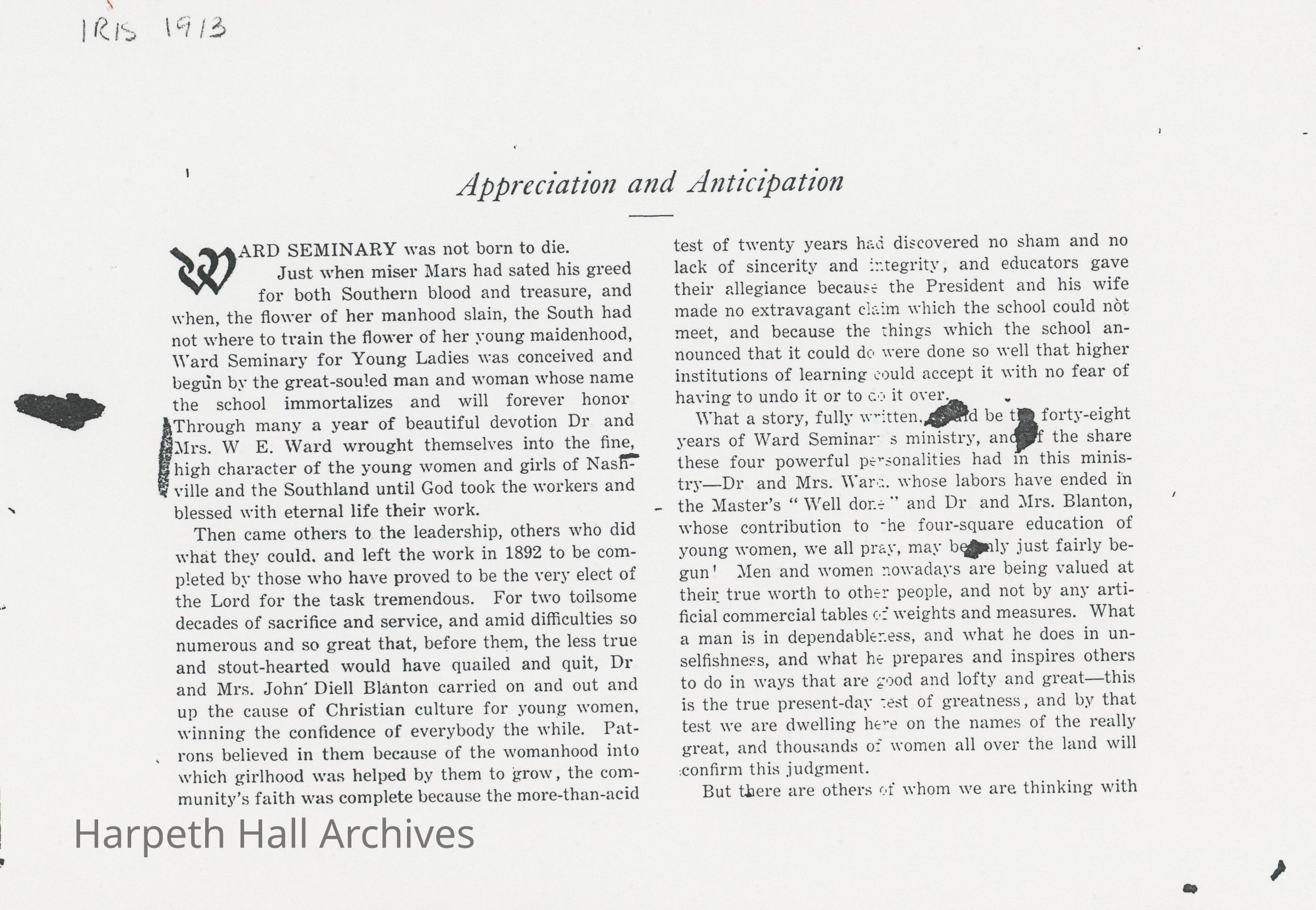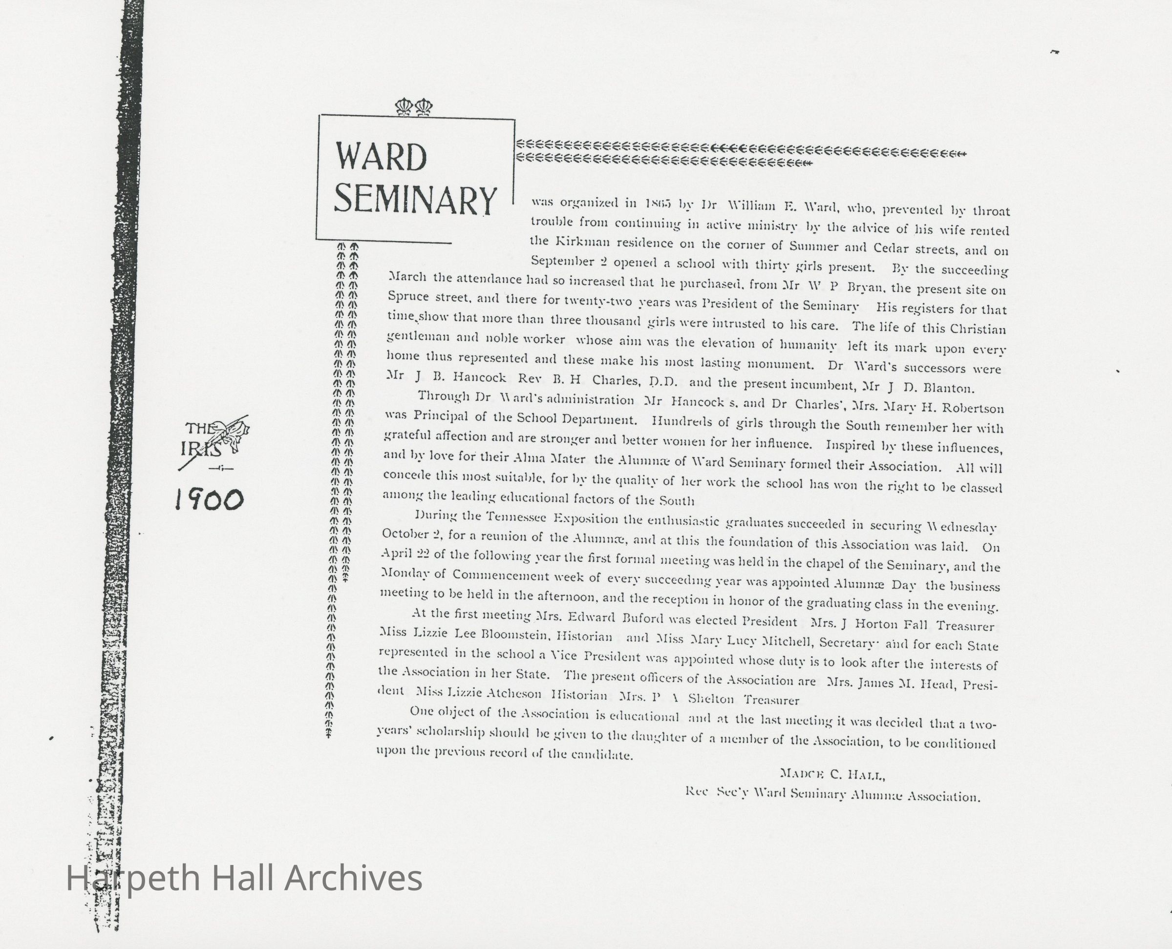 Ward Seminary, Ward-Belmont, Iris, 1898, 1900, 1913, Madge C. Hall, Ira Landrith