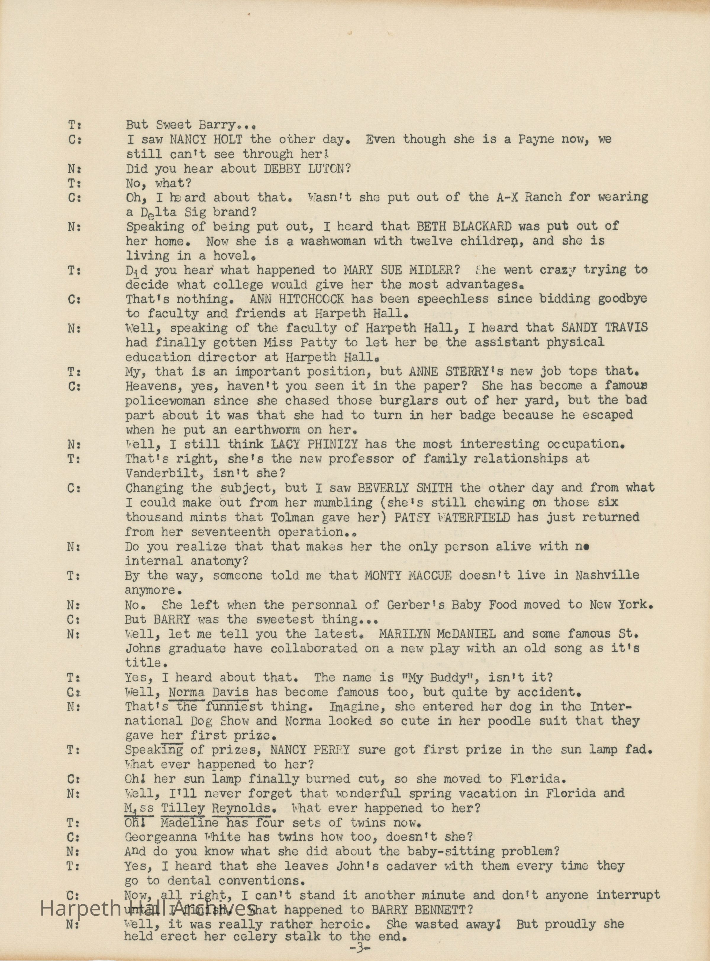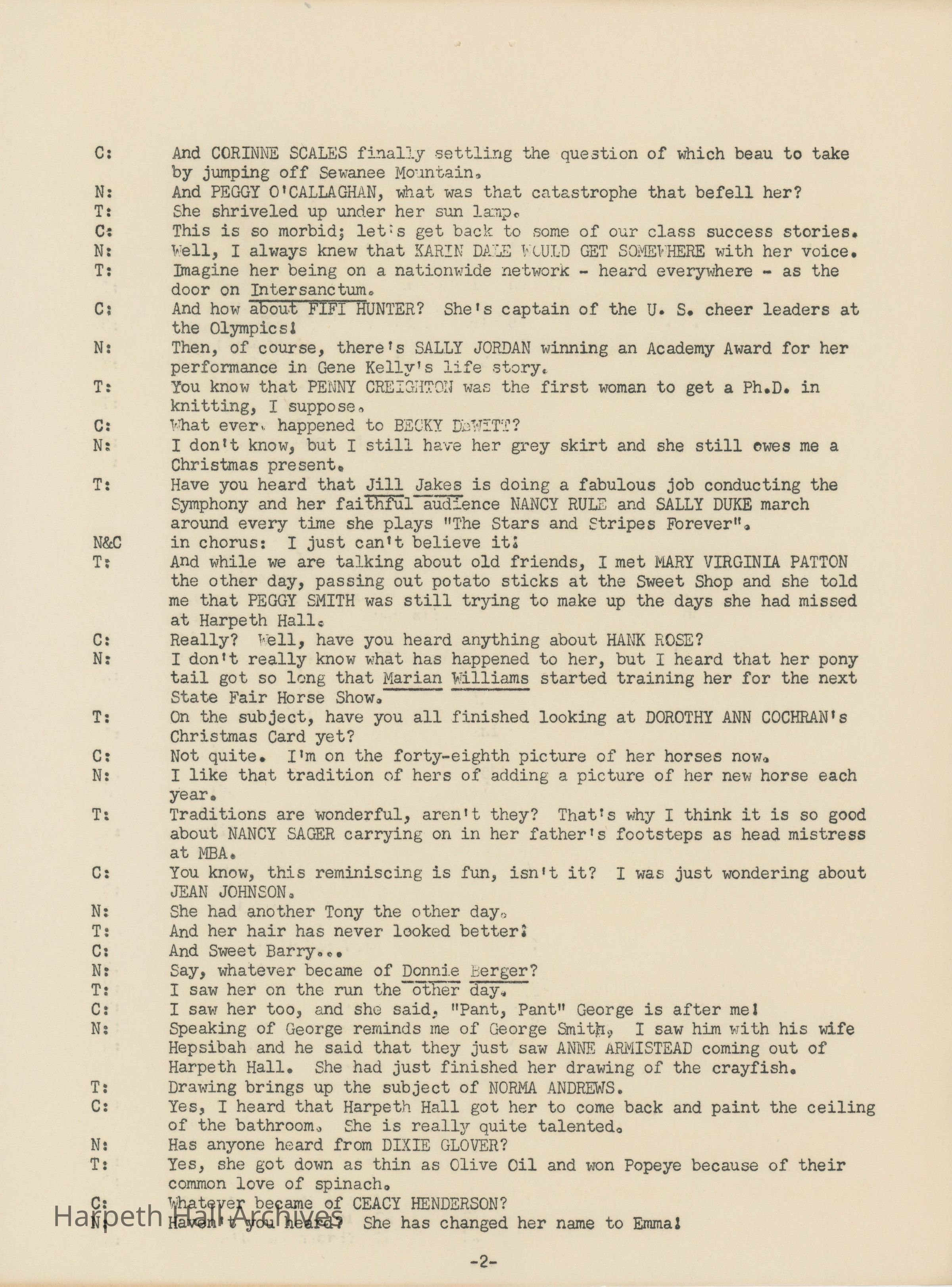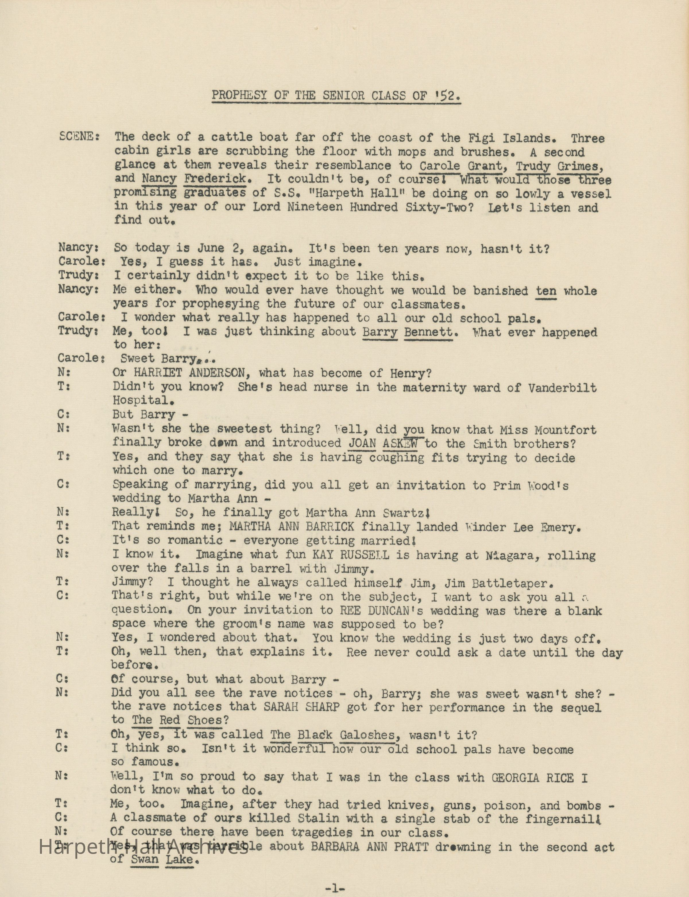Prophesy of the 1952 senior class. written out like a play. It keeps with the classes senior theme of sailors. It predicts what the seniors will be up to in 1962, almost like senior superlatives. The prophesy is told as a conversation between Nancy, Carole, and Trudy sharing updates on what they've heard each girl has gone on to do with their life.Collection