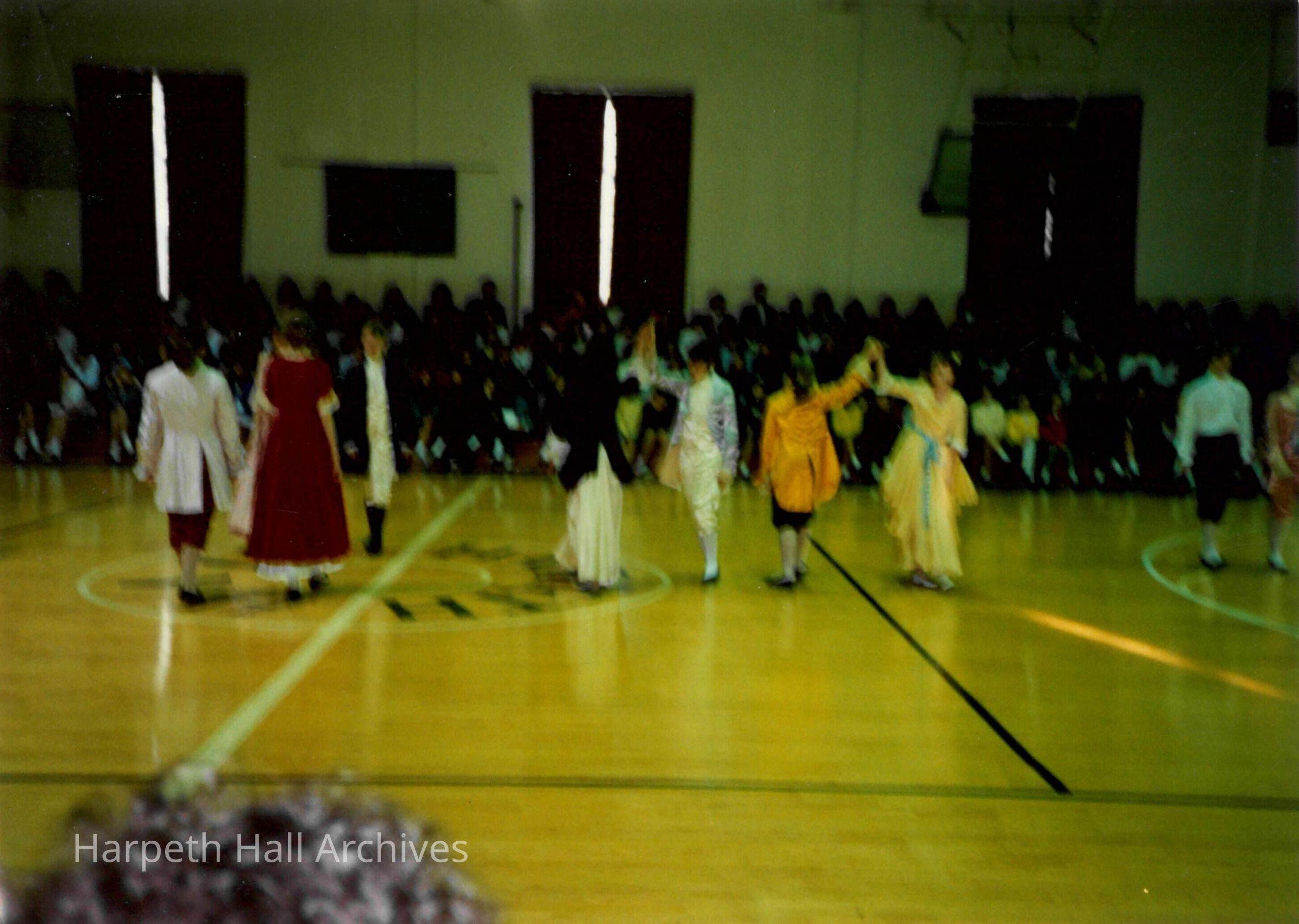 A group of seventh grade students performing a dance in the George Washington Day Celebration. The photo is taken in the Morrison Gym in the McMurry Center.Context