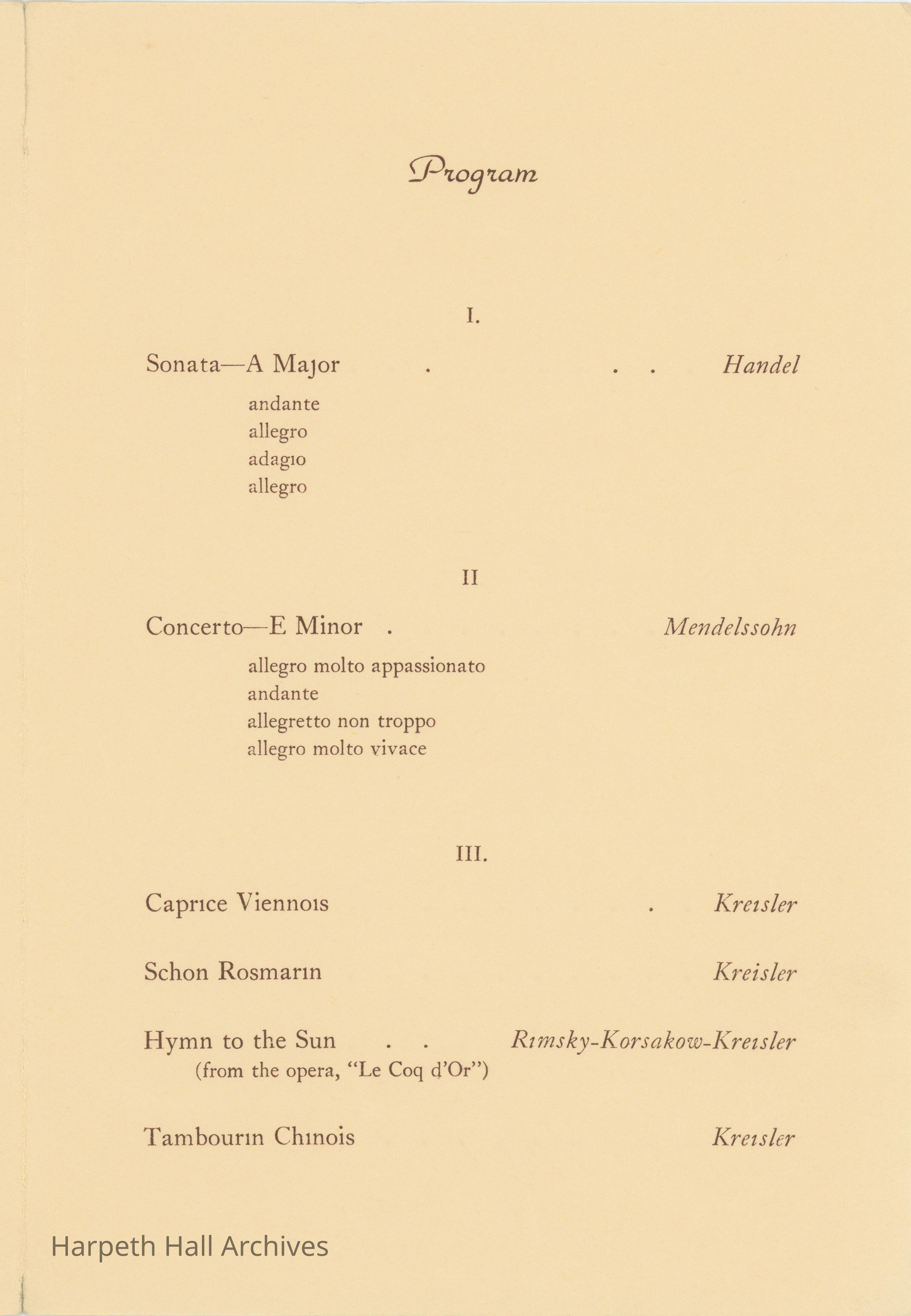 The program for the Kenneth Rose Violin Concert on October 22nd, 1936. The concert was presented by the Ward-Belmont Conservatory of Music. Mr. Rose was the head of the Violin department at Ward-Belmont.Collection