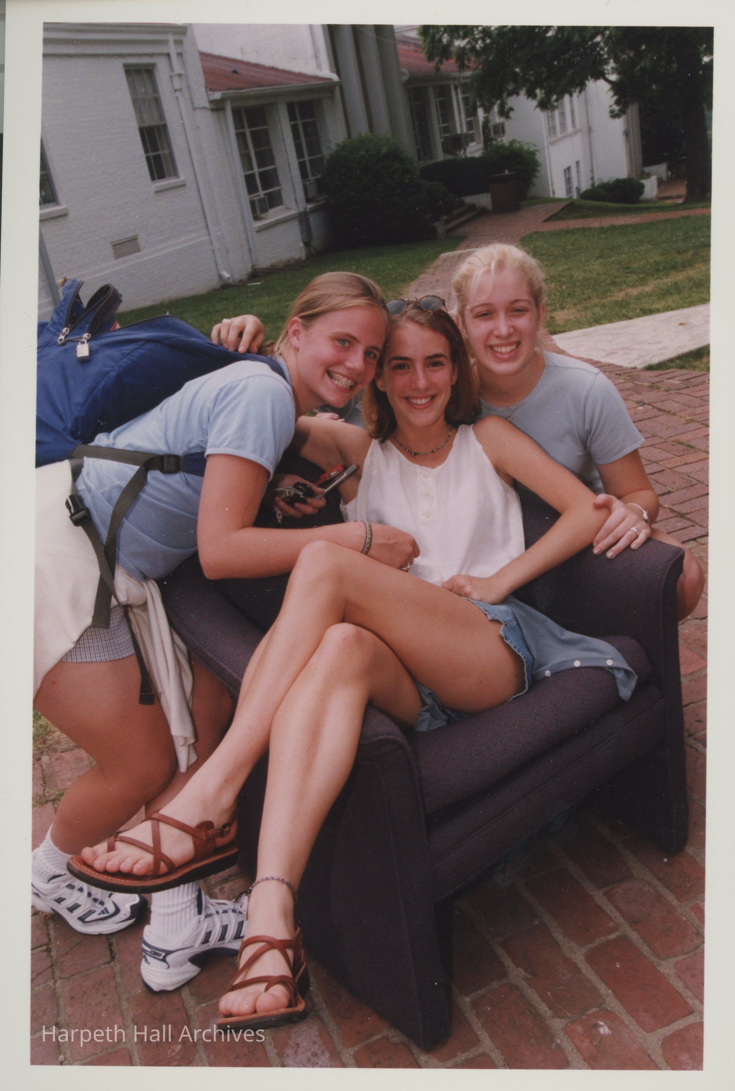 Three students from the class of 1999 with a chair on a courtyard. Susan Clark on the left. Payton Waggoner on the right.