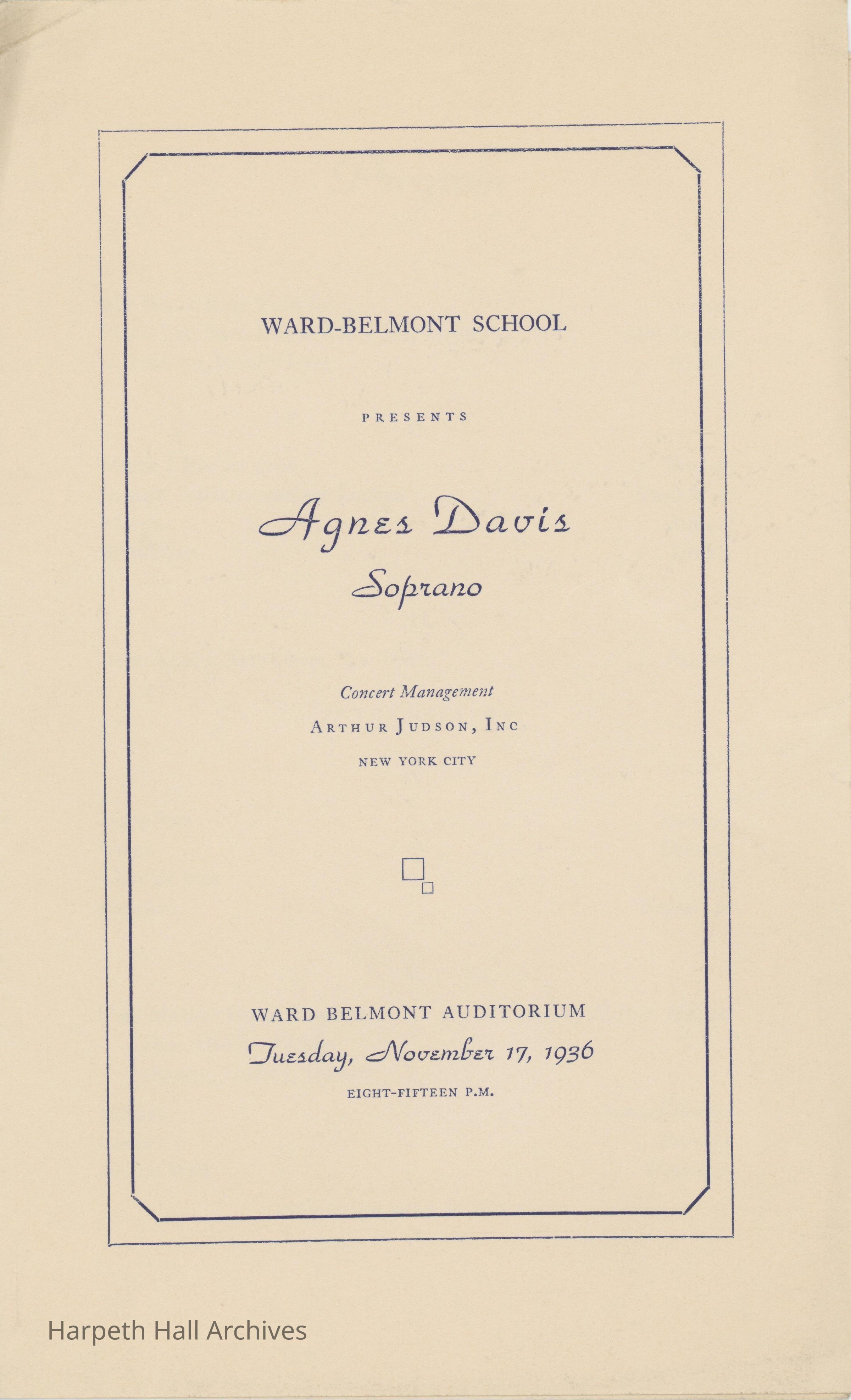 The program for the Agnes Davis Soprano Concert on November 17th, 1936. The concert was presented by the Ward-Belmont Conservatory of Music.Collection