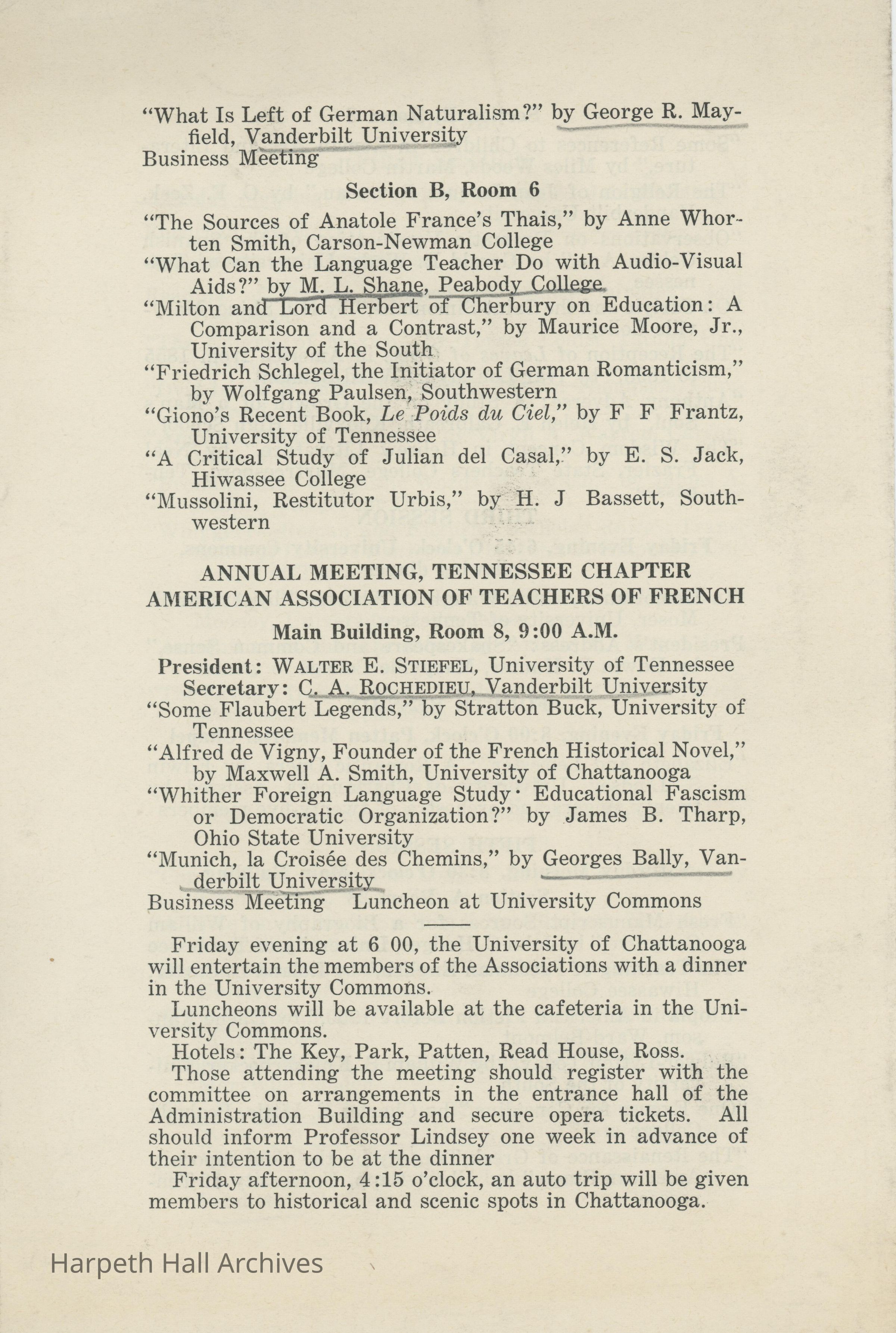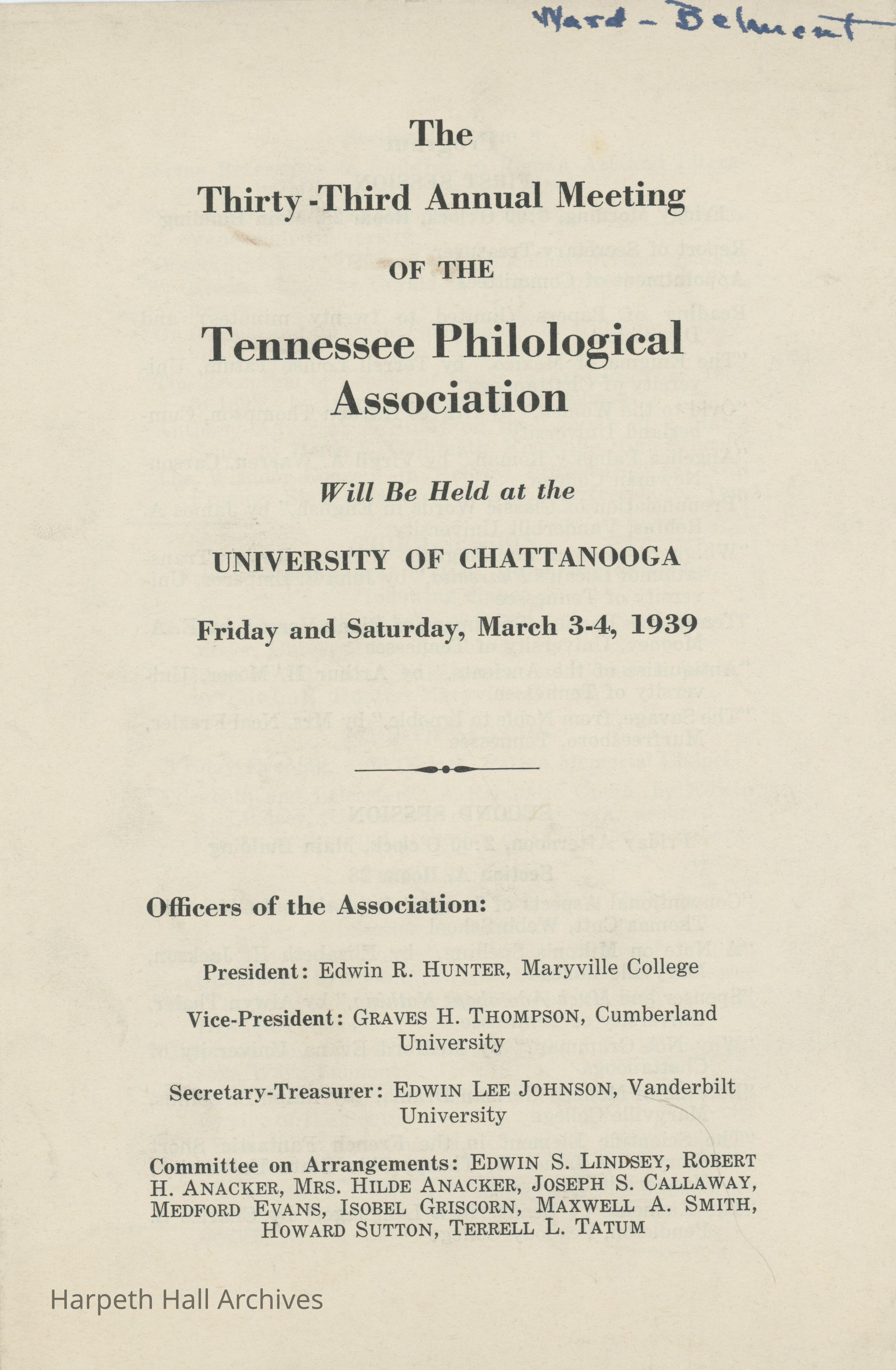 An announcement of the Tennessee Philological Association meeting held on March 3rd and 4th of 1939 at the University of Chattanooga.Collection
