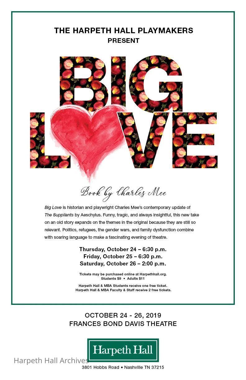 The playbill for the showing of Big Love put on by the Harpeth Hall Playmakers in October of 2019.