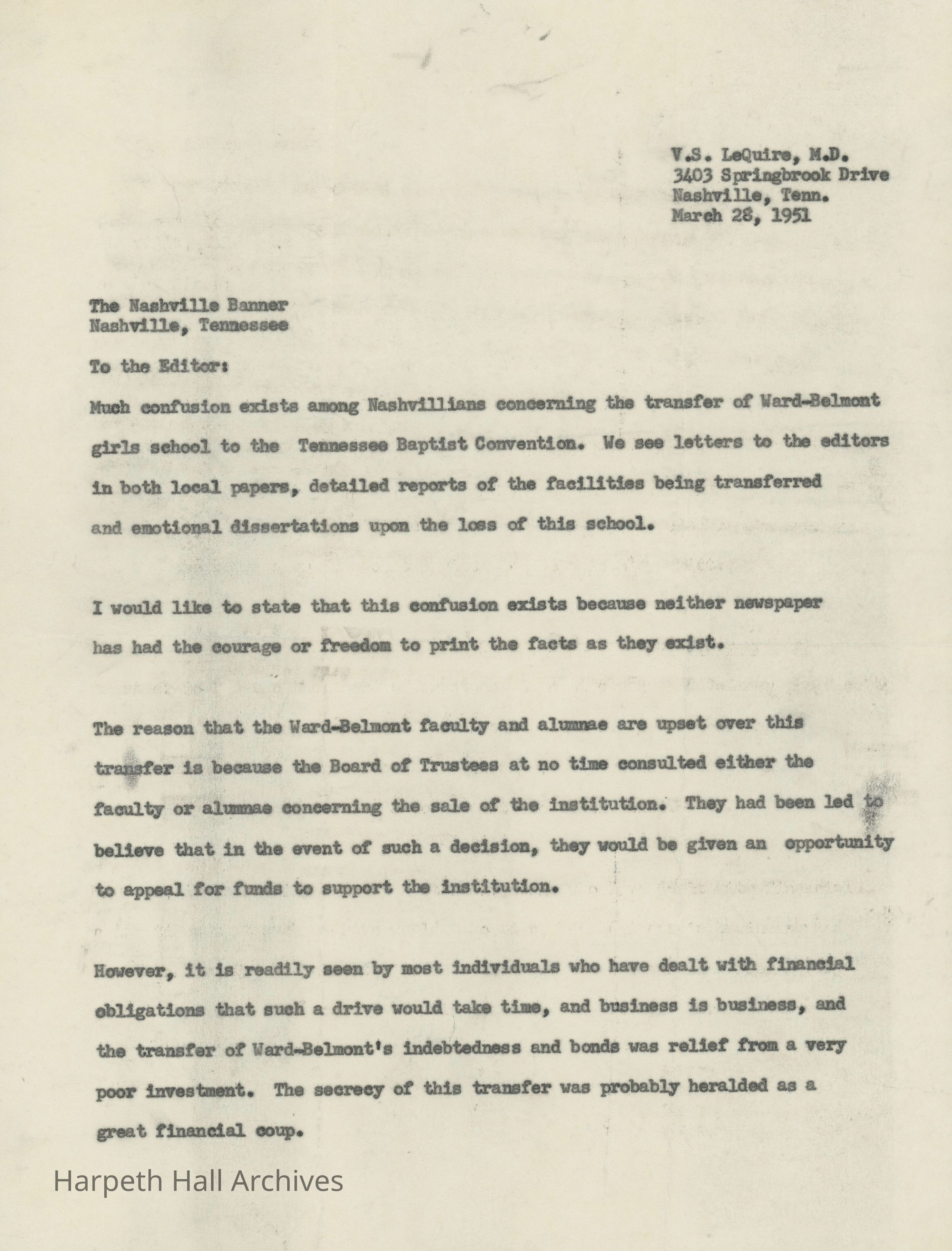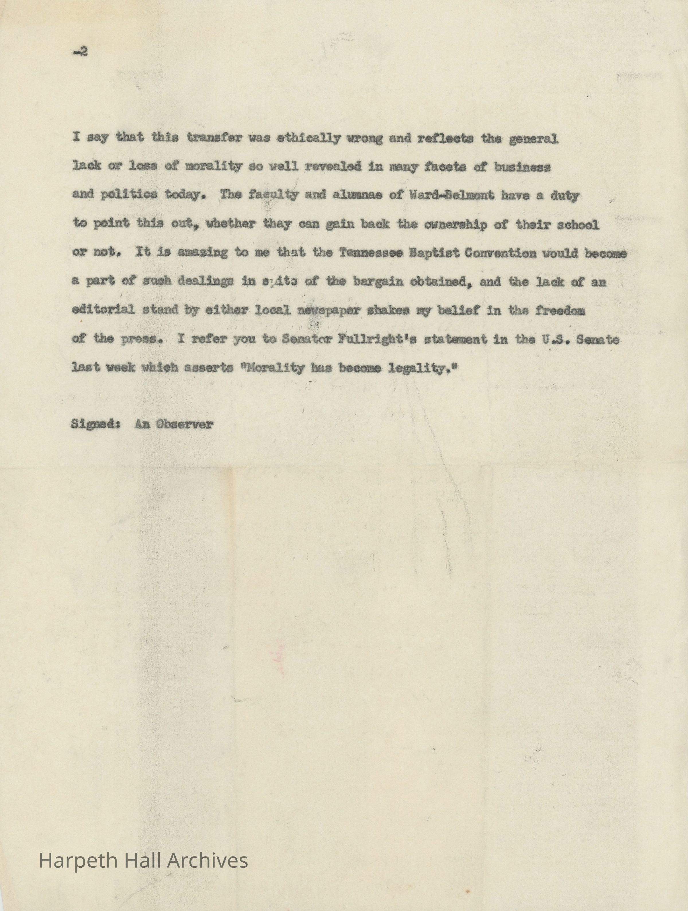 Letter to the Nashville Banner providing factual information on the Ward-Belmont transfer. It notes that lots of confusion surrounding the transfer has been circulating in the press because local newspapers have not had the courage to print the truth. The author of this letter strongly rejects the idea of the transfer, saying it is "ethically wrong" and that the Ward-Belmont community has a responsibility to identify this moral shortcoming.Collection