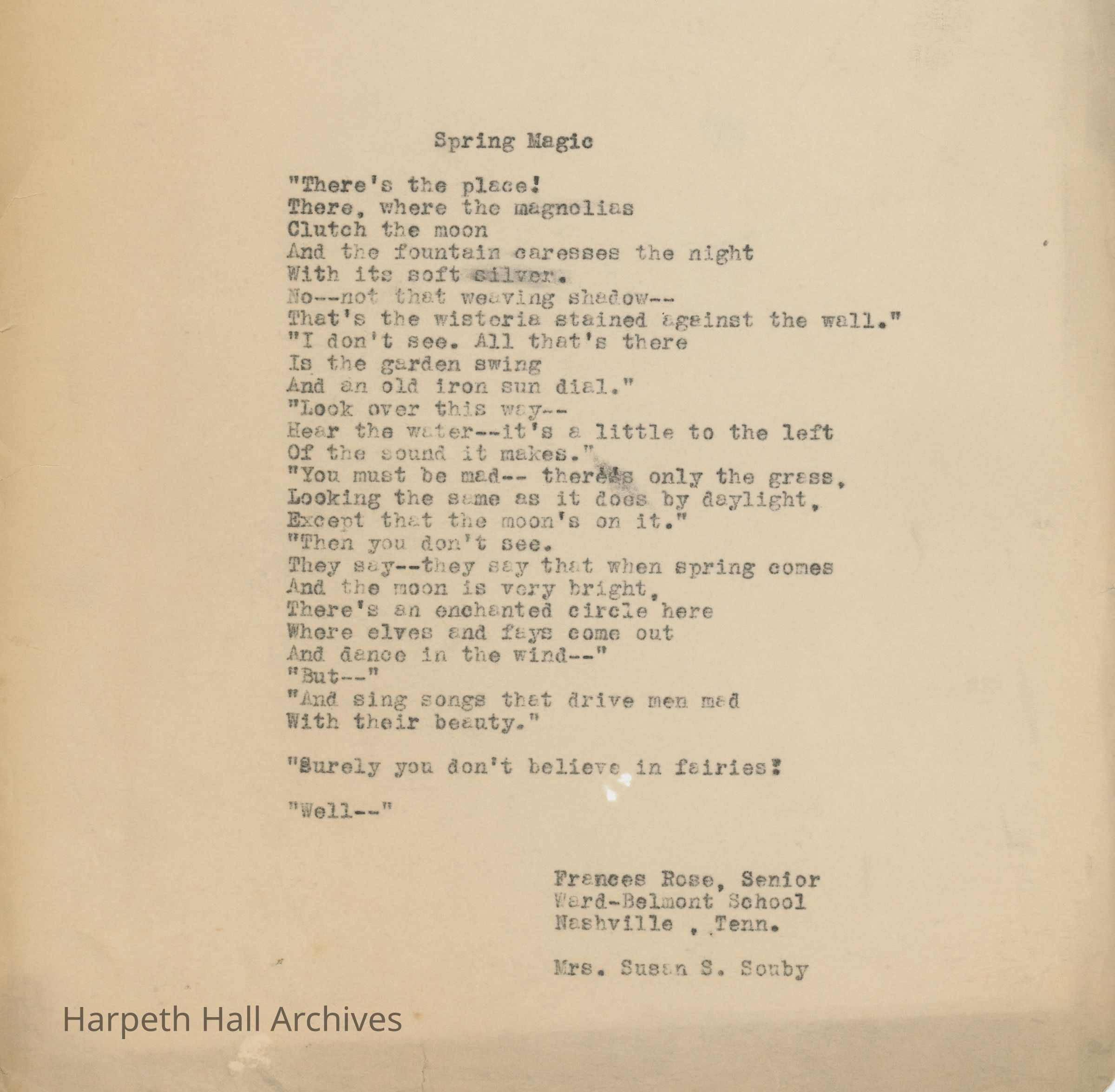 A poem entitled, "Spring Magic" written by Ward-Belmont Senior Frances Rose.