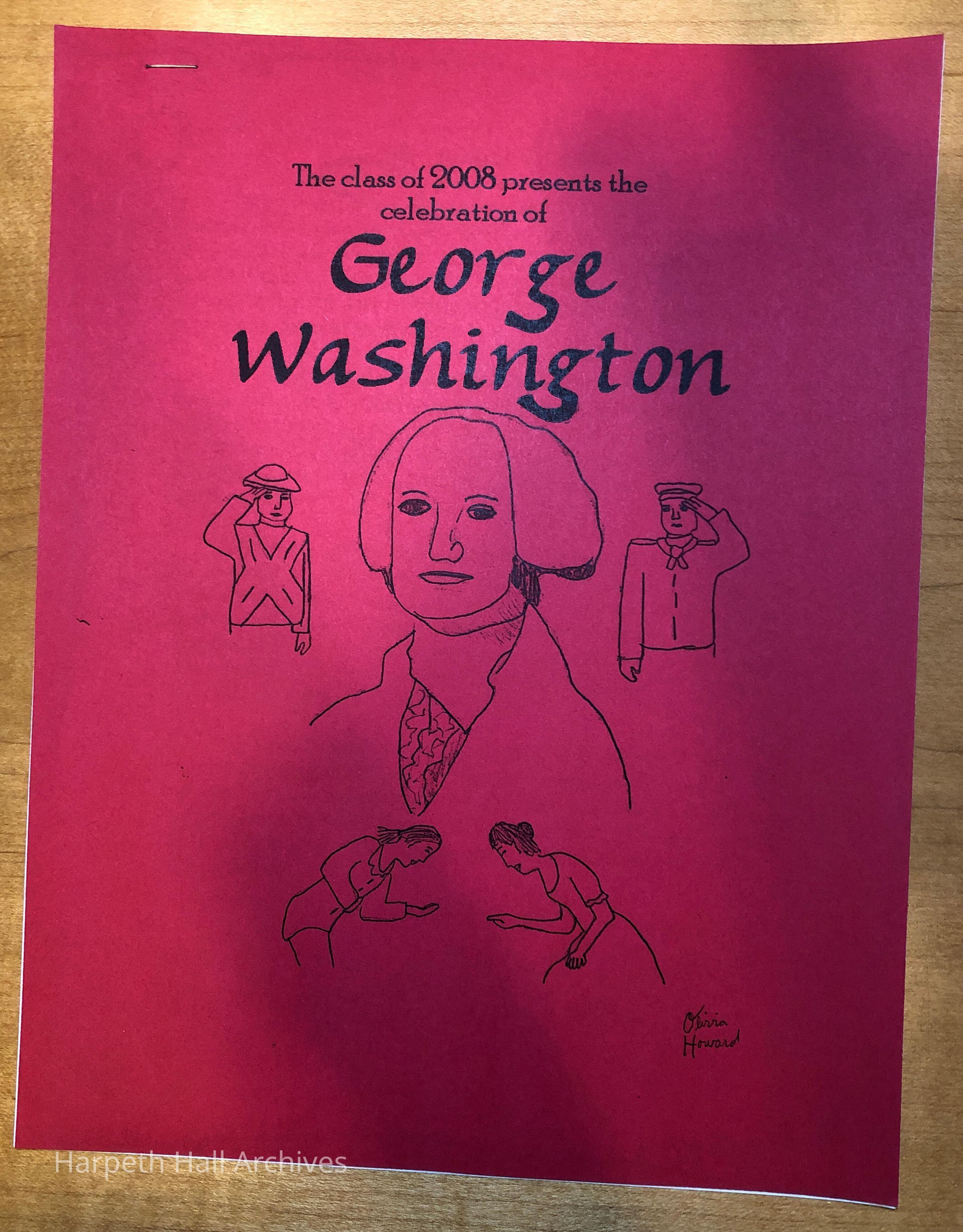 The 2003 program for the George Washington Day Celebration put on by the class of 2008 when they were in the seventh grade. The celebration was dedicated to recent heroes of the Space Shuttle Columbia. George Washington was played by eighth grader Mary "English" Taylor (2007) and Martha Washington was played by eighth grader Annie Kate Brown (2007). Front cover design by Olivia Howard (2008).Context