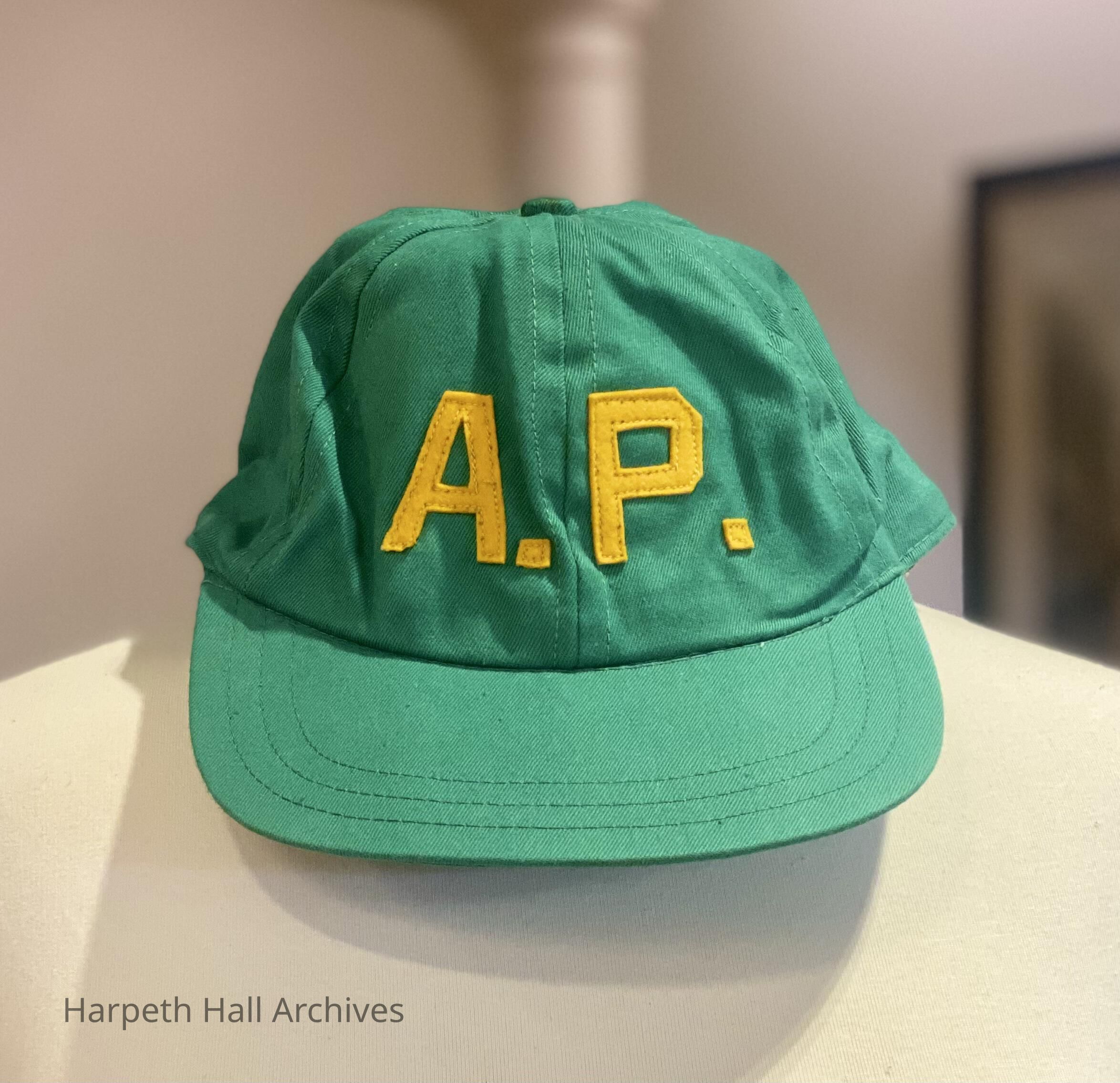 A green baseball cap-style hat with the letters A.P. sewn on in yellow.Context