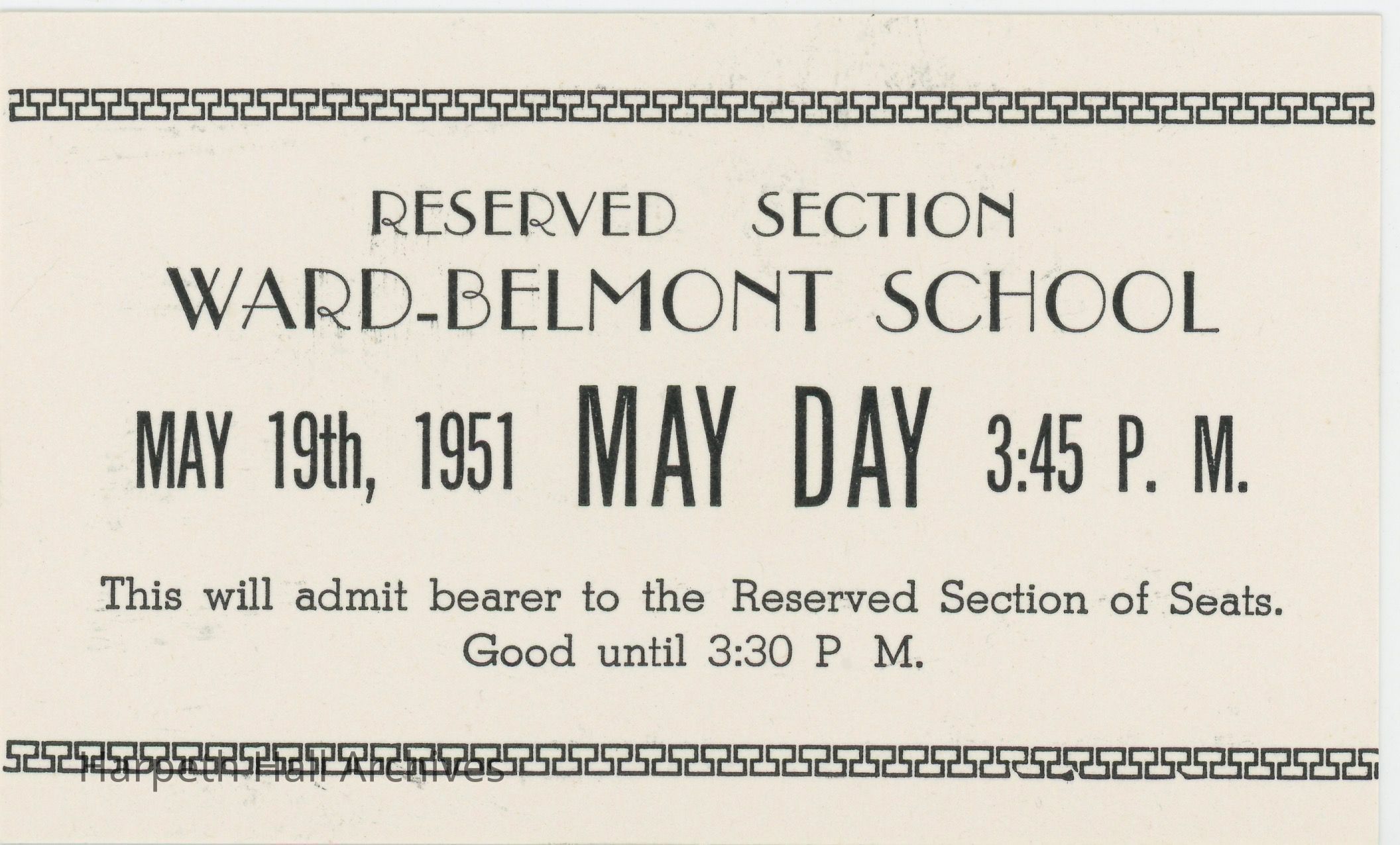 Ticket to Ward-Belmont's May Day Celebration on May 19, 1951.