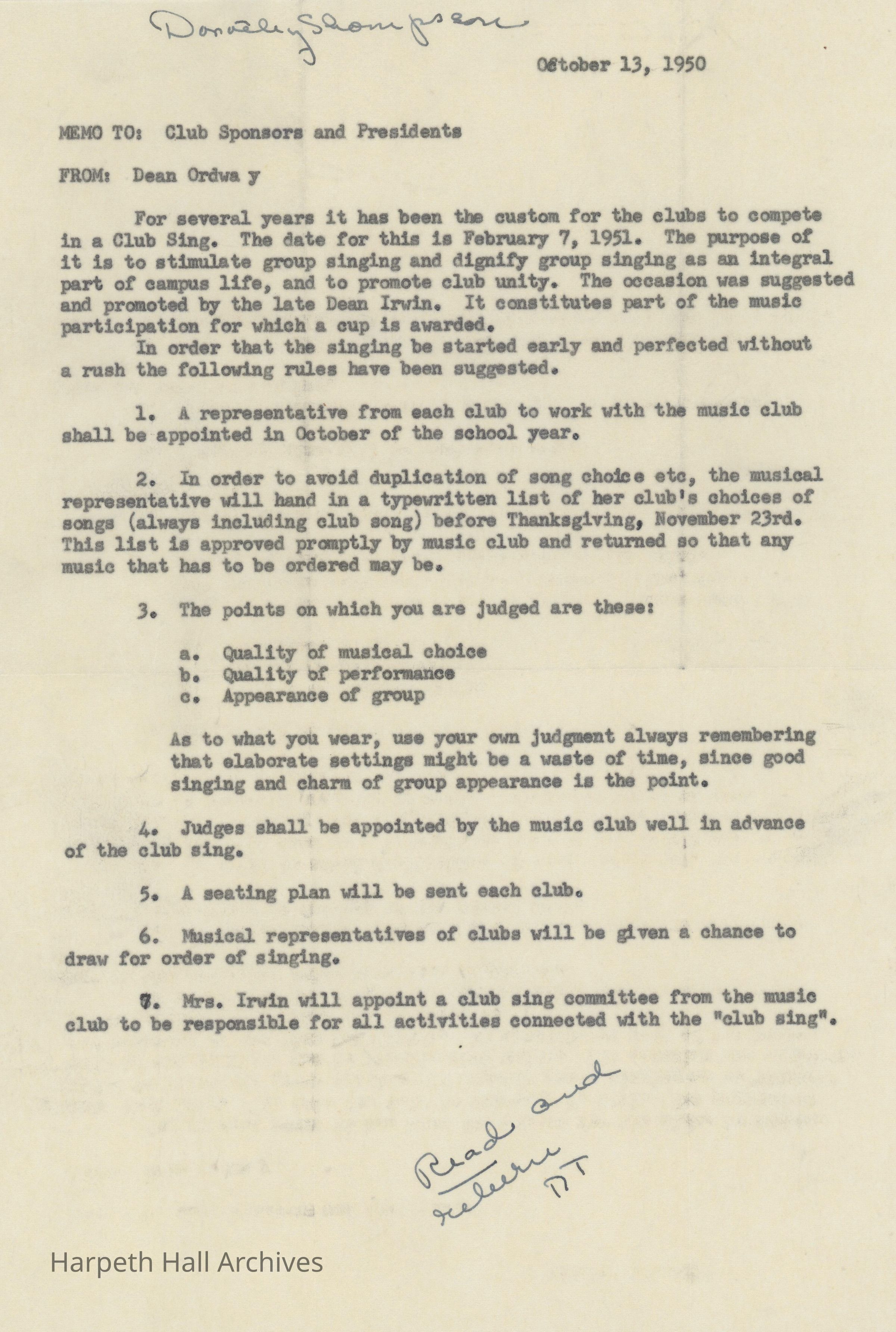 A memo from Dean Ordway to the club sponsors and presidents about participating in Club Sing on October 13th, 1950.Collection