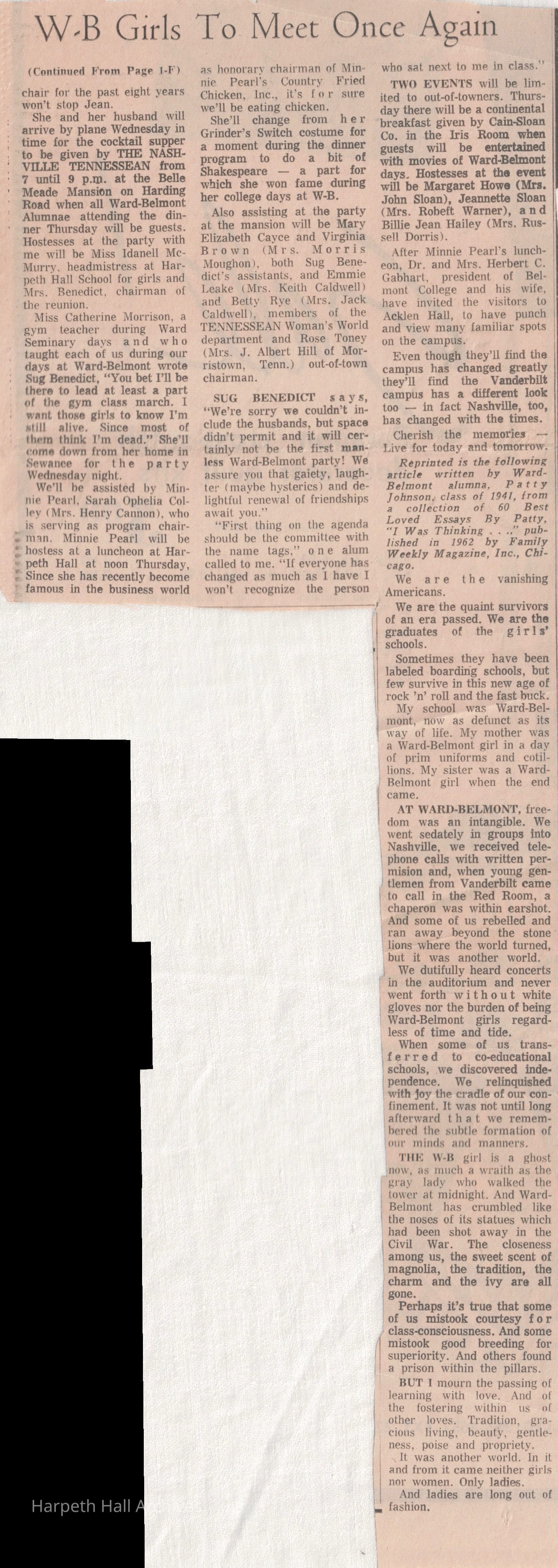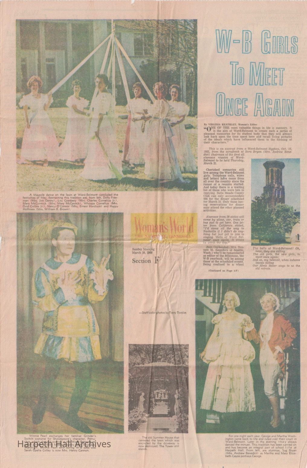 Newspaper article preceding the March 21, 1968 reunion of Ward-Belmont alumnae, faculty, and staff. Includes photos of reenactments of W-B traditions and photos from Harpeth Hall.Collection