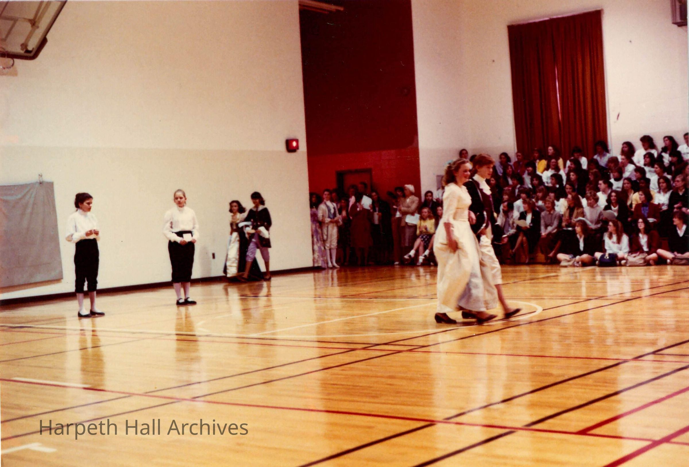 Two students dressed as a lady and a gentleman entering as the Pages introduce them during the George Washington Day Celebration. The photo is taken in Morrison Gym in the McMurry Center.Context