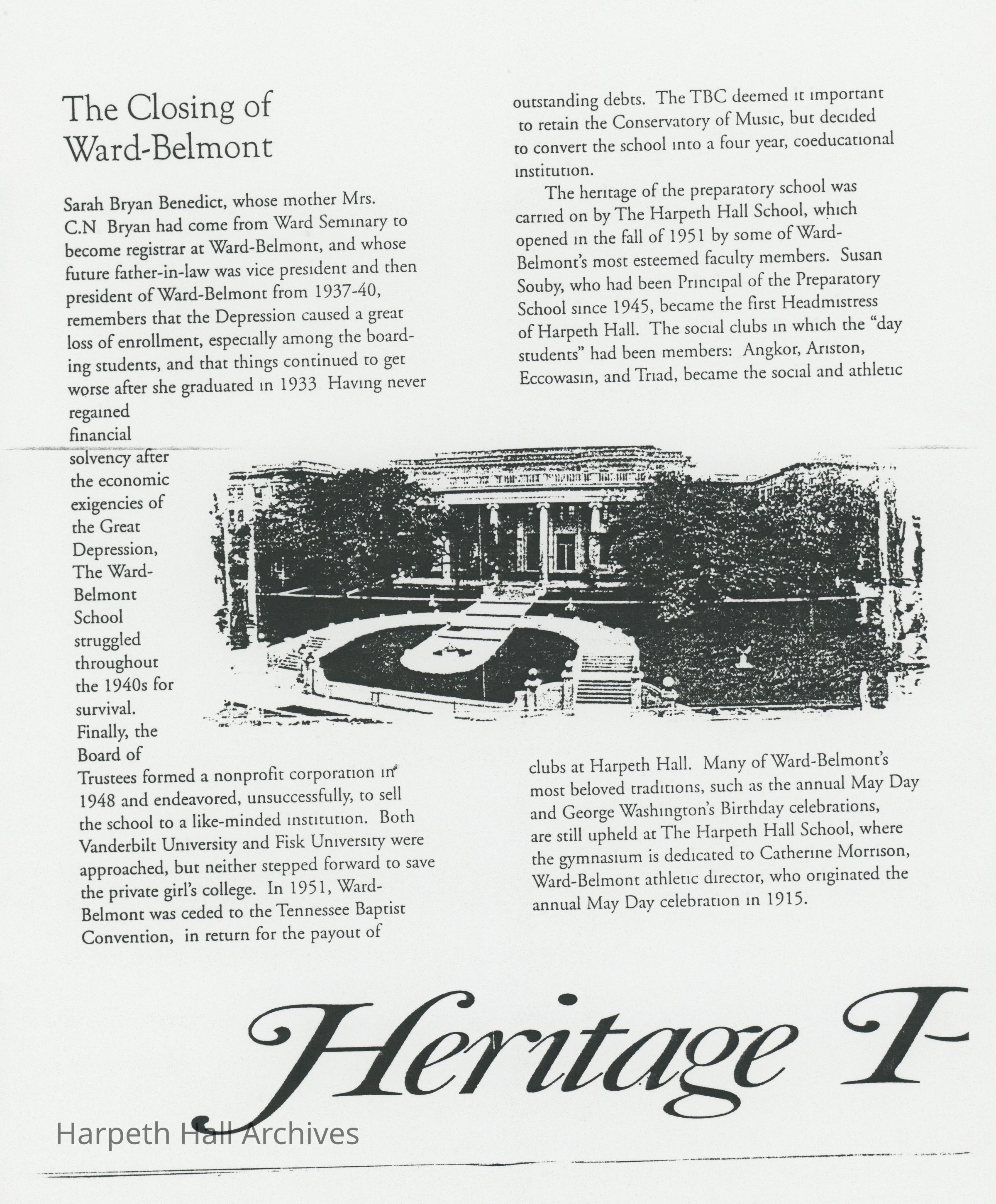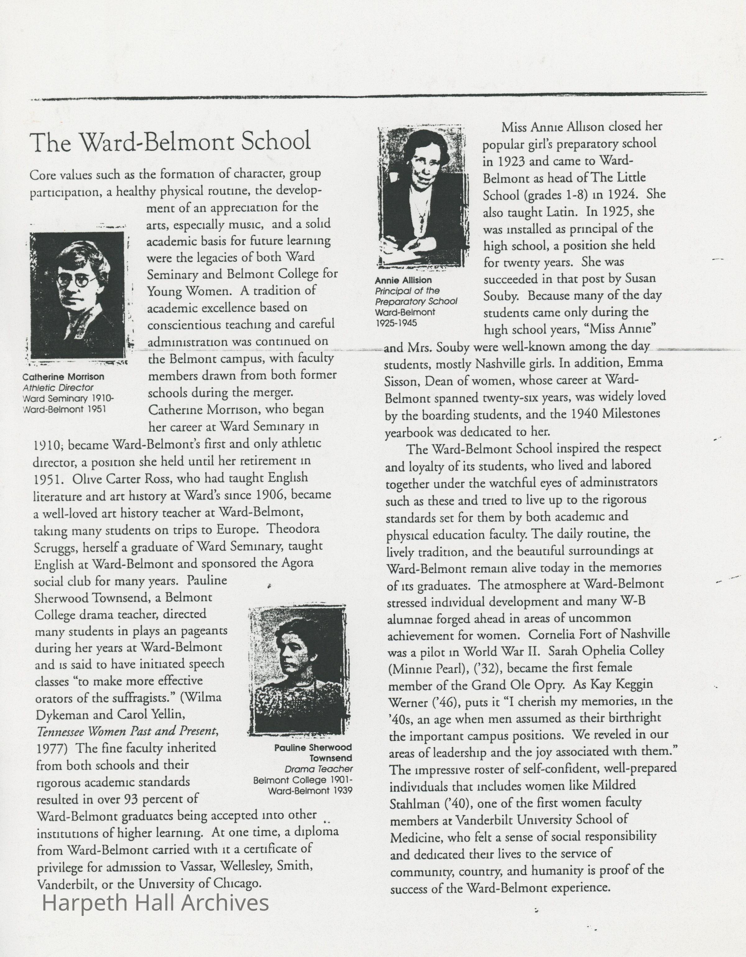 These articles discuss the importance of Ward-Belmont for those who attended. It highlight what the school hoped students would get out of their WB education. The final article talks about the closing of Ward-Belmont and the opening of Harpeth Hall. Unknown year.Collection