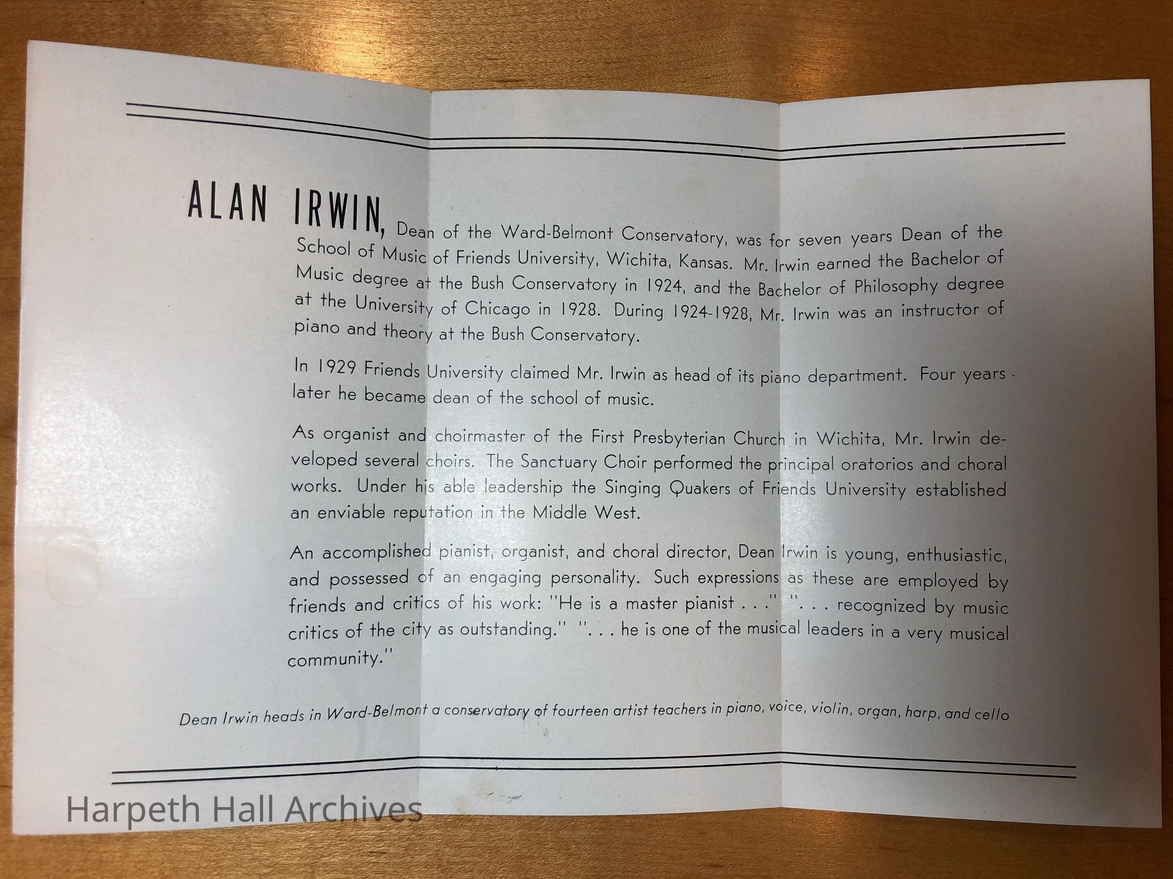 A bulletin for Alan Irwin, dean of Ward-Belmont conservatory, performanceCollection